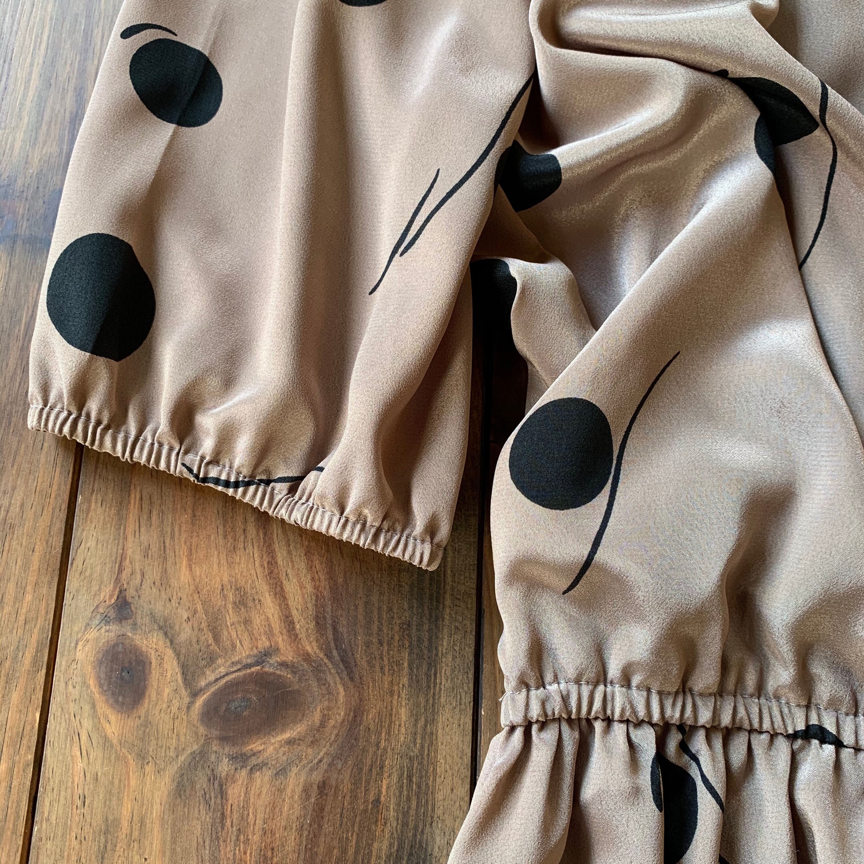 ポリエステル素材のベージュ地にブラックの水玉模様。
