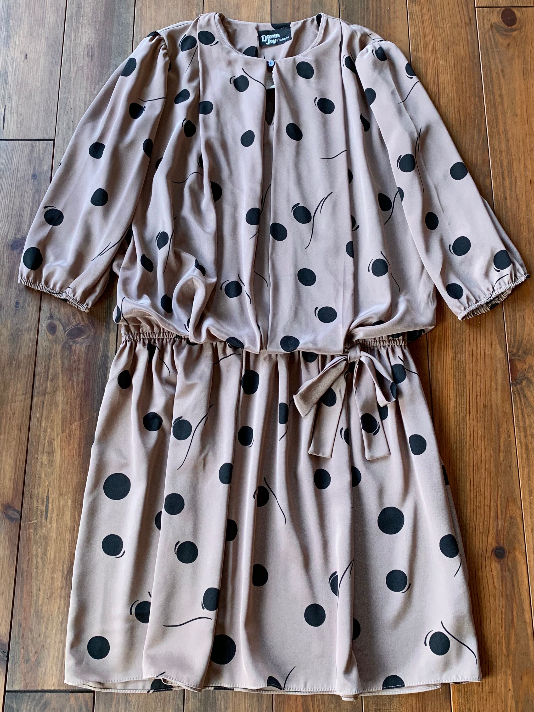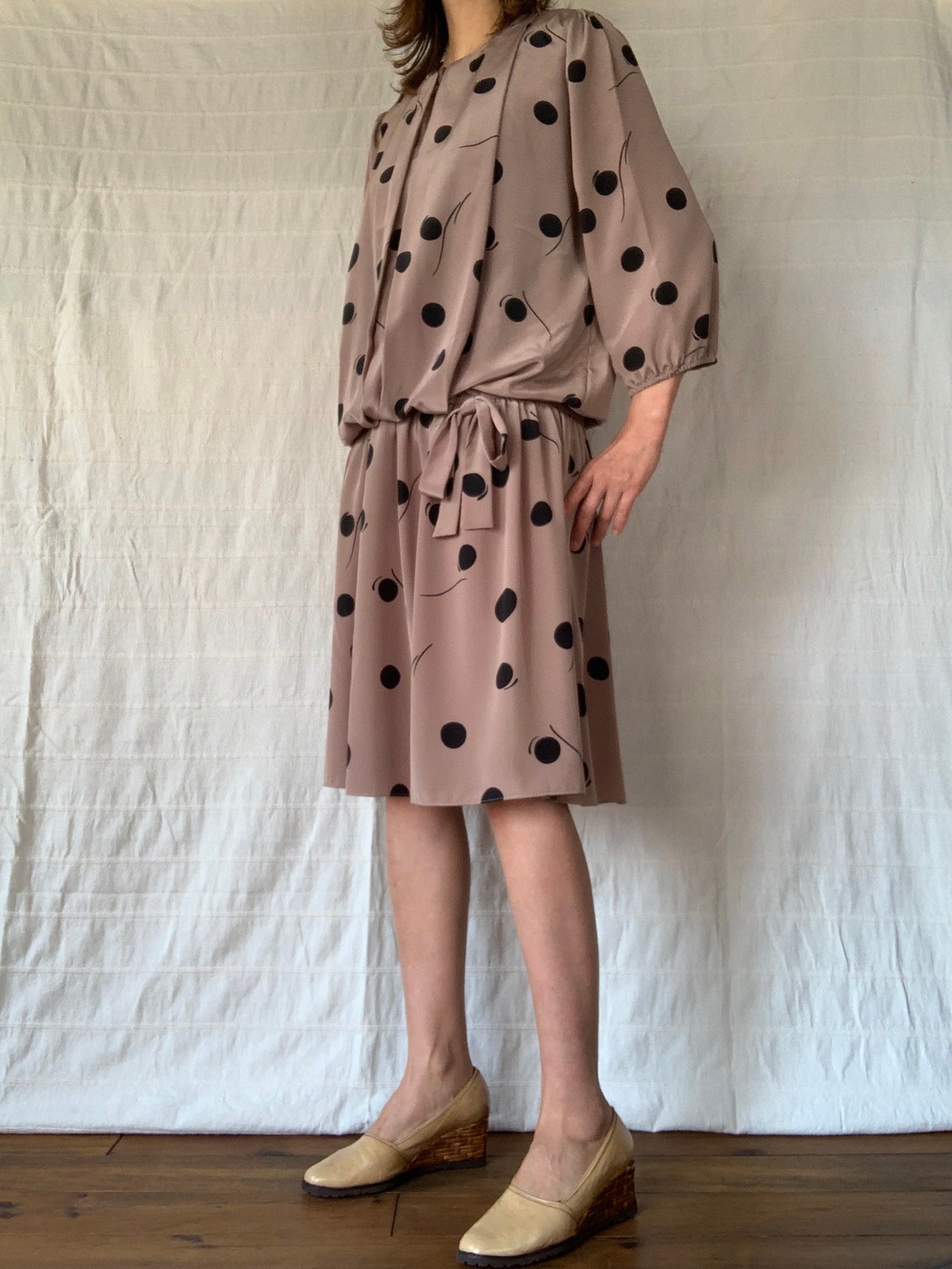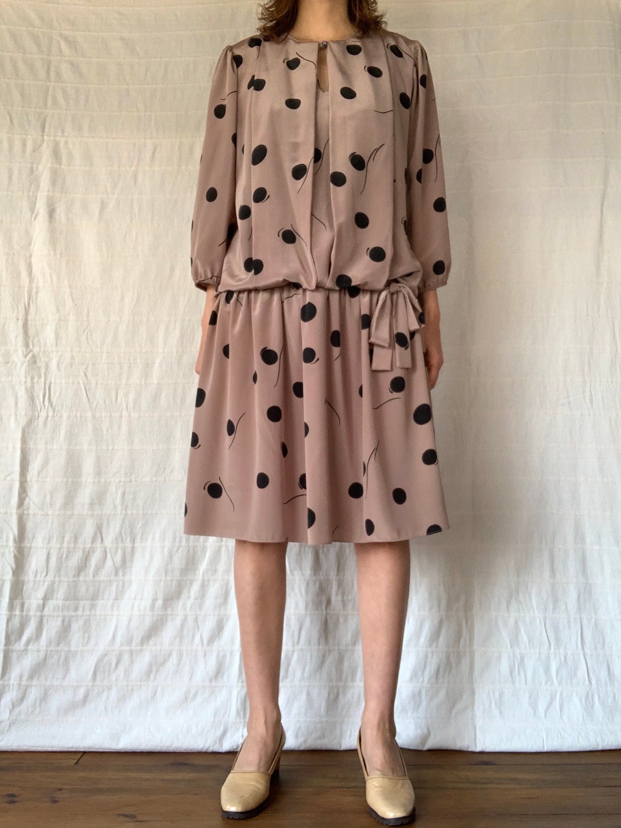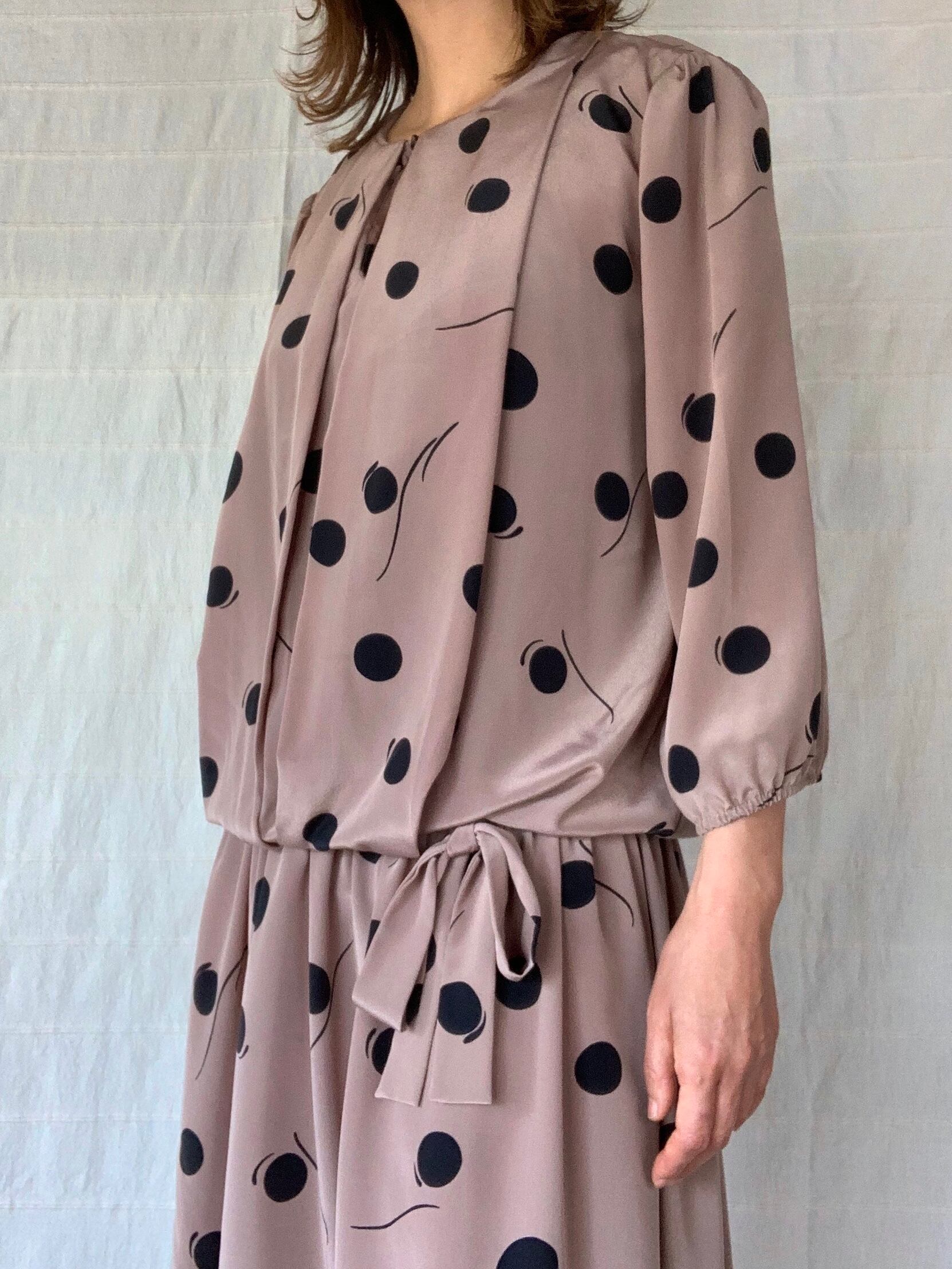 70s ワンピース BEIGE×BLACK水玉 ボウタイ付き