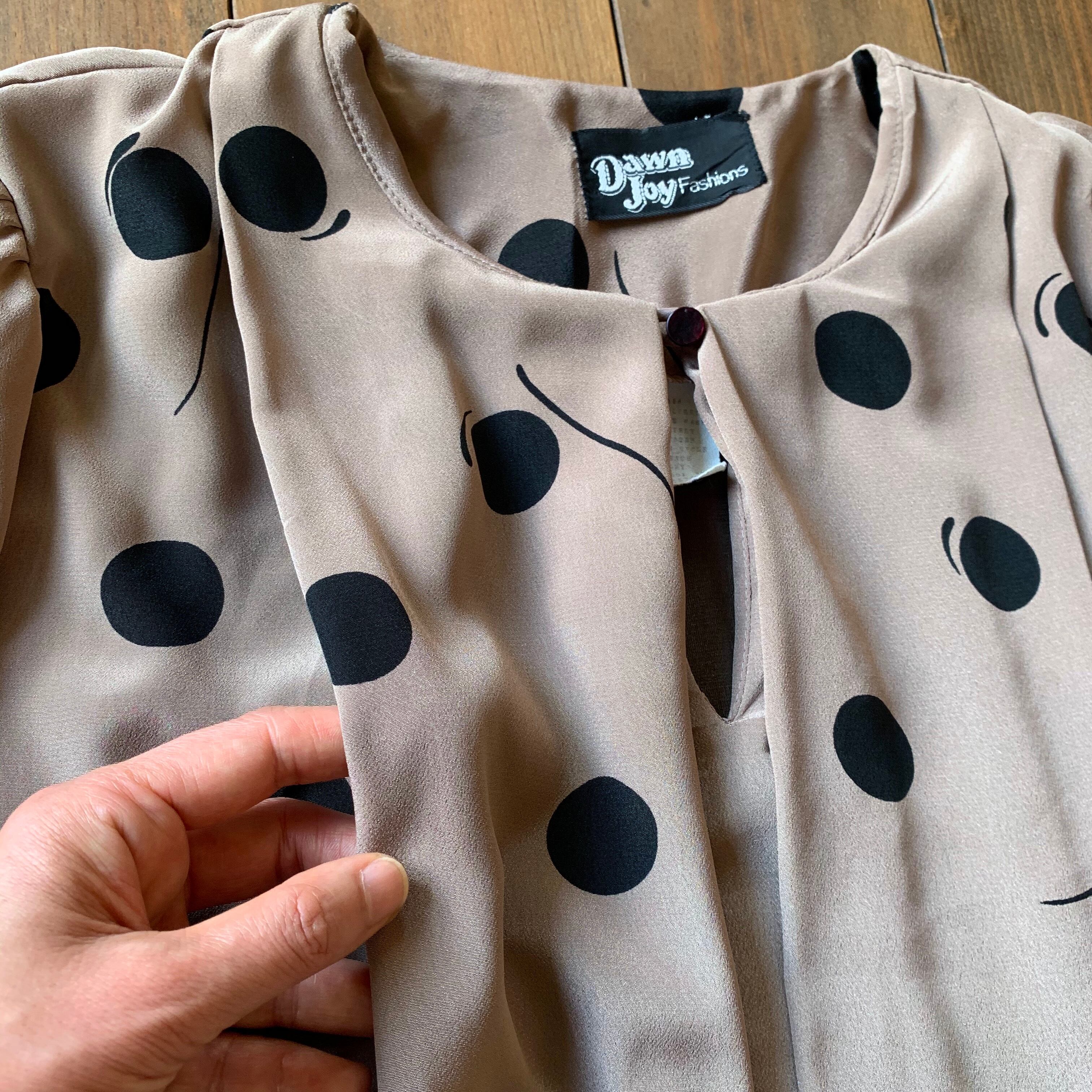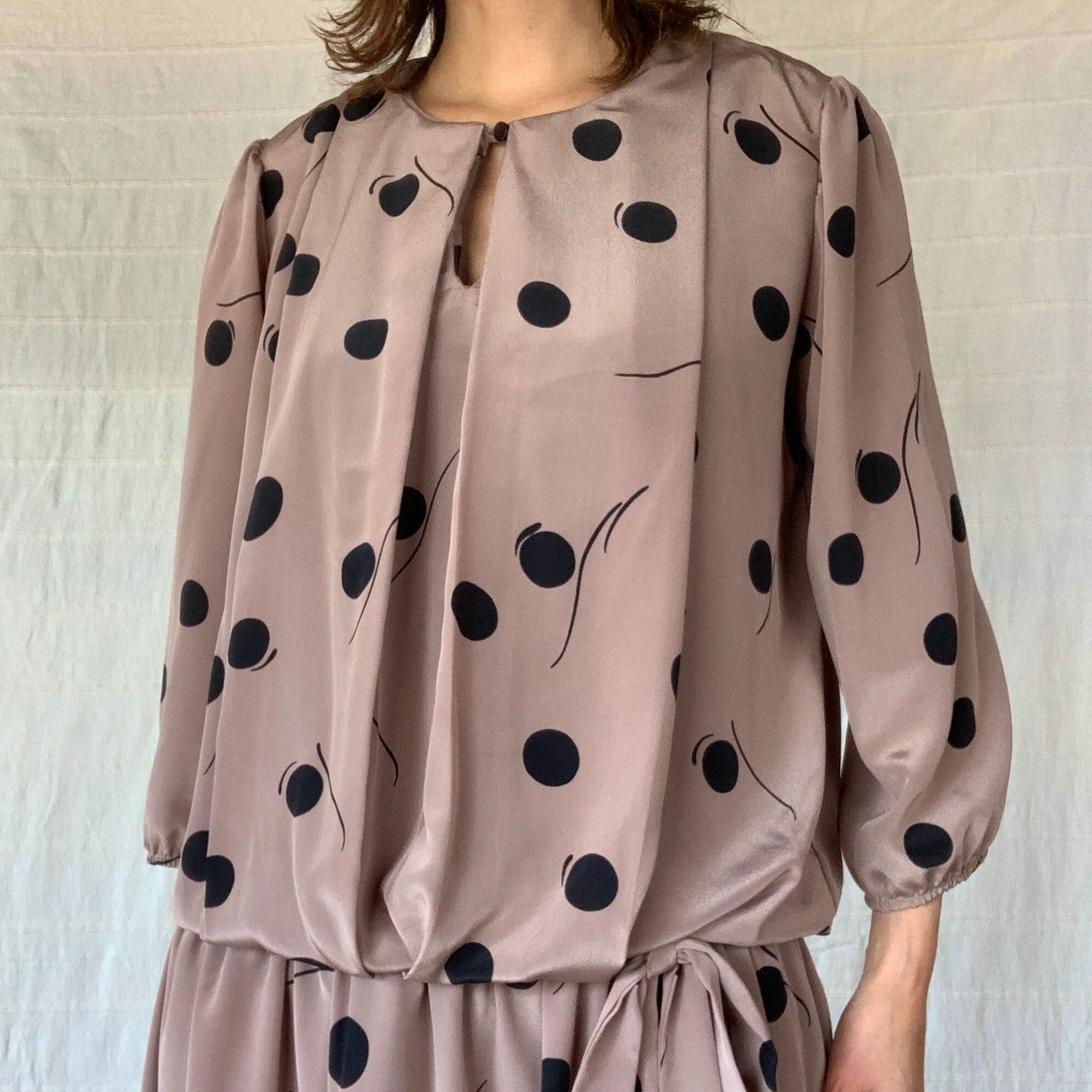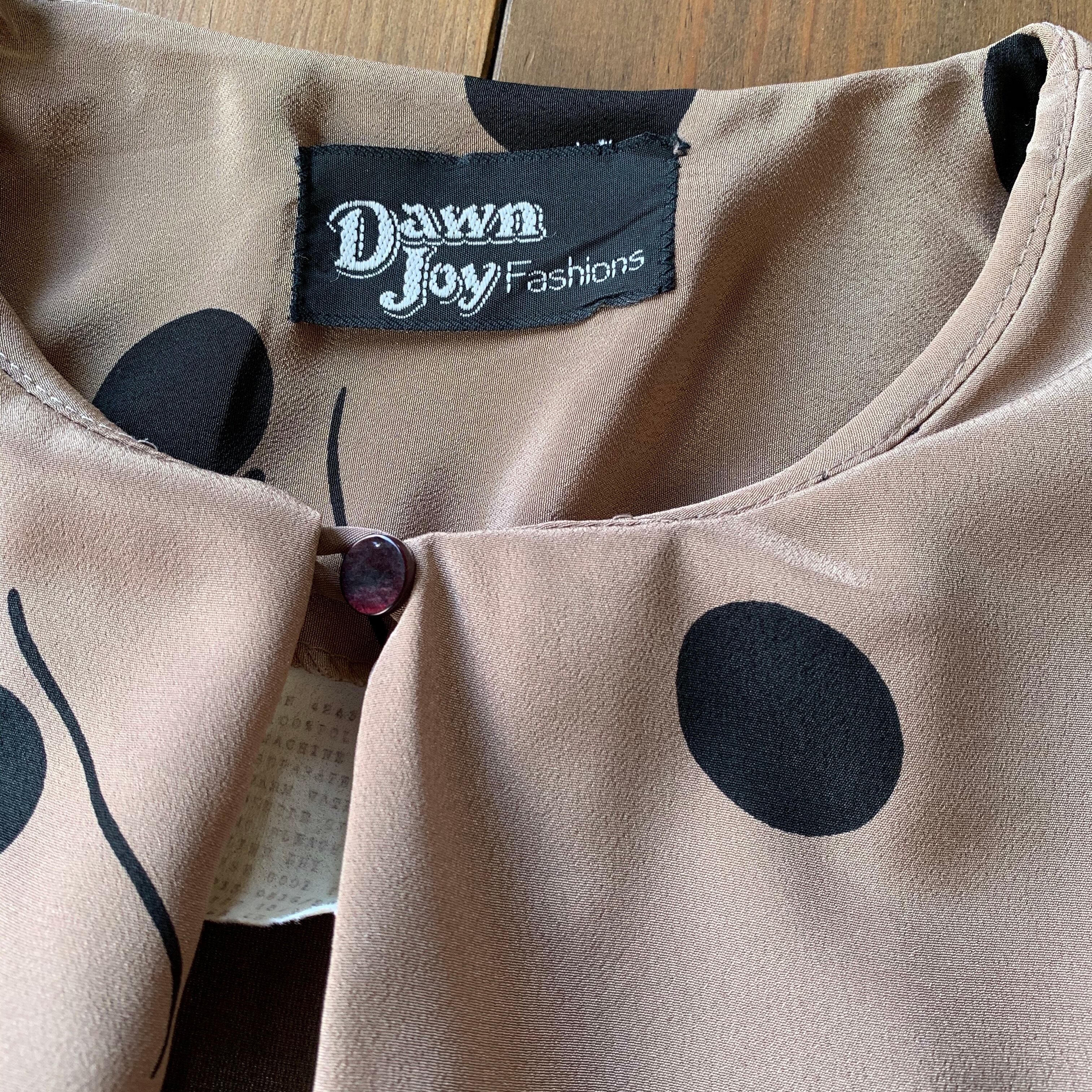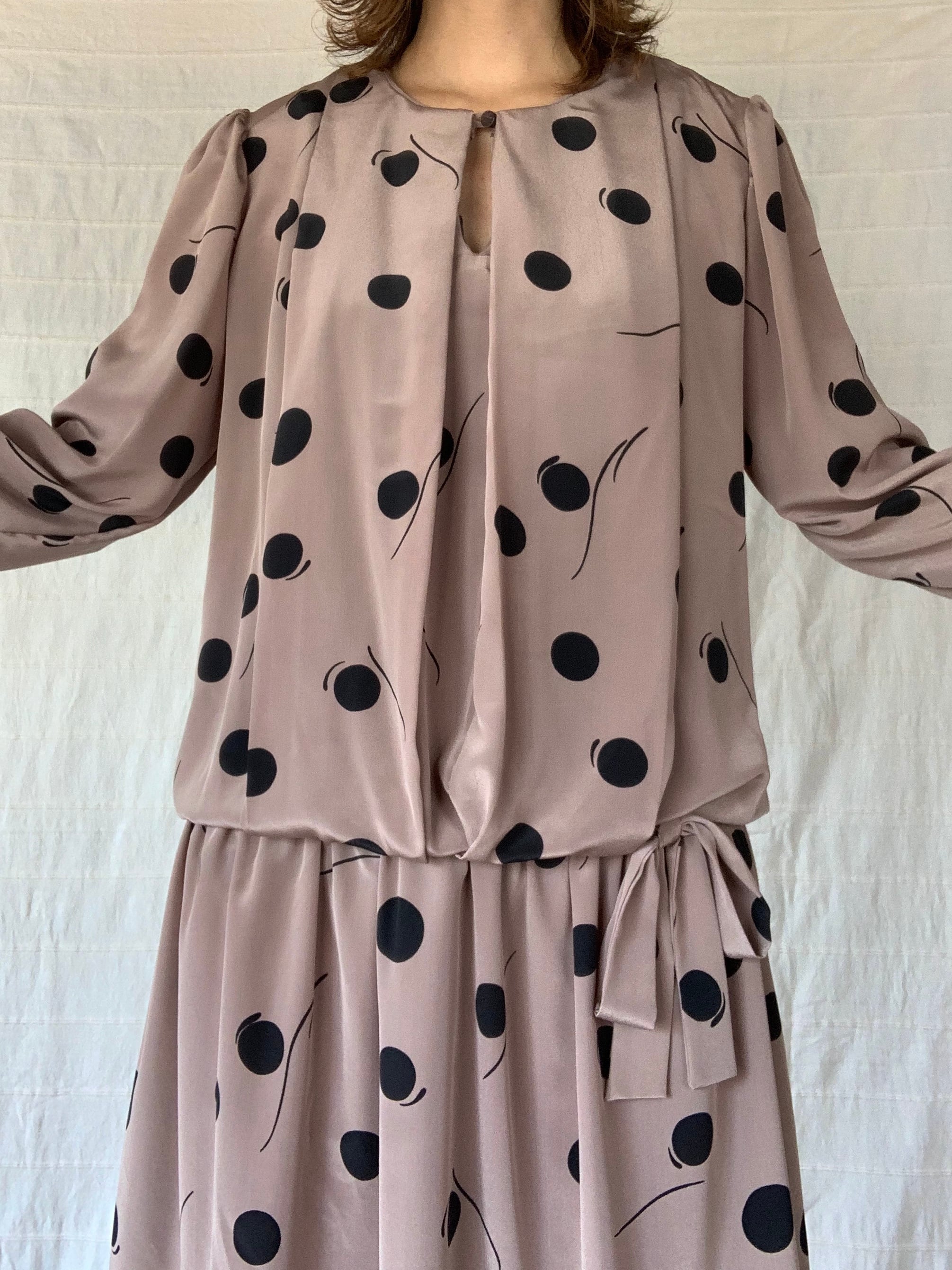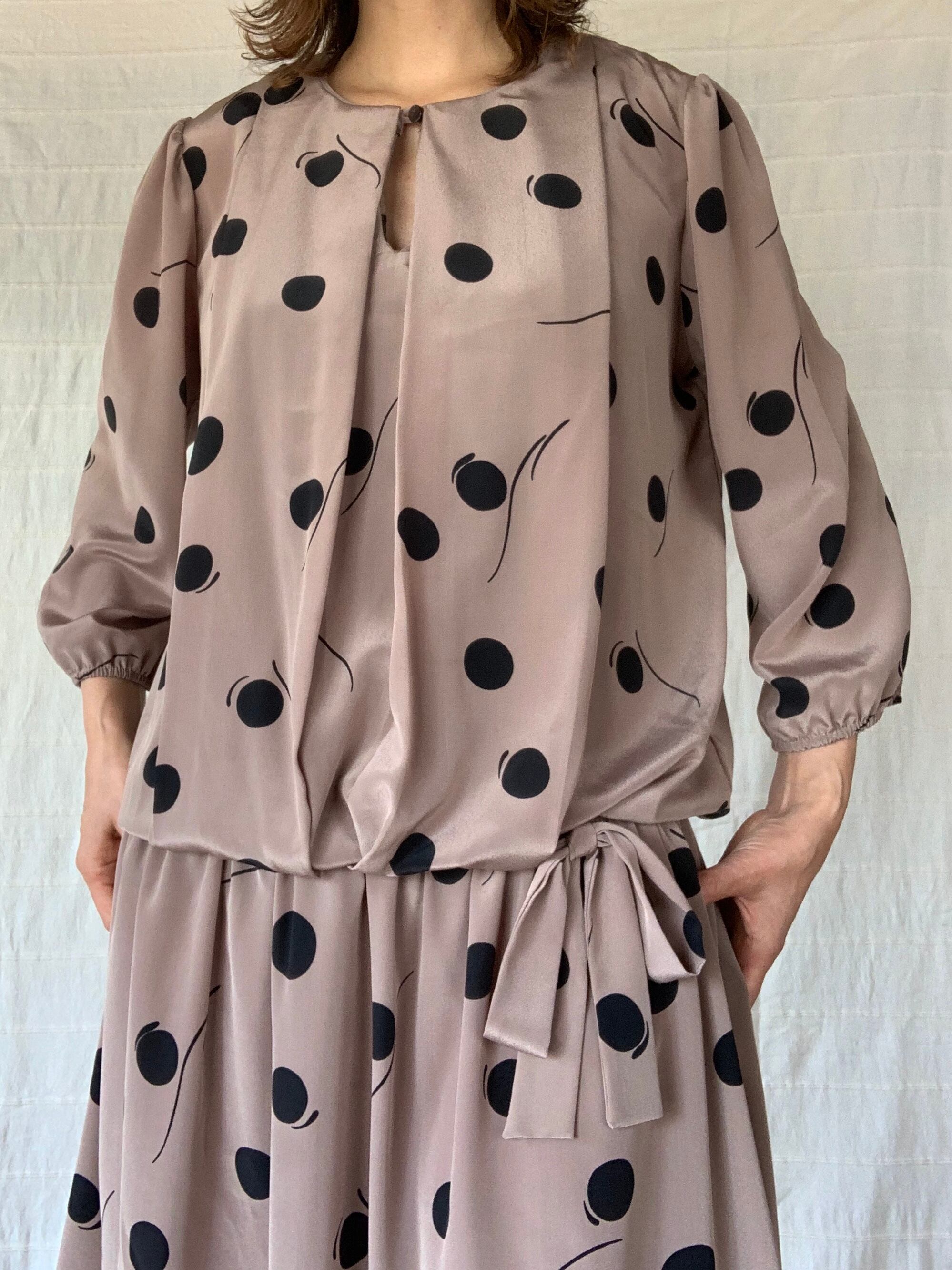 70s ワンピース BEIGE×BLACK水玉 ボウタイ付き