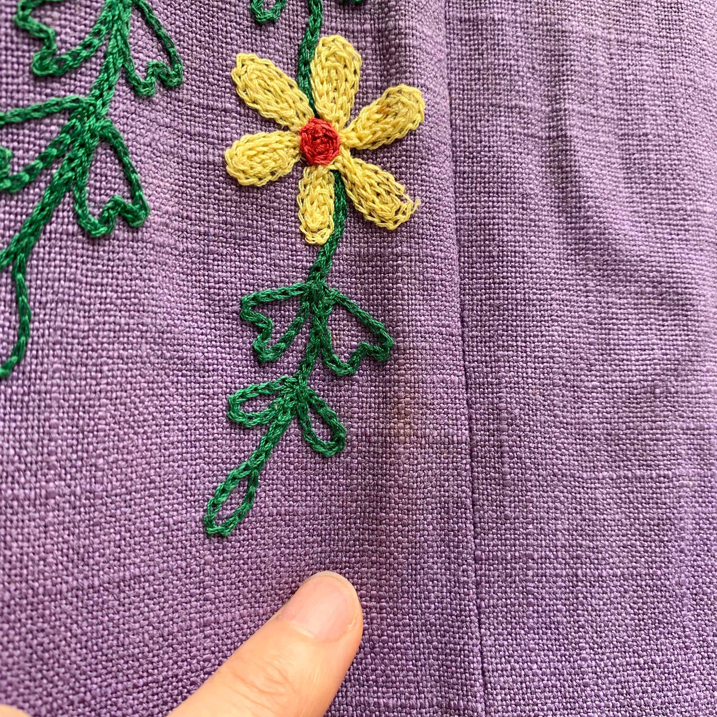 イエロー、ホワイト、グリーンで花やリボンの刺繍。