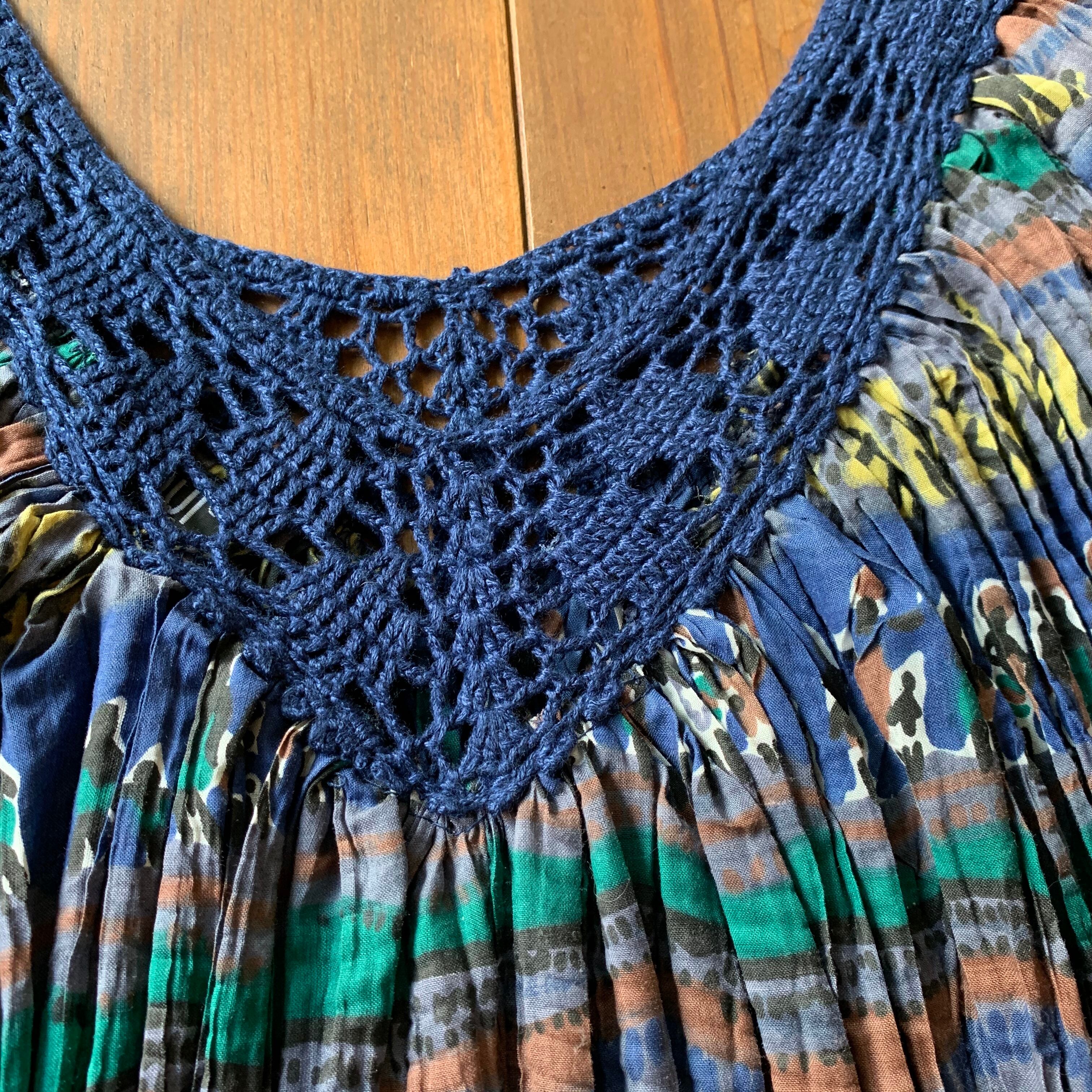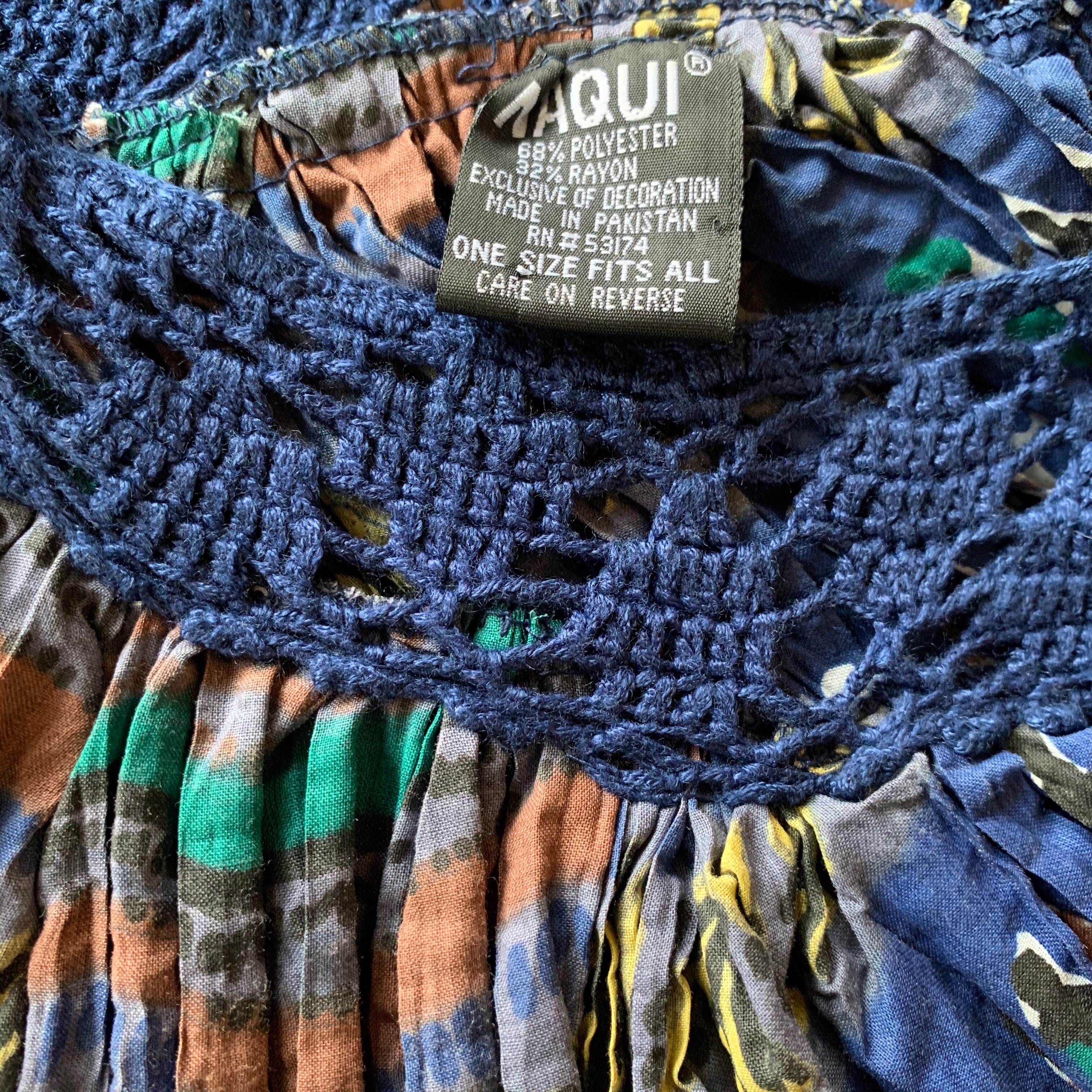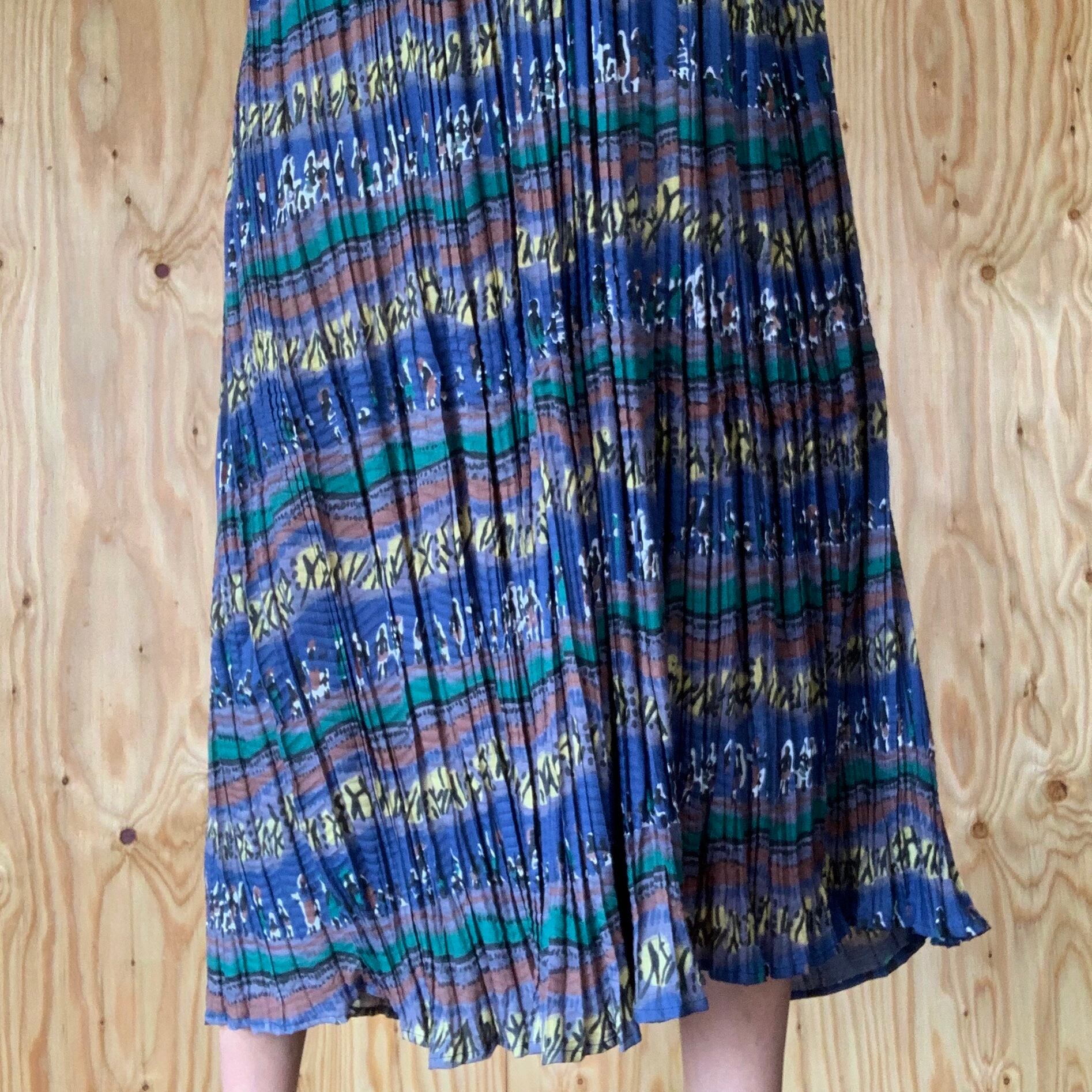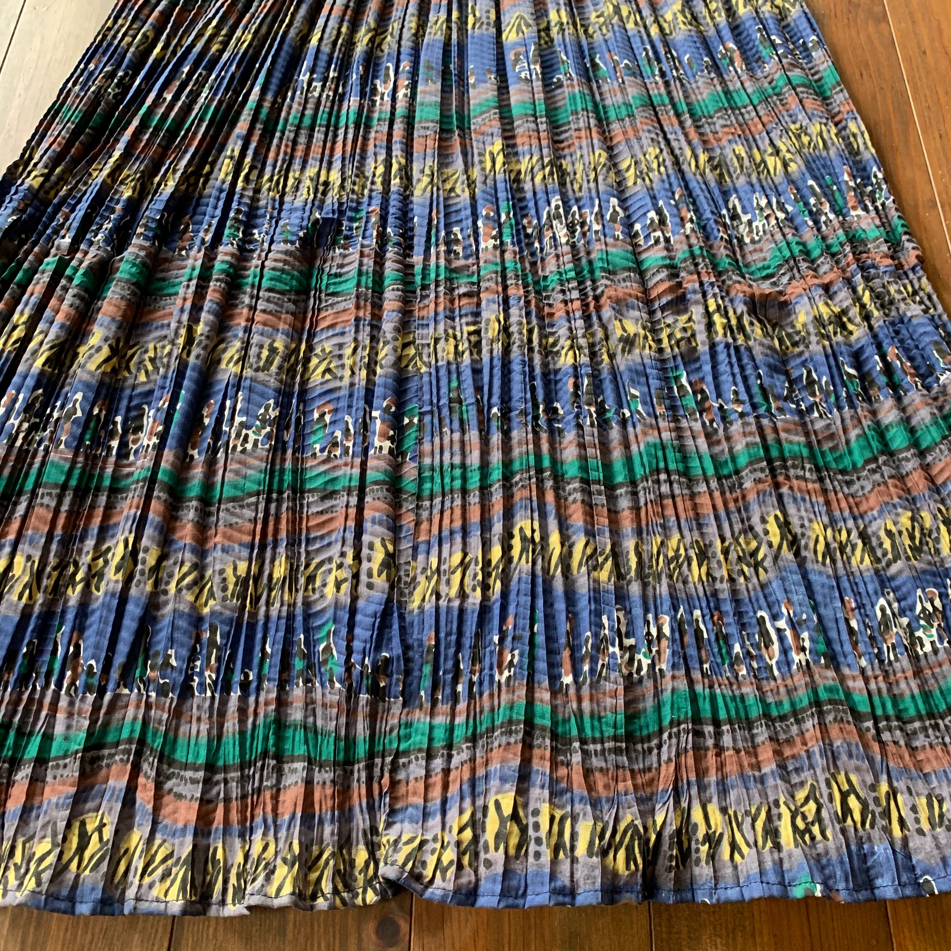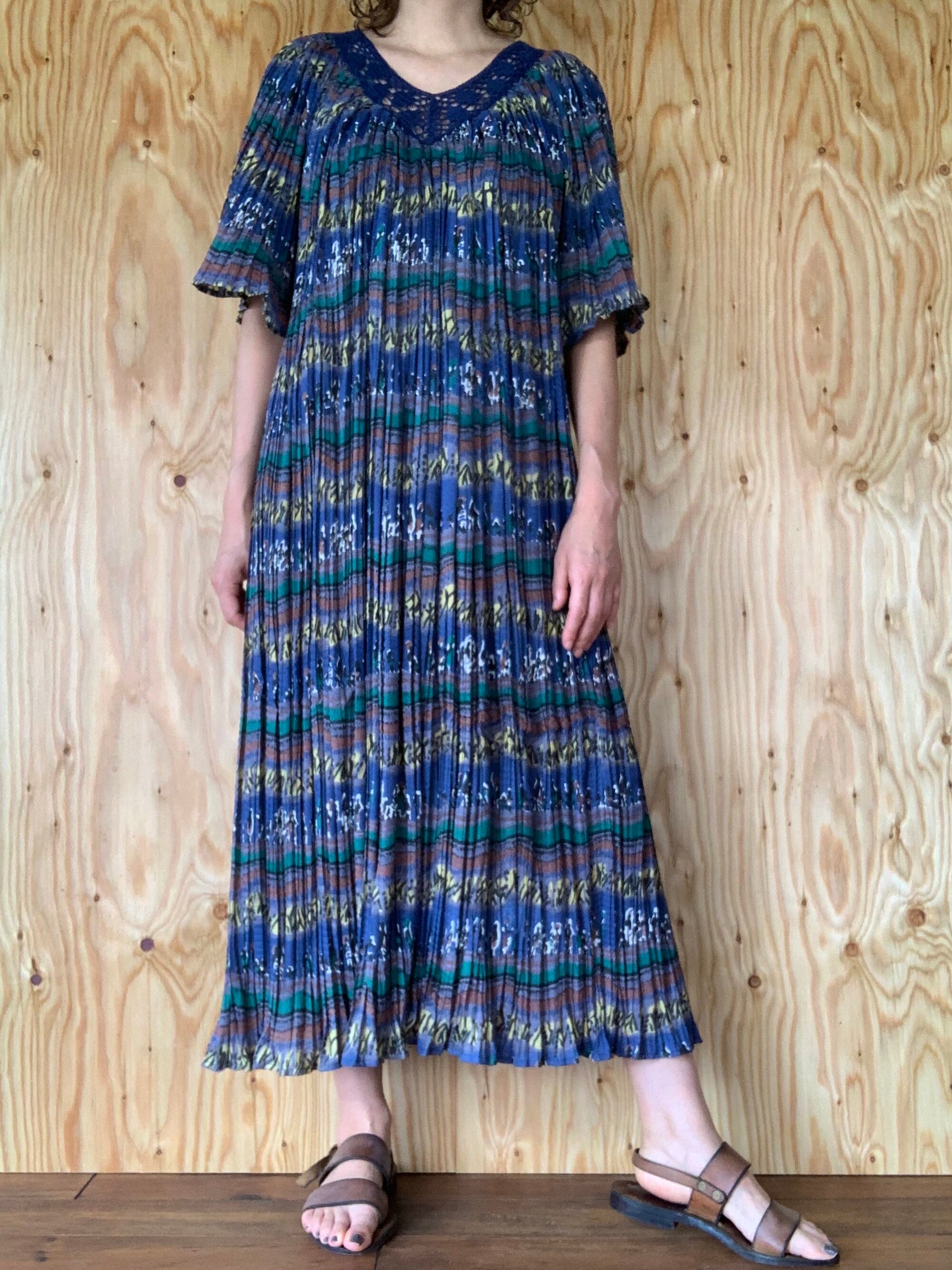 ネイビー地に、ブラウンわグリーン、イエローの総柄。