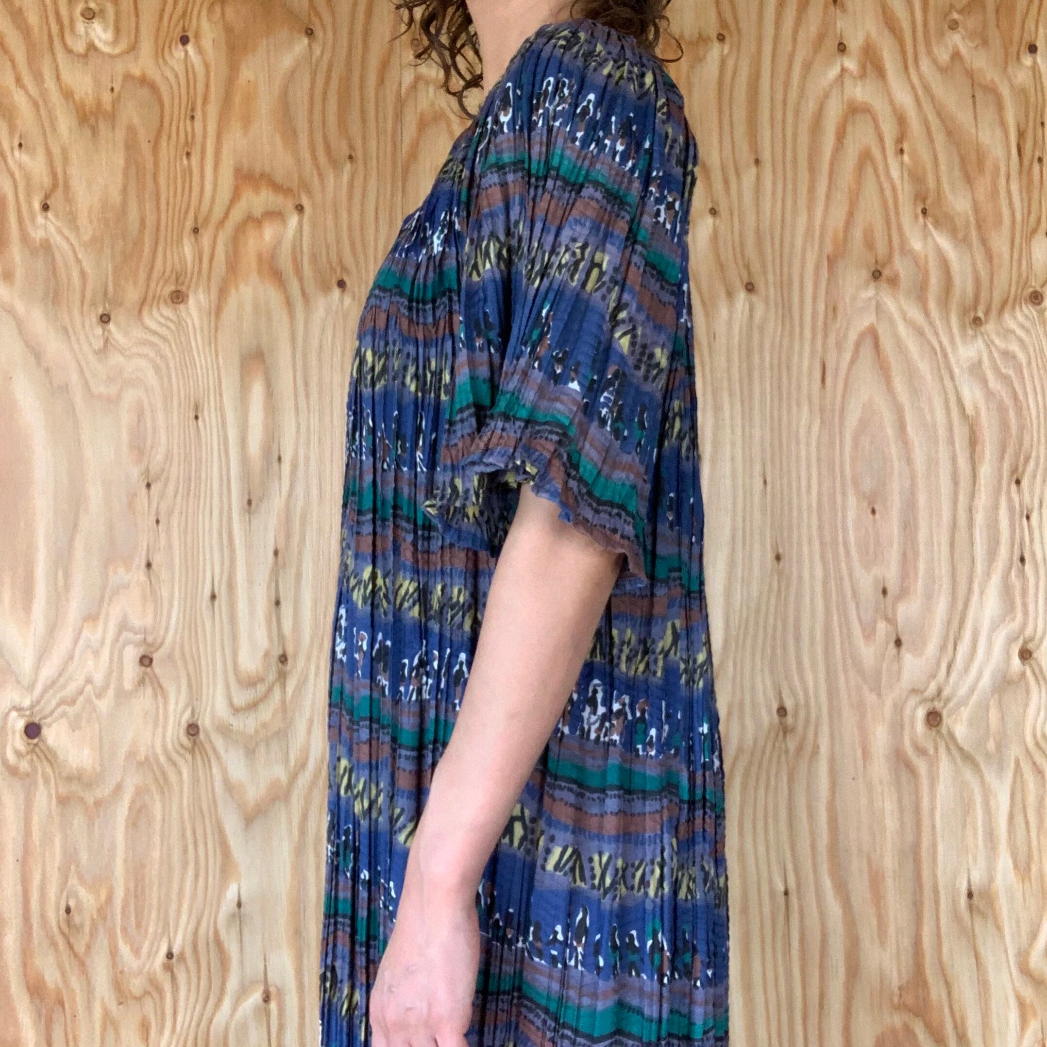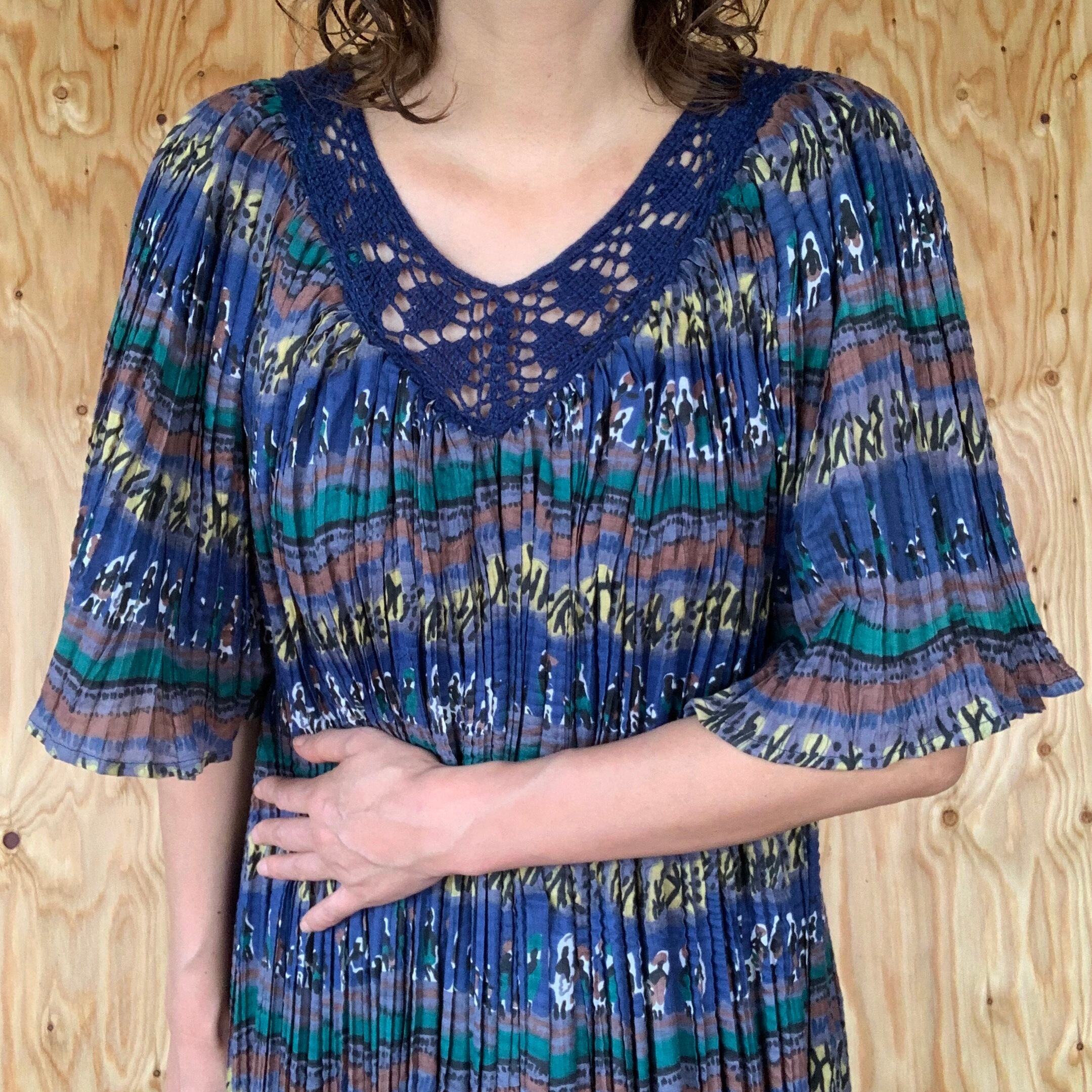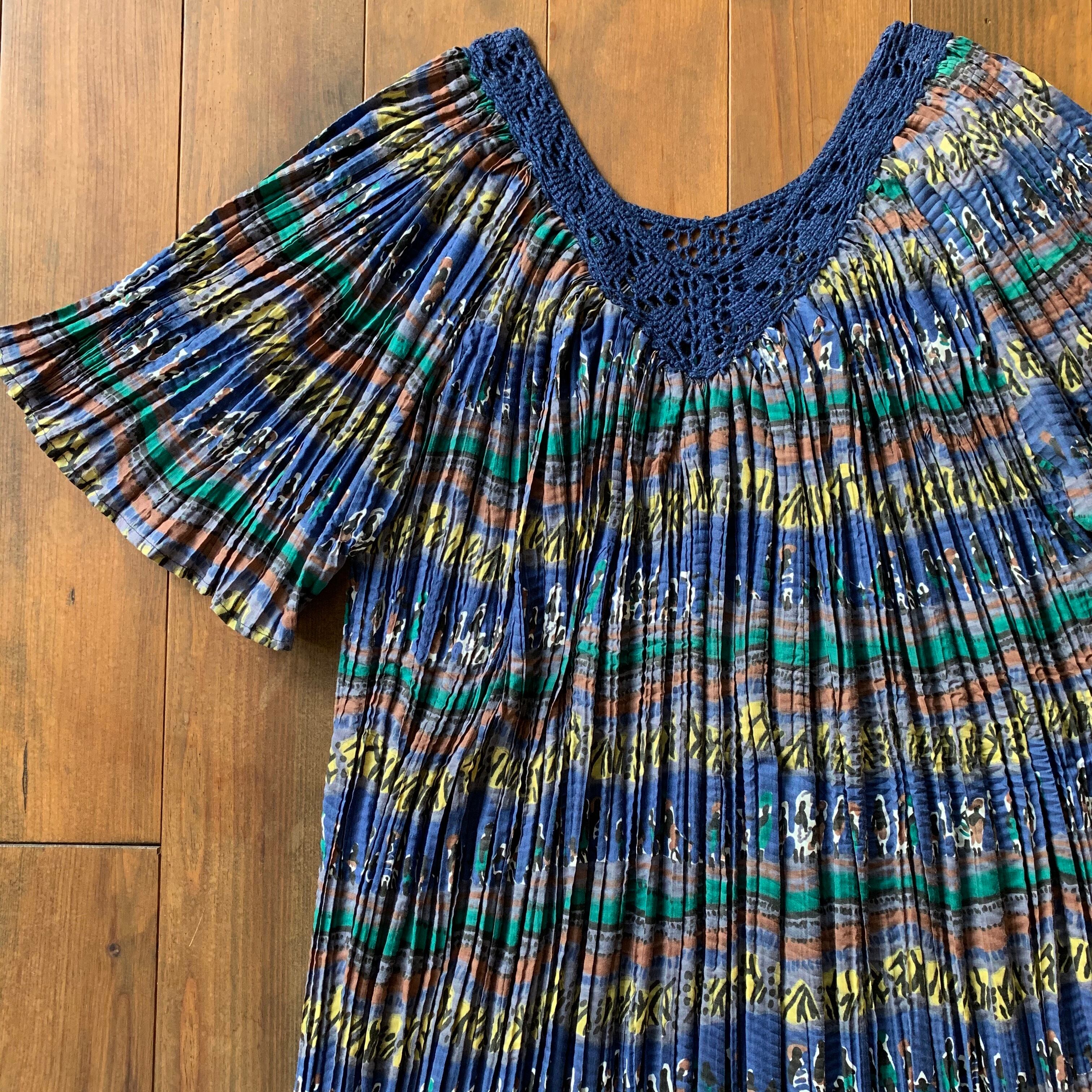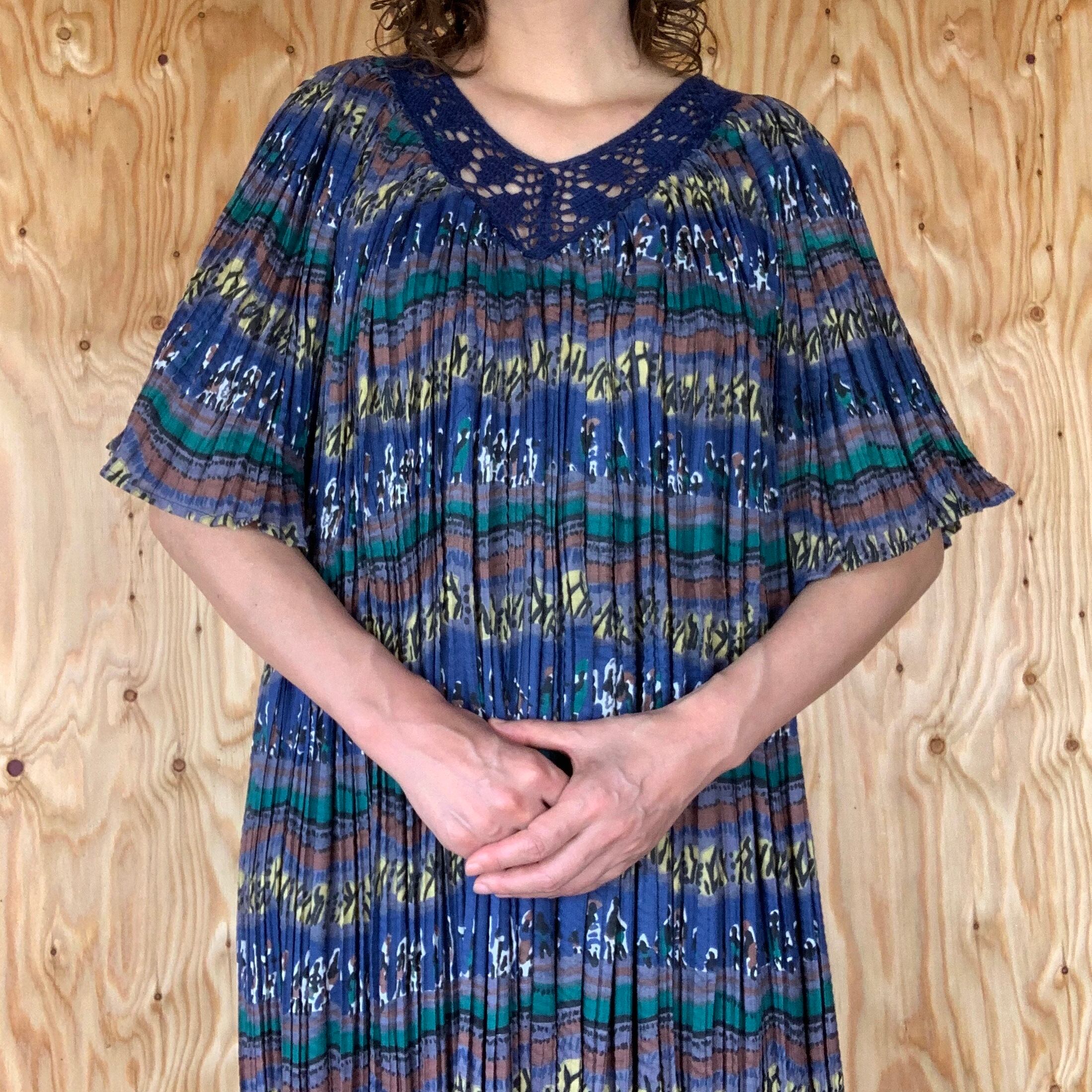 ネイビー地に、ブラウンわグリーン、イエローの総柄。