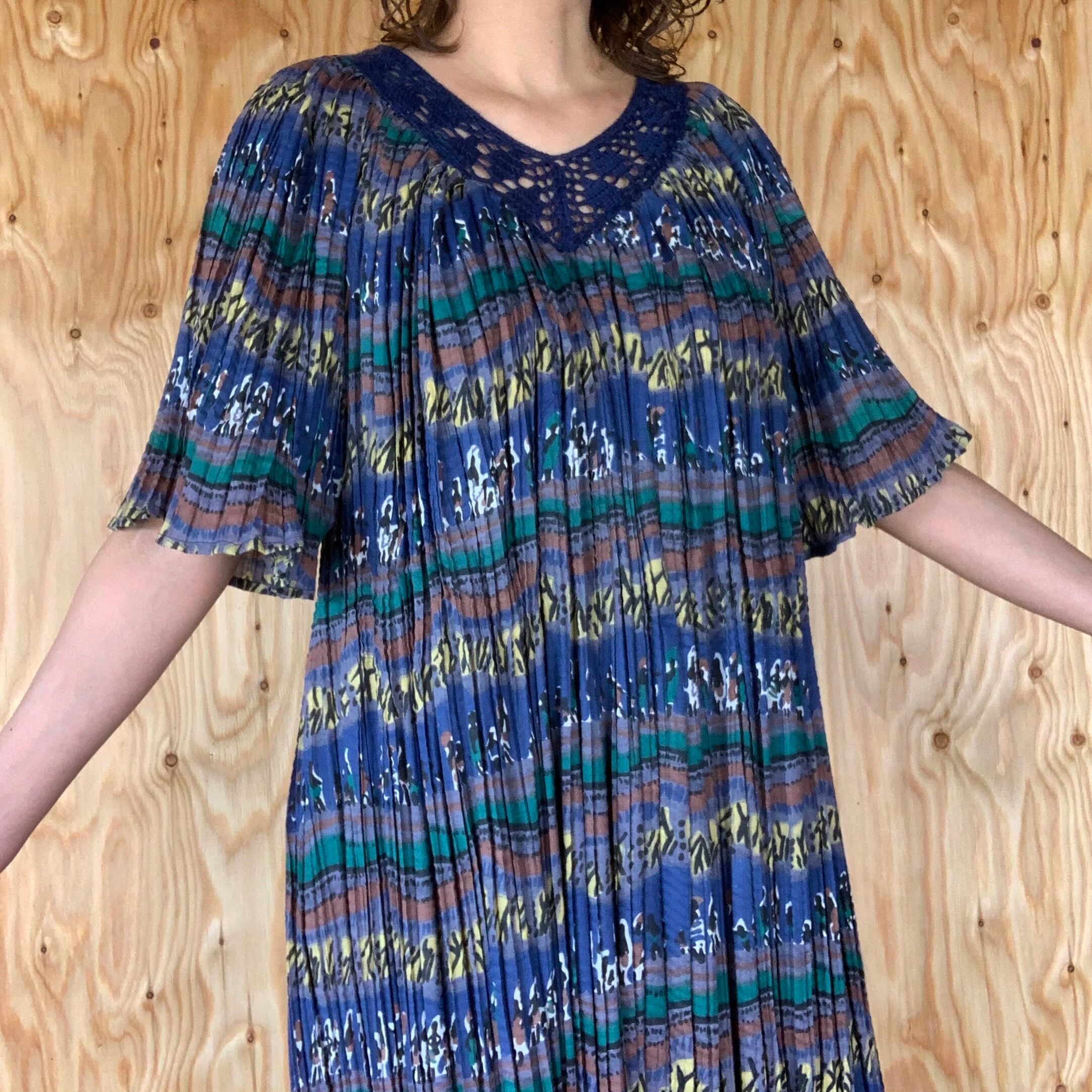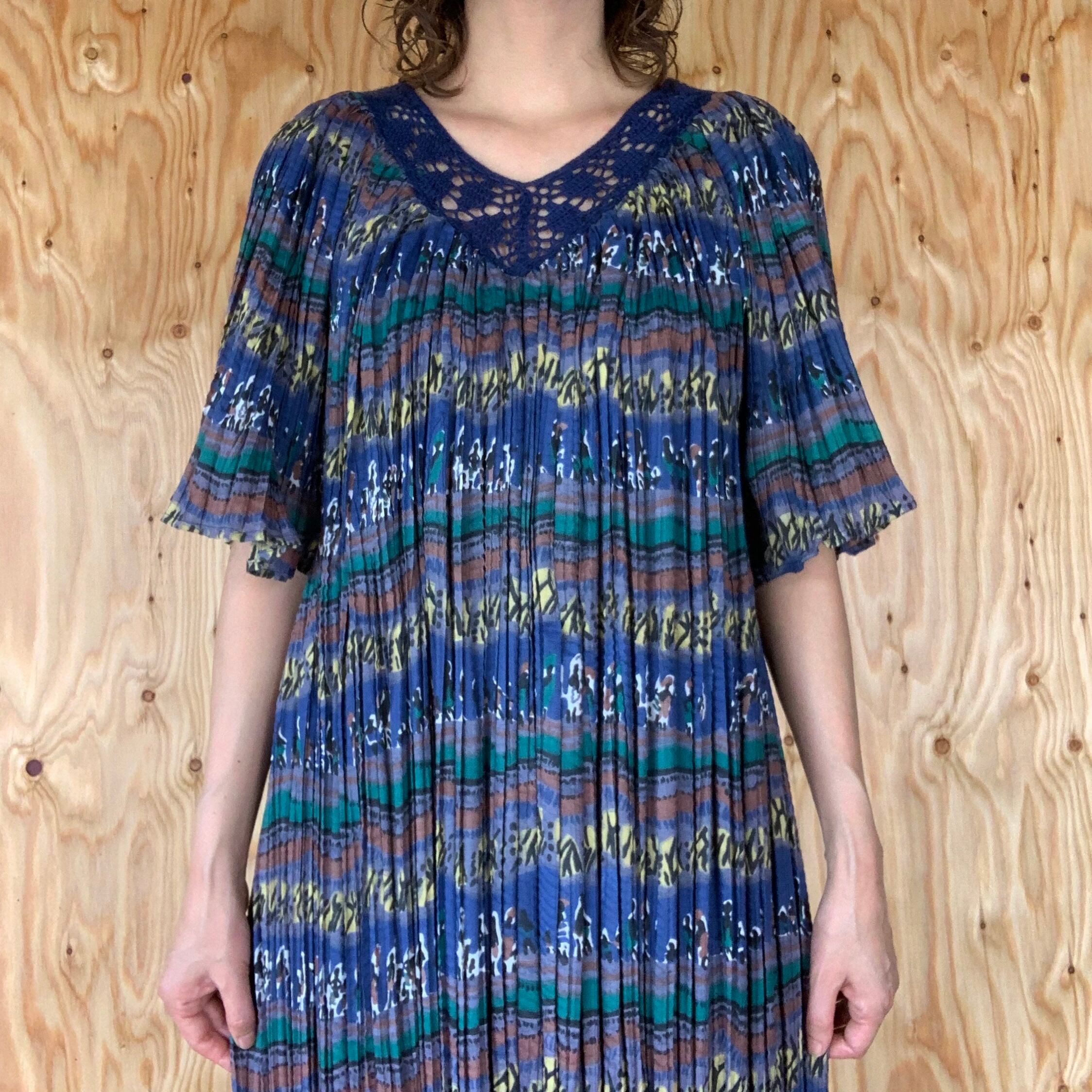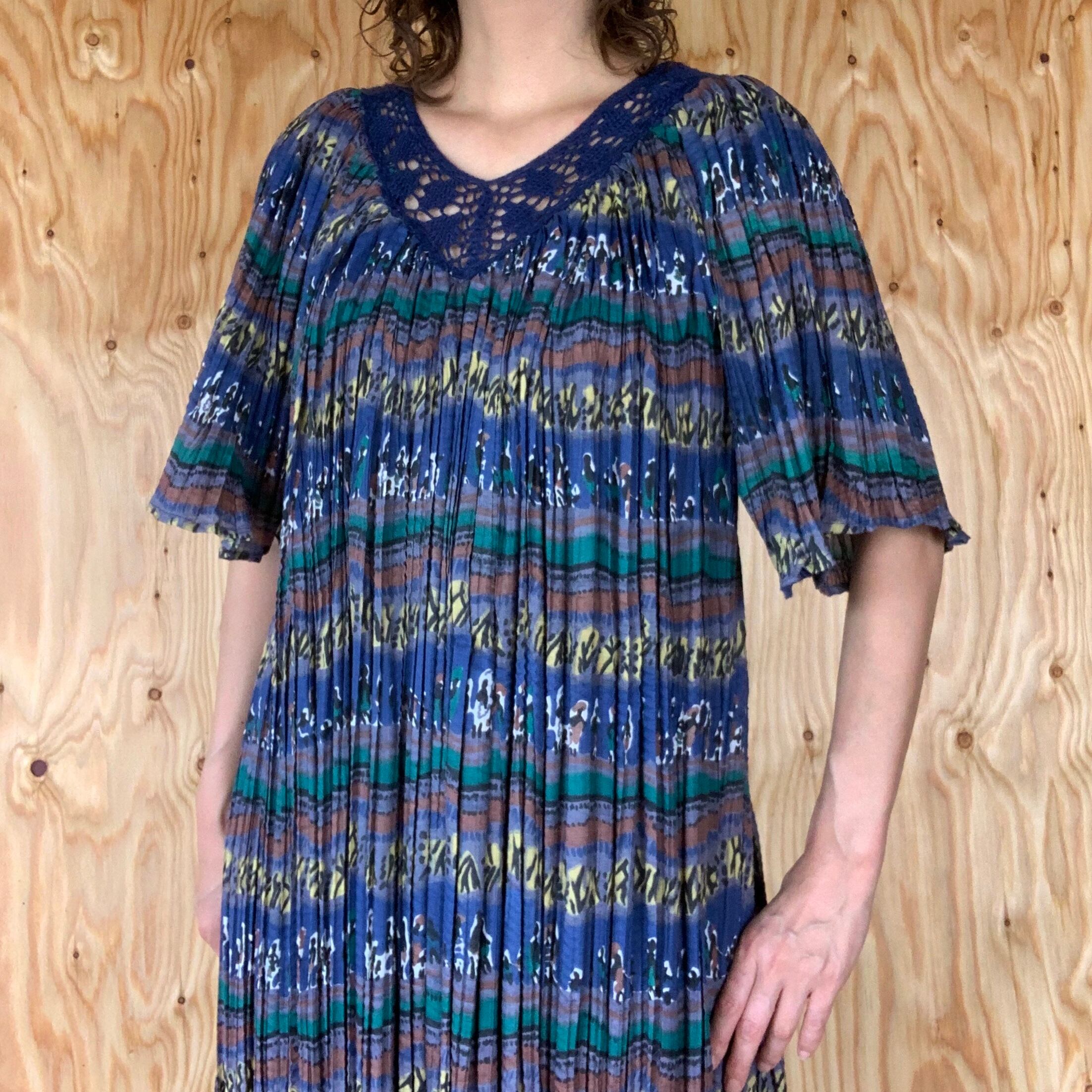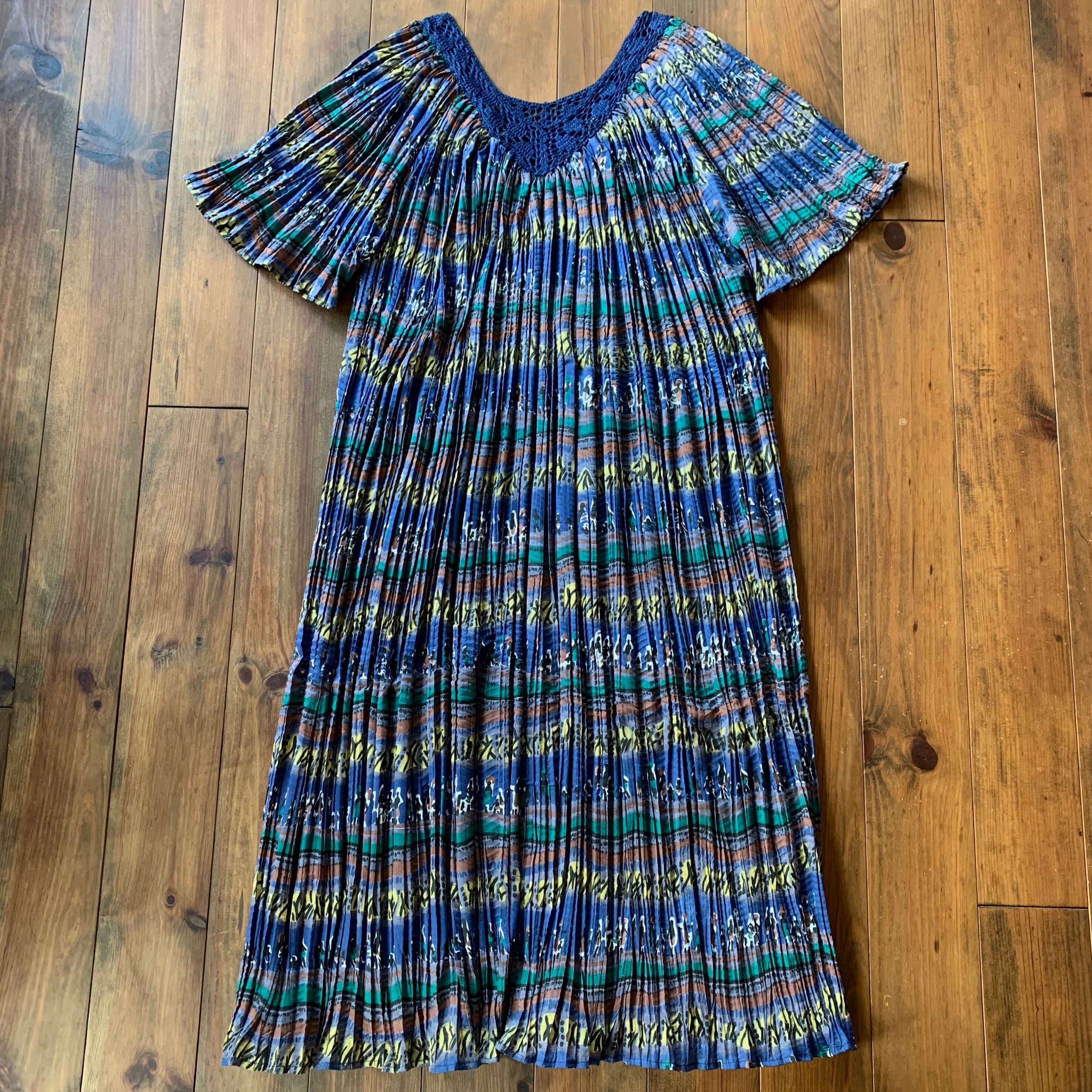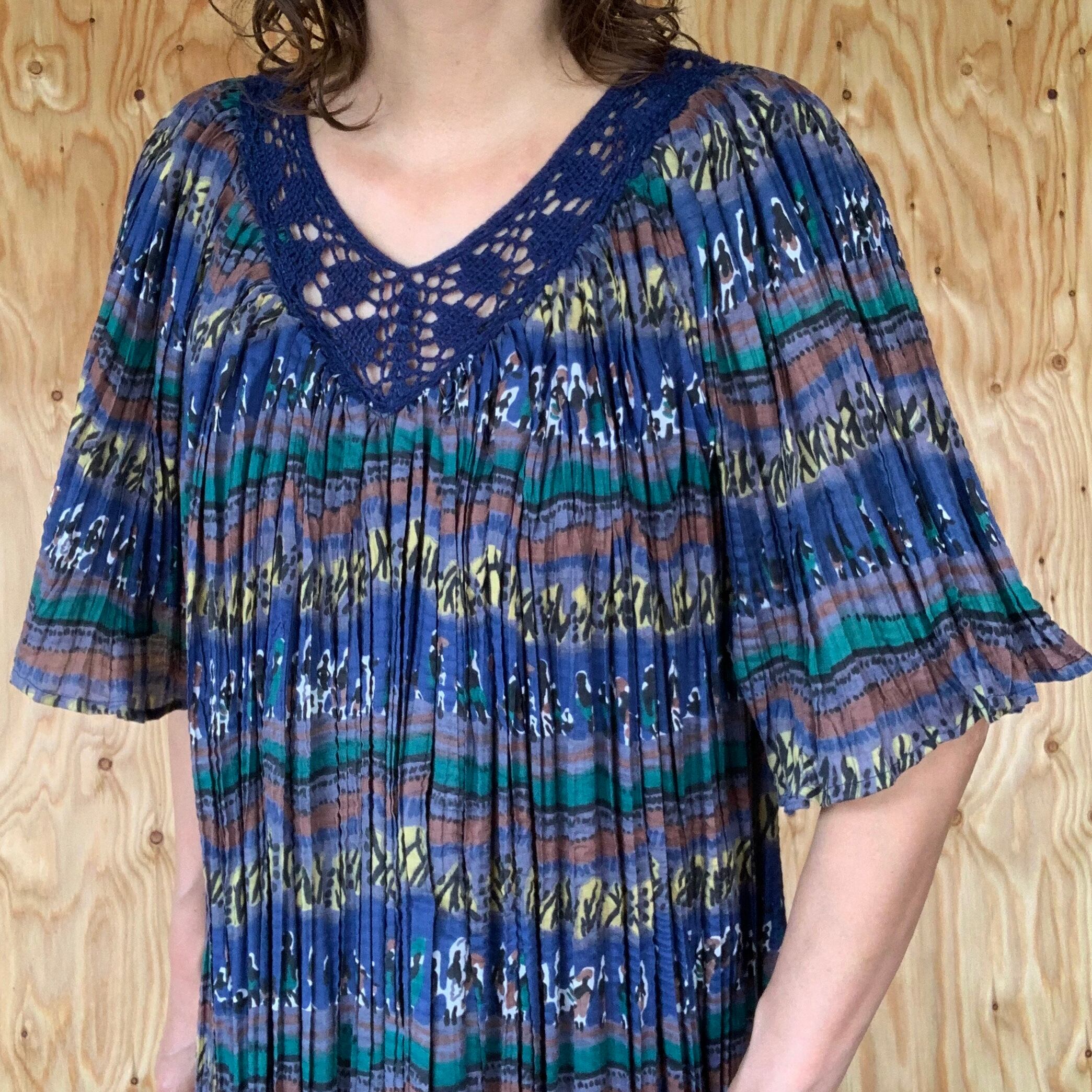 ネイビー地に、ブラウンわグリーン、イエローの総柄。