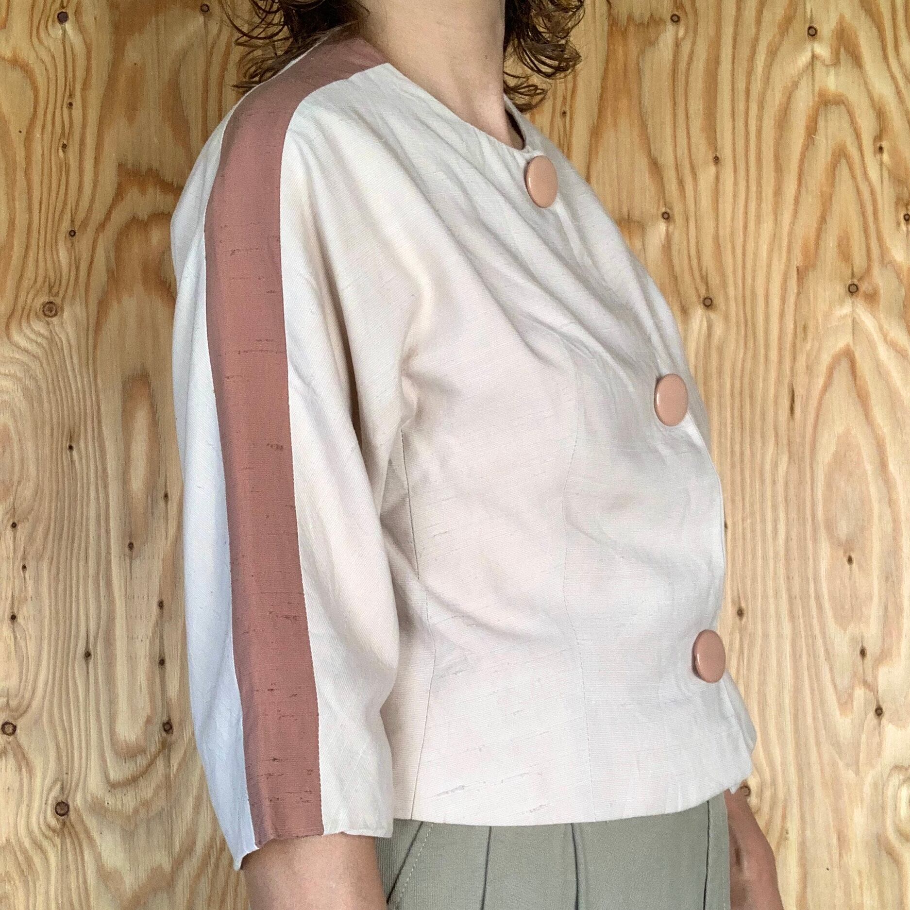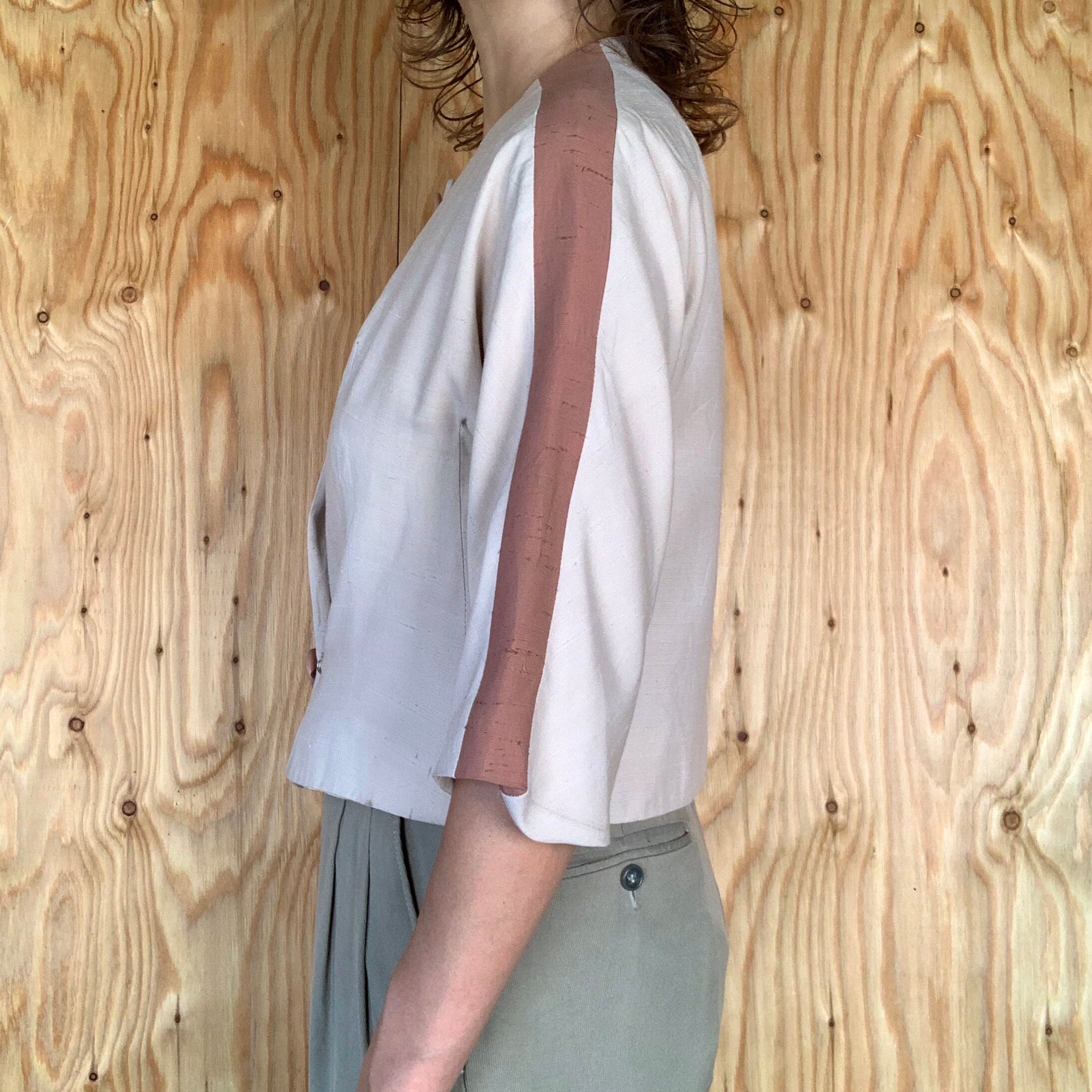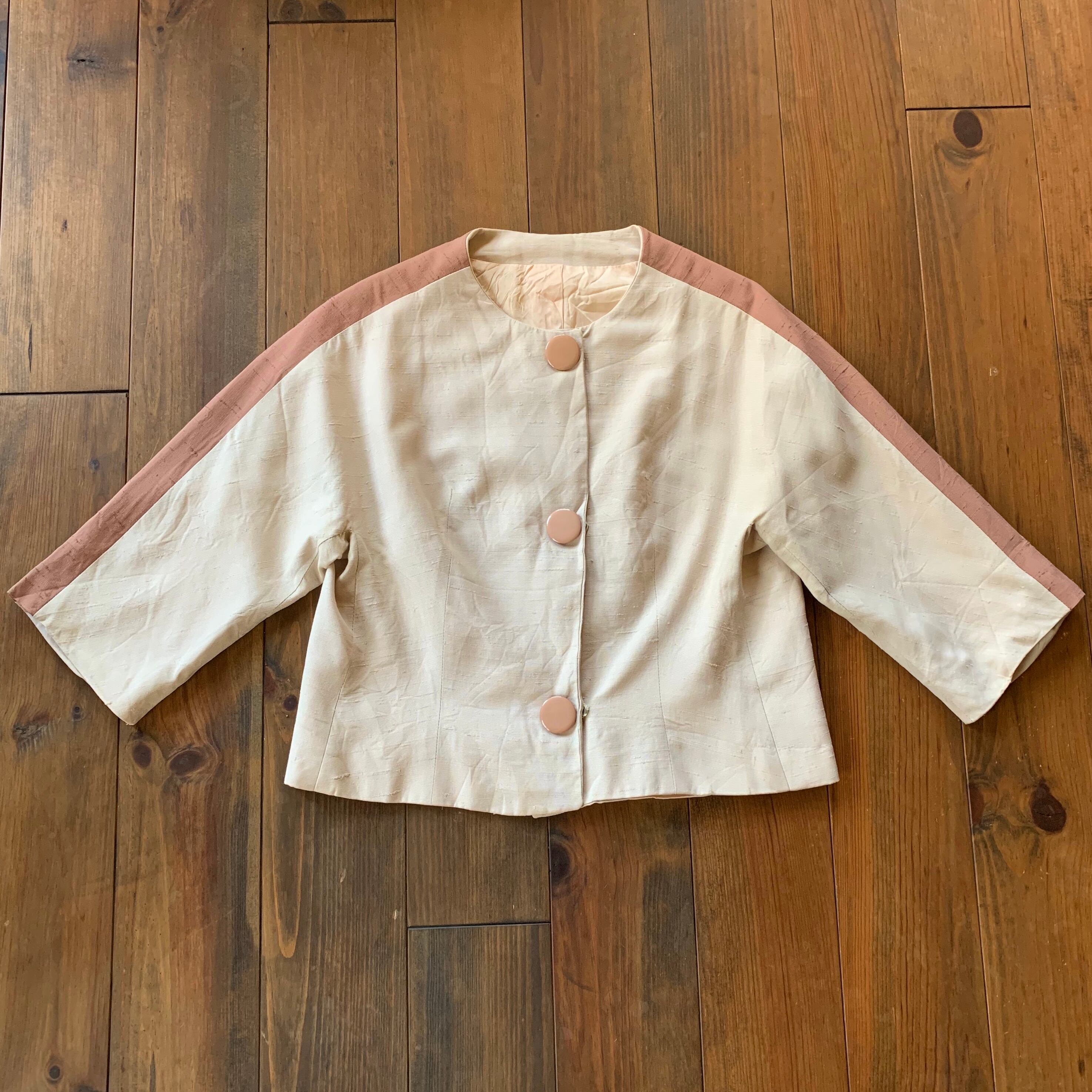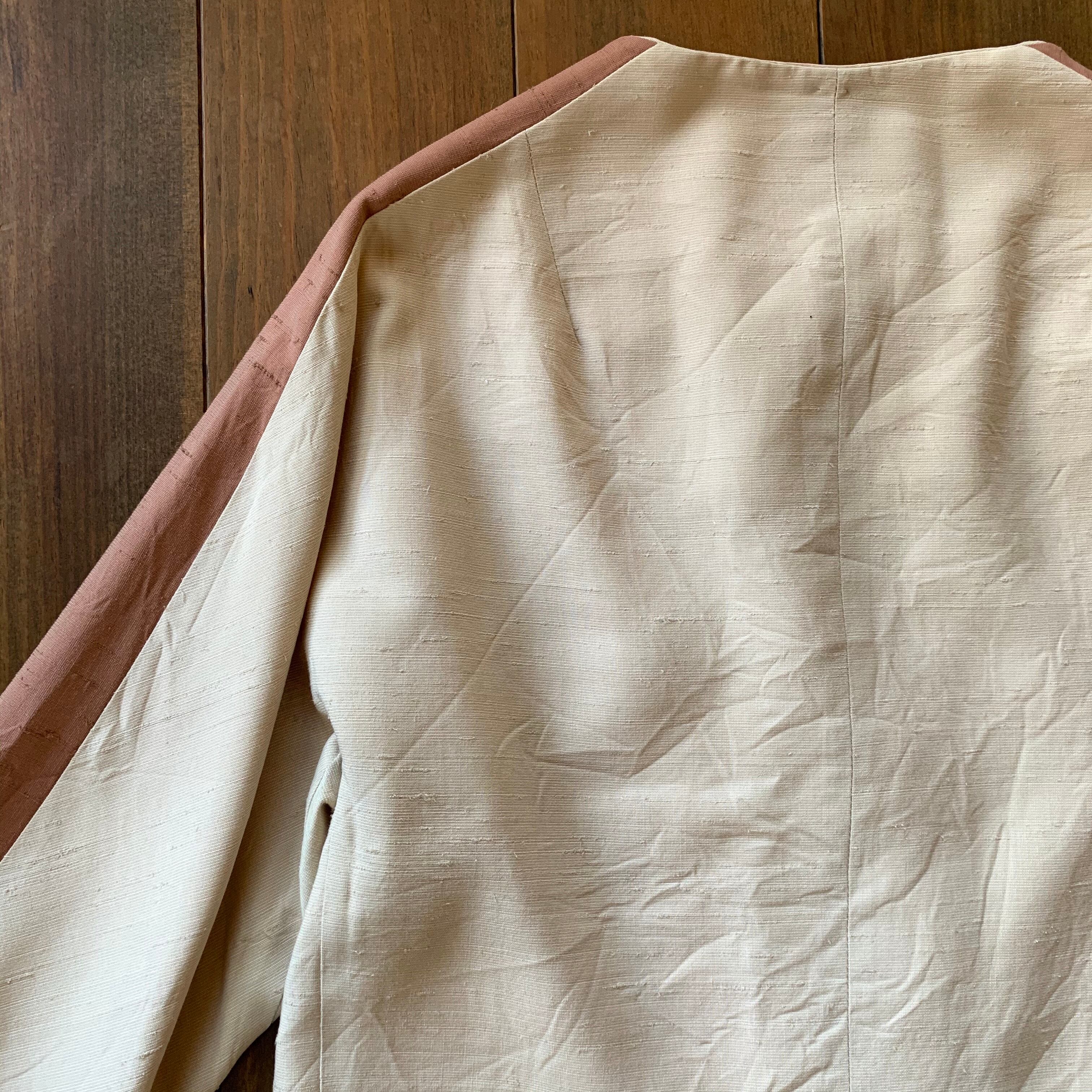 シルクだと思われる生地で、アイボリー地にくすんだピンクのライン。