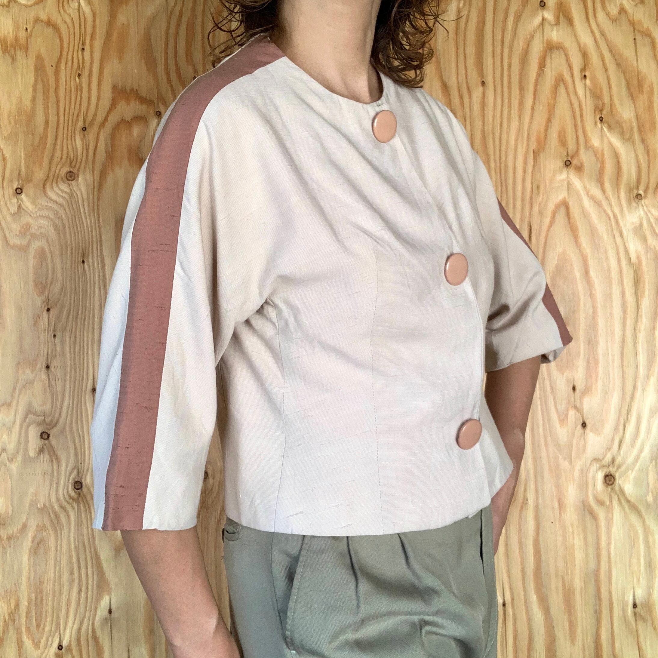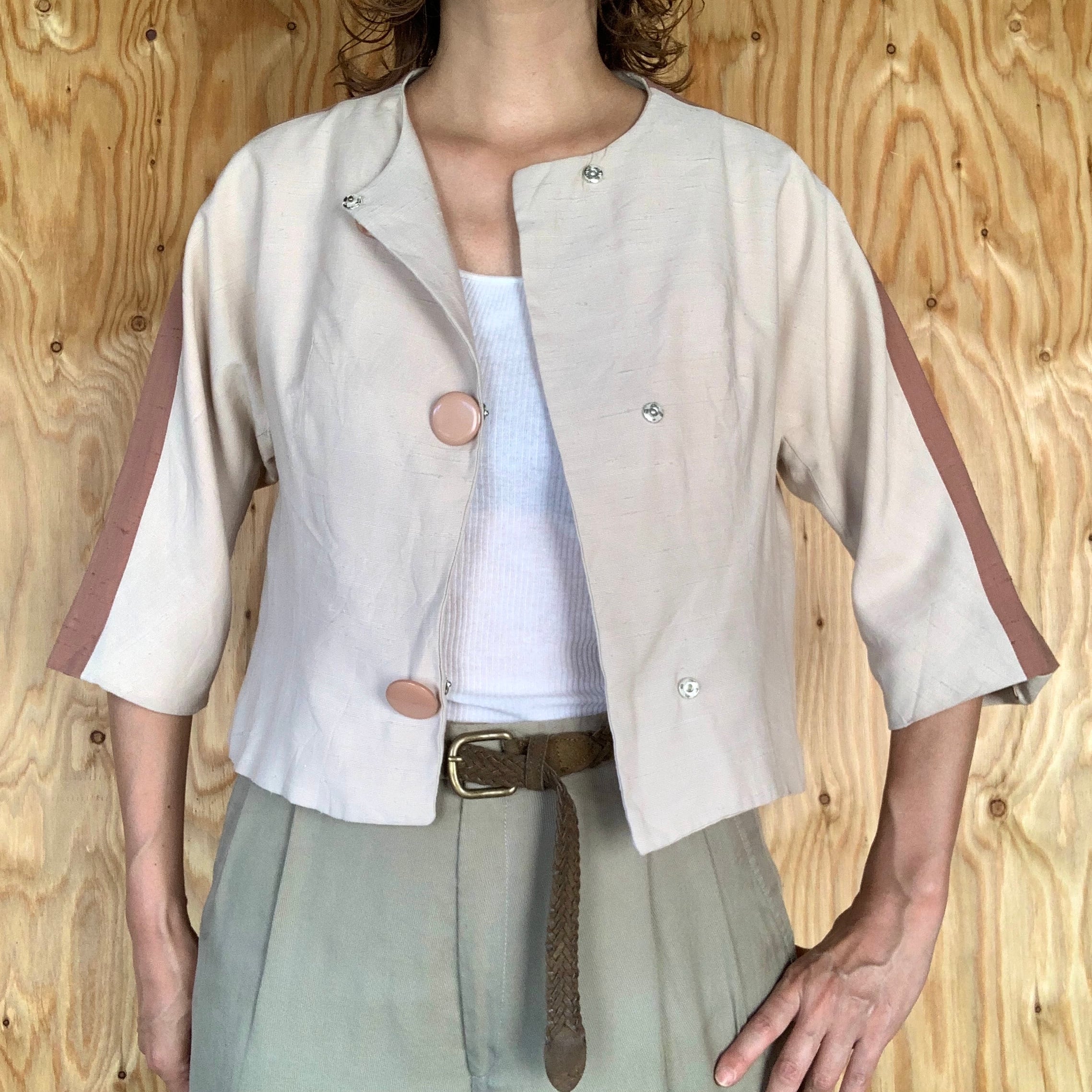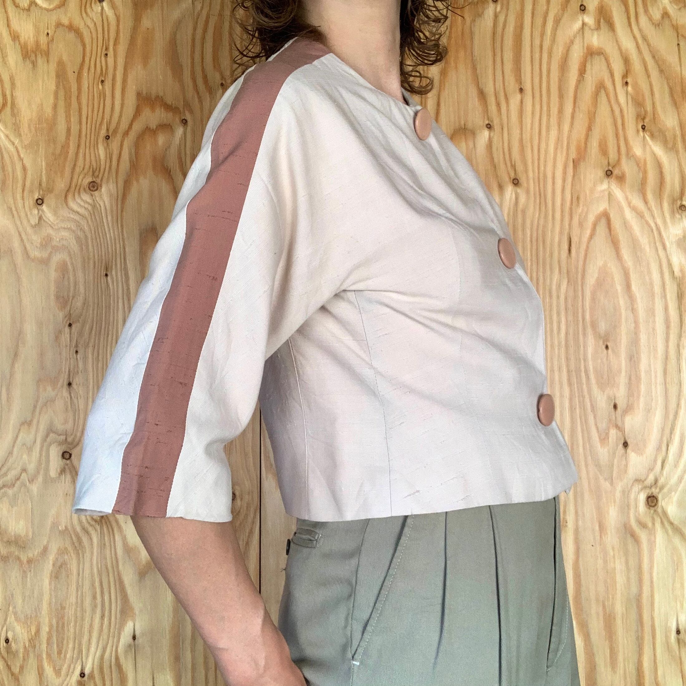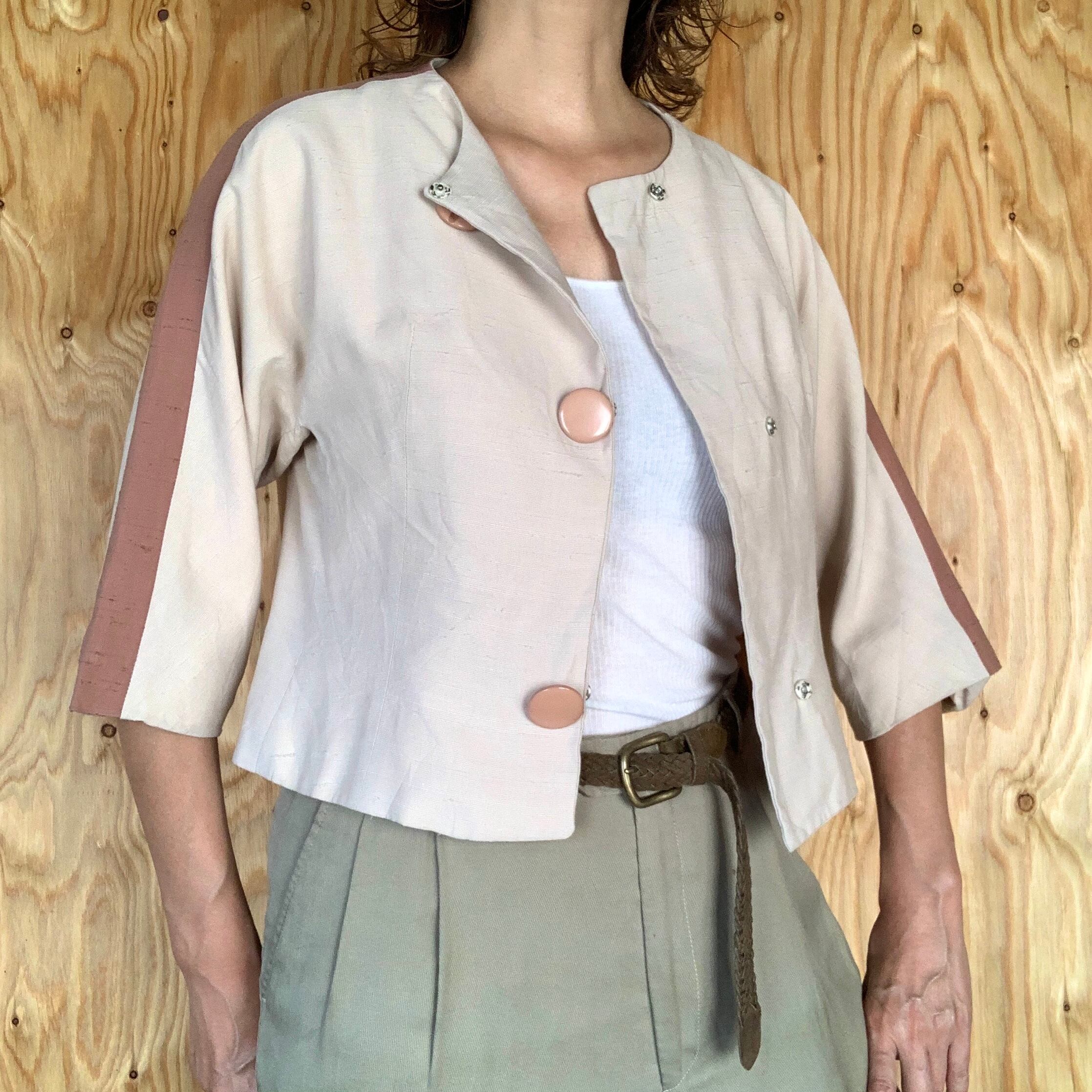 シルクだと思われる生地で、アイボリー地にくすんだピンクのライン。