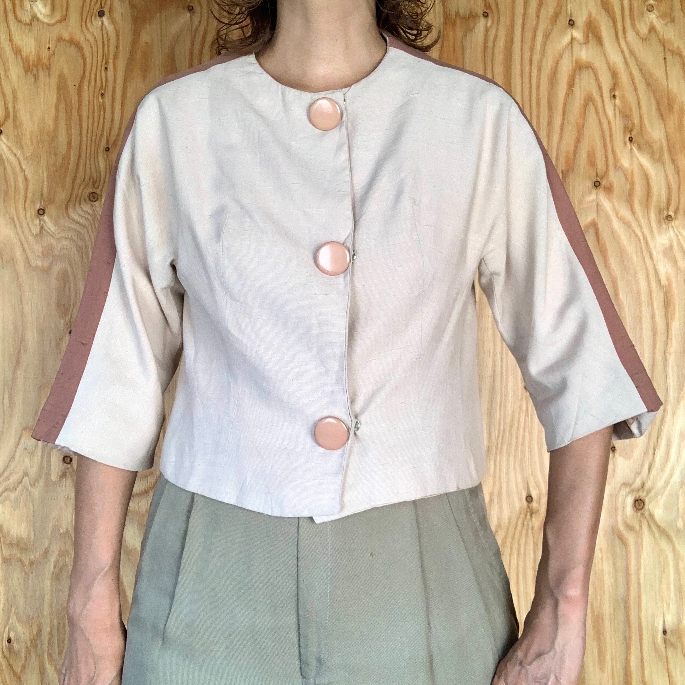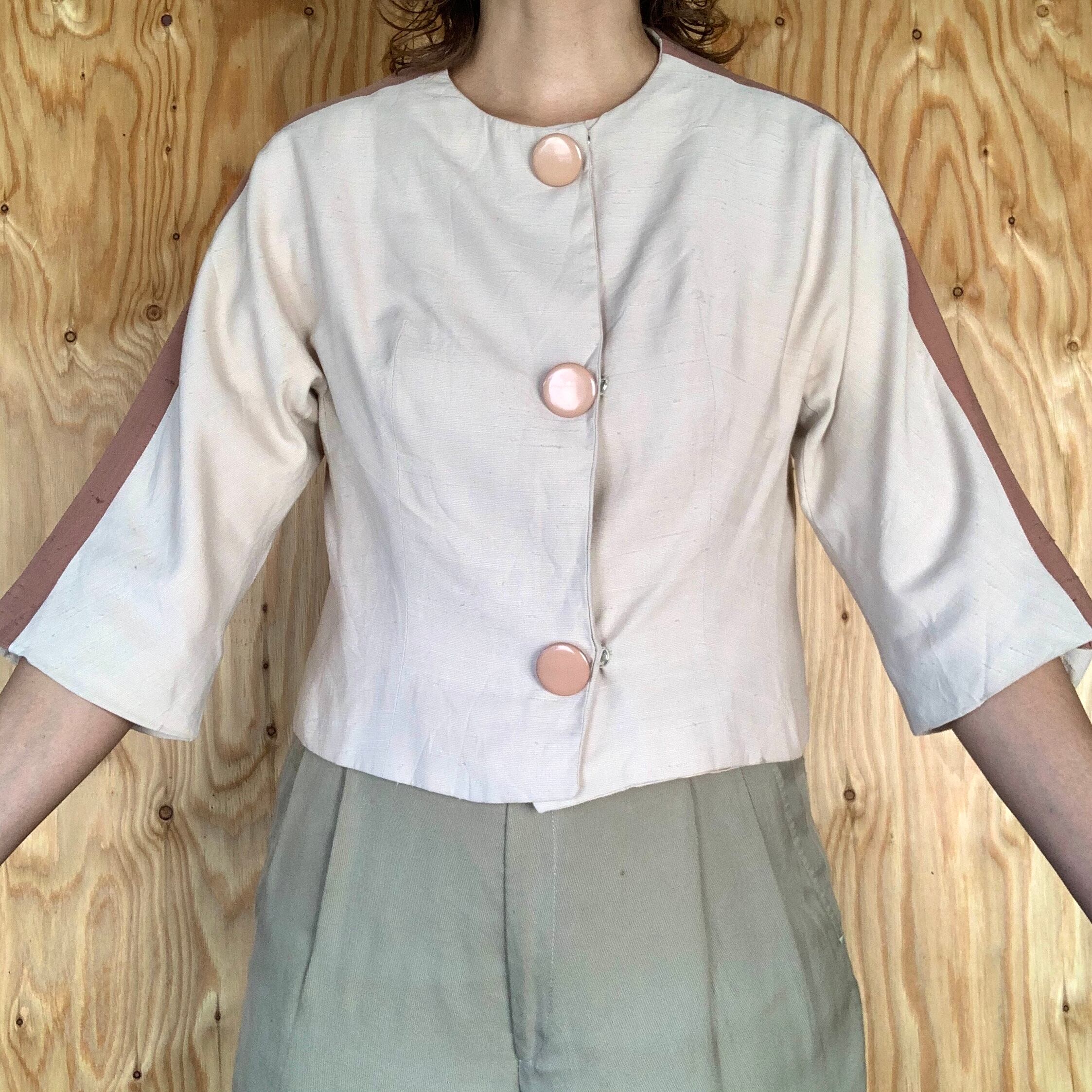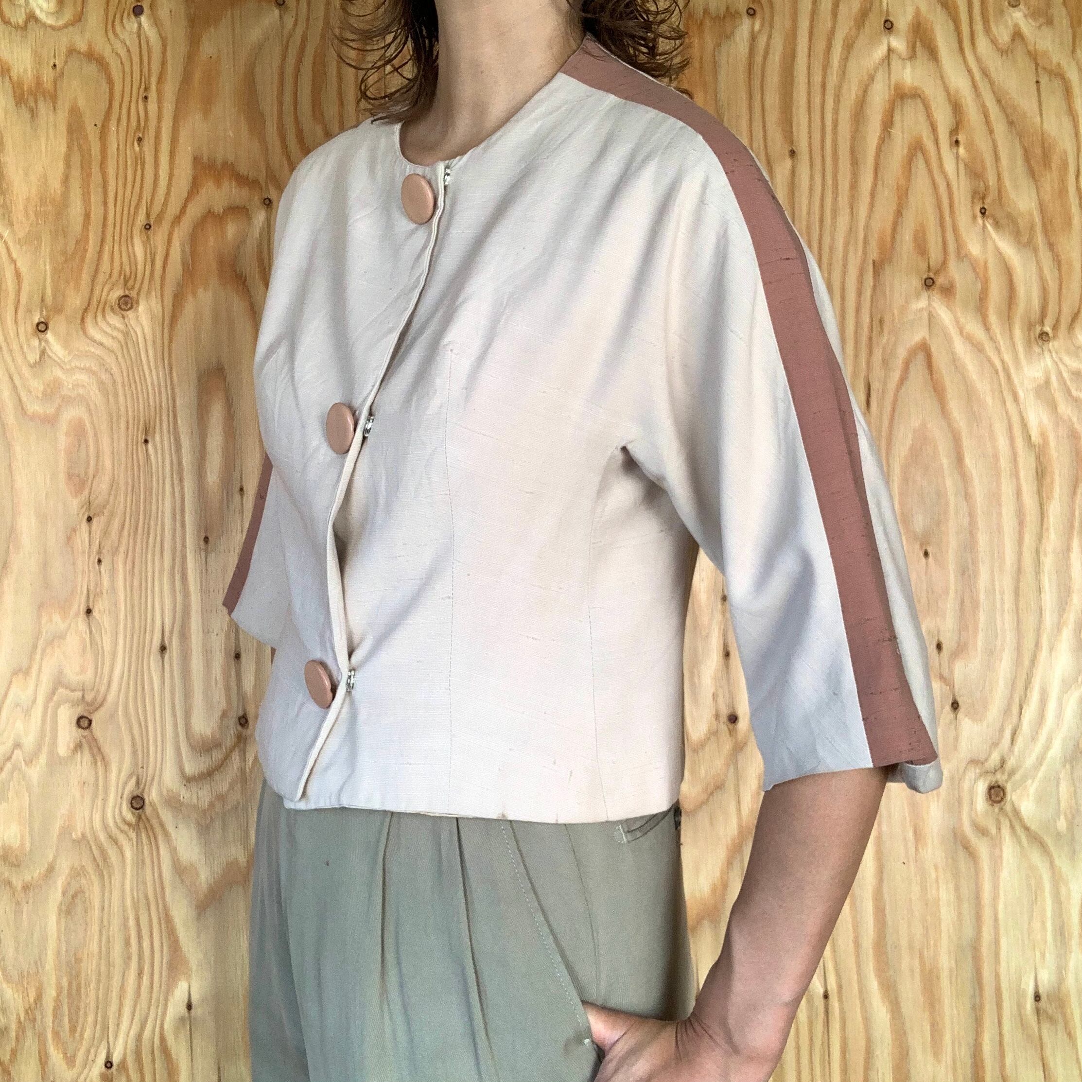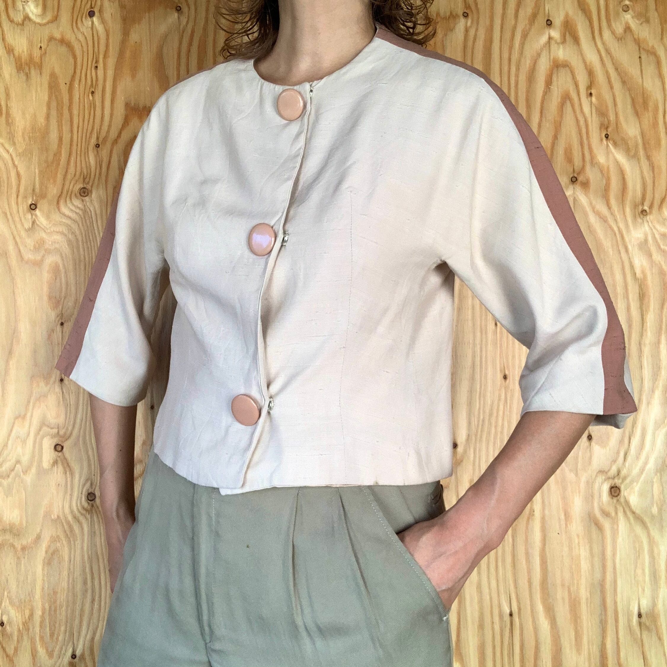 シルクだと思われる生地で、アイボリー地にくすんだピンクのライン。