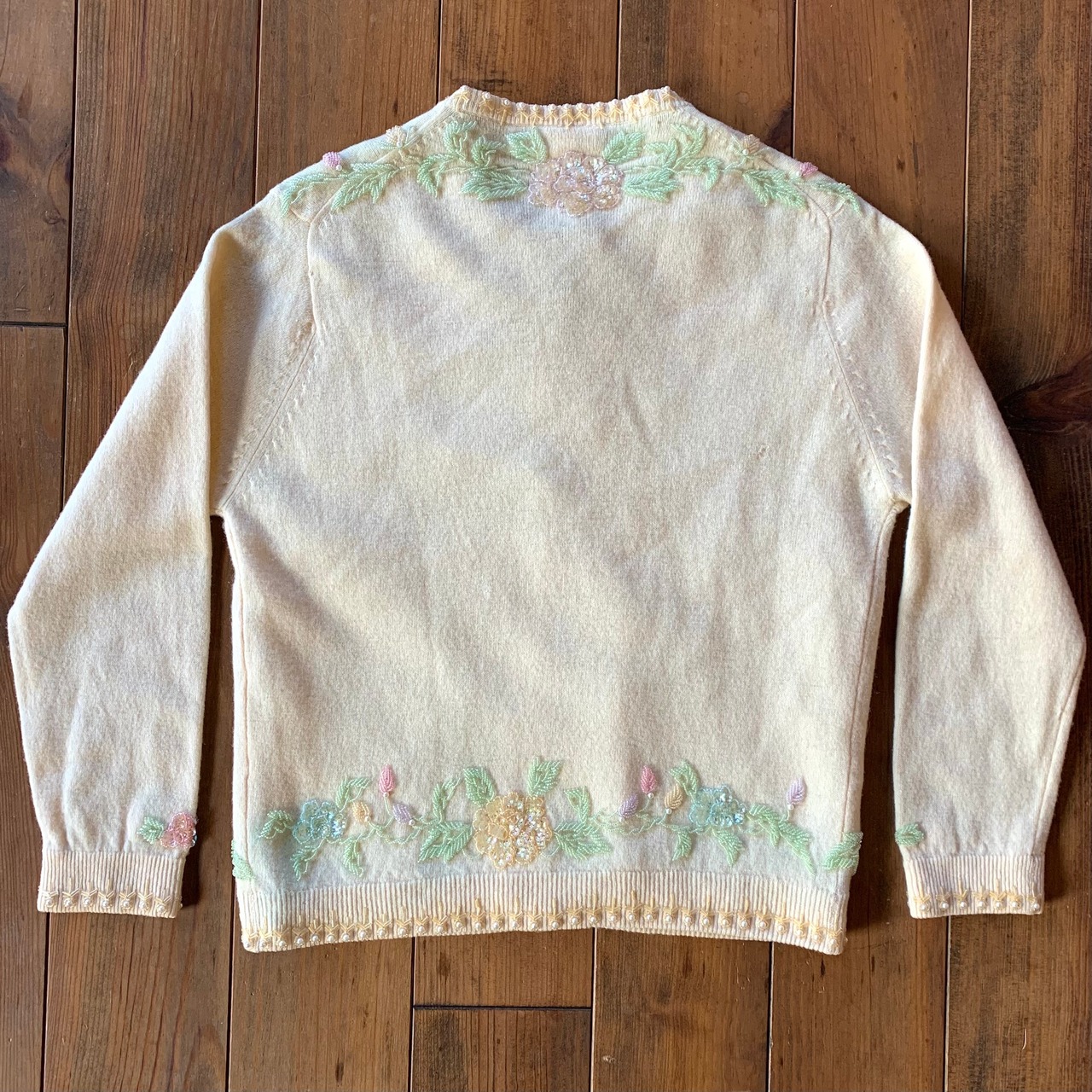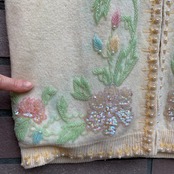 アイボリーのウール地に、シャーベットカラーのクリアなビーズとスパンコール。