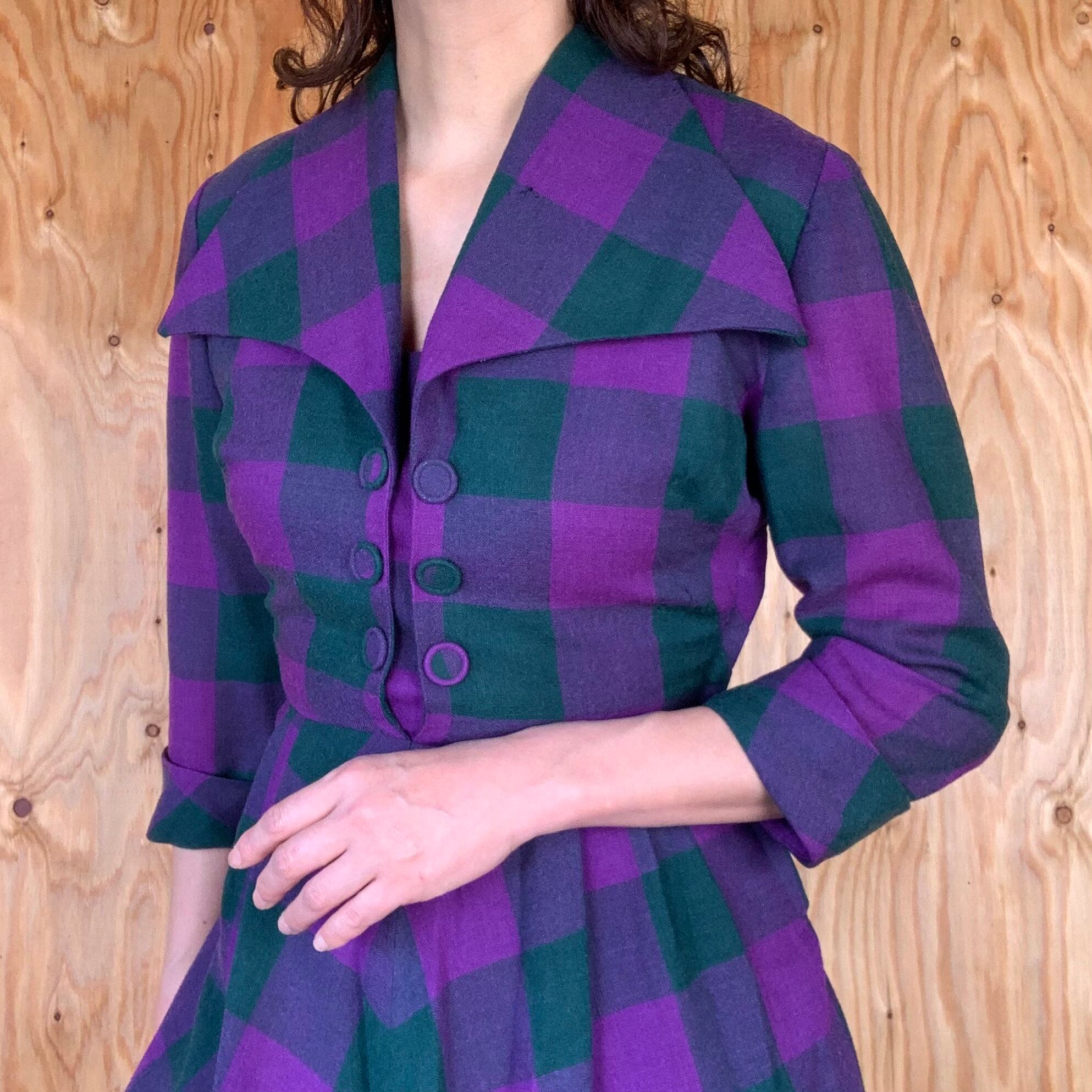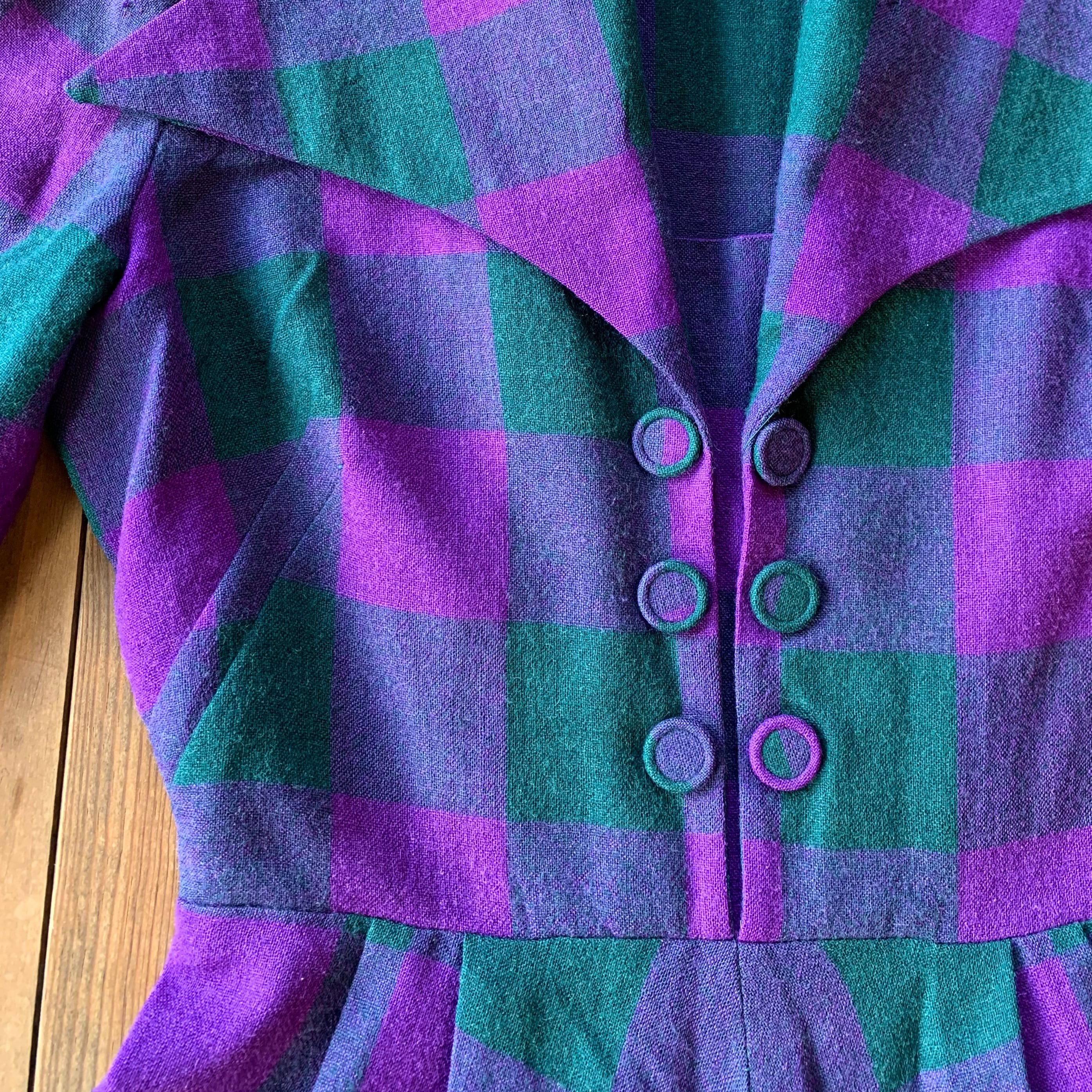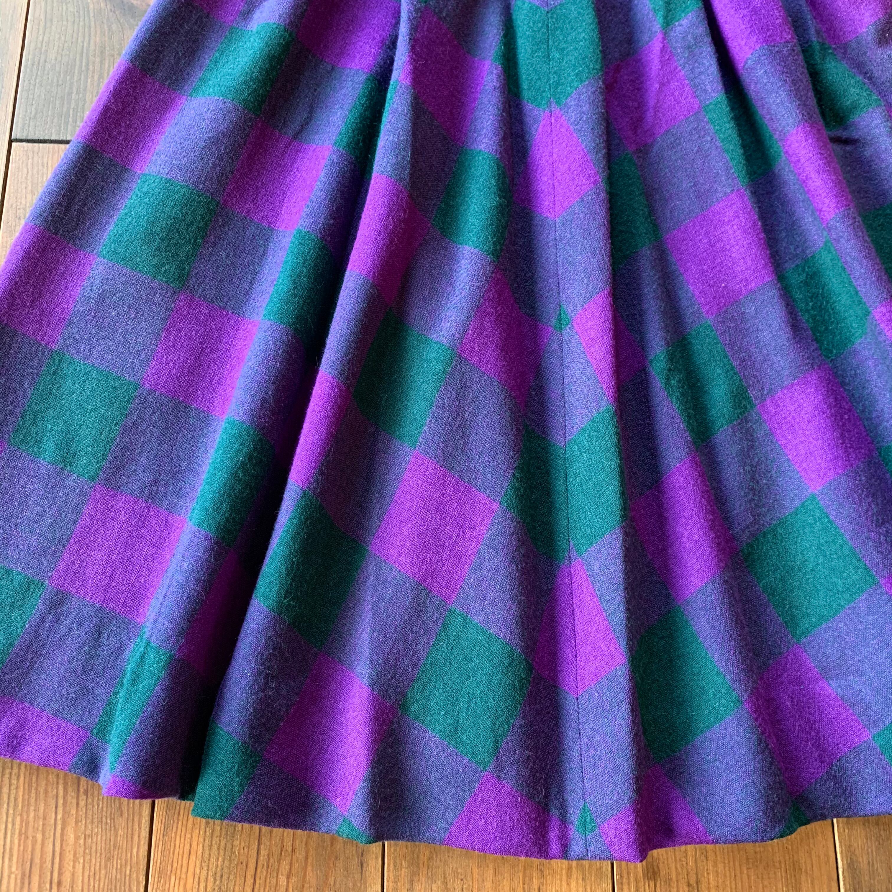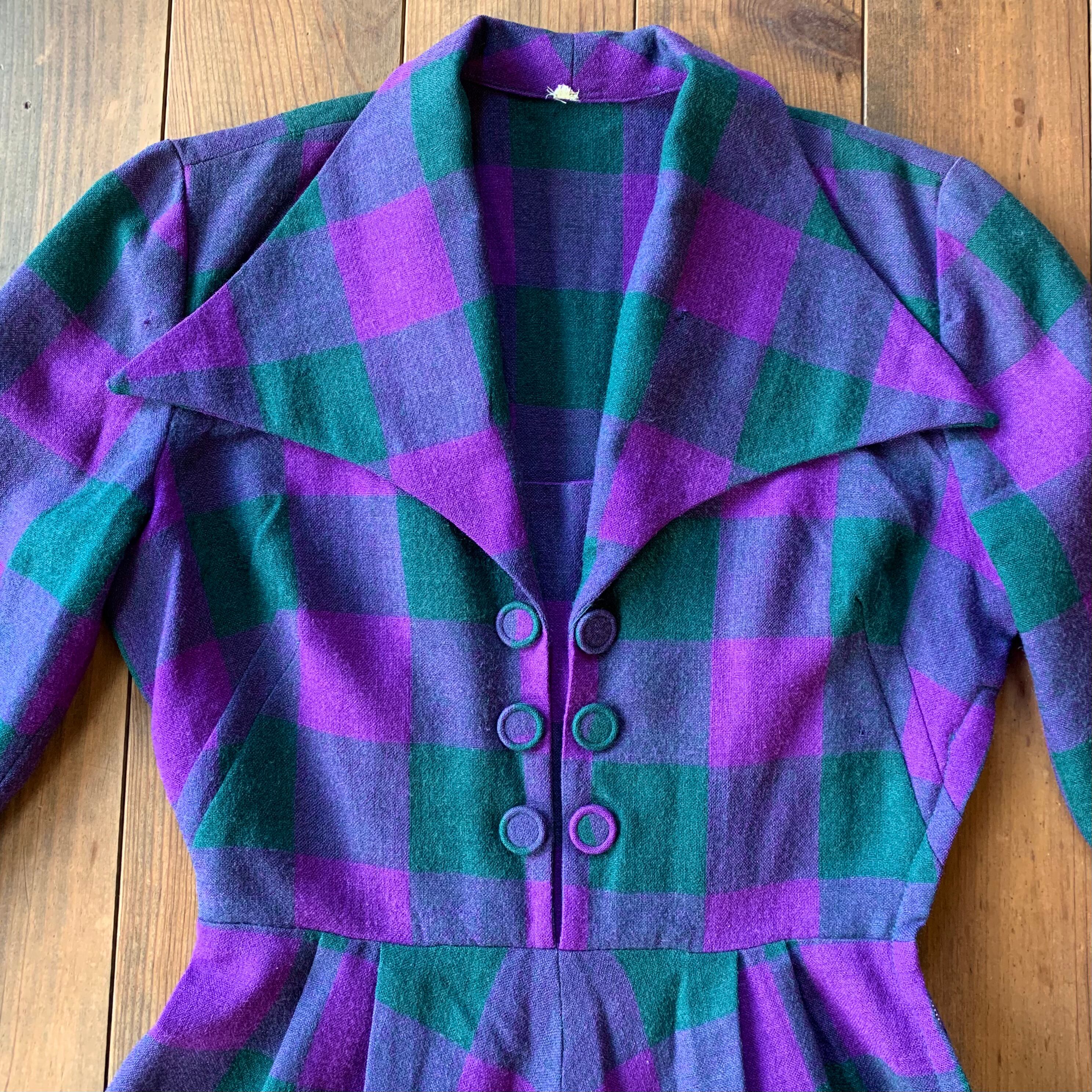 パープルとモスグリーンのチェック柄のウール素材。