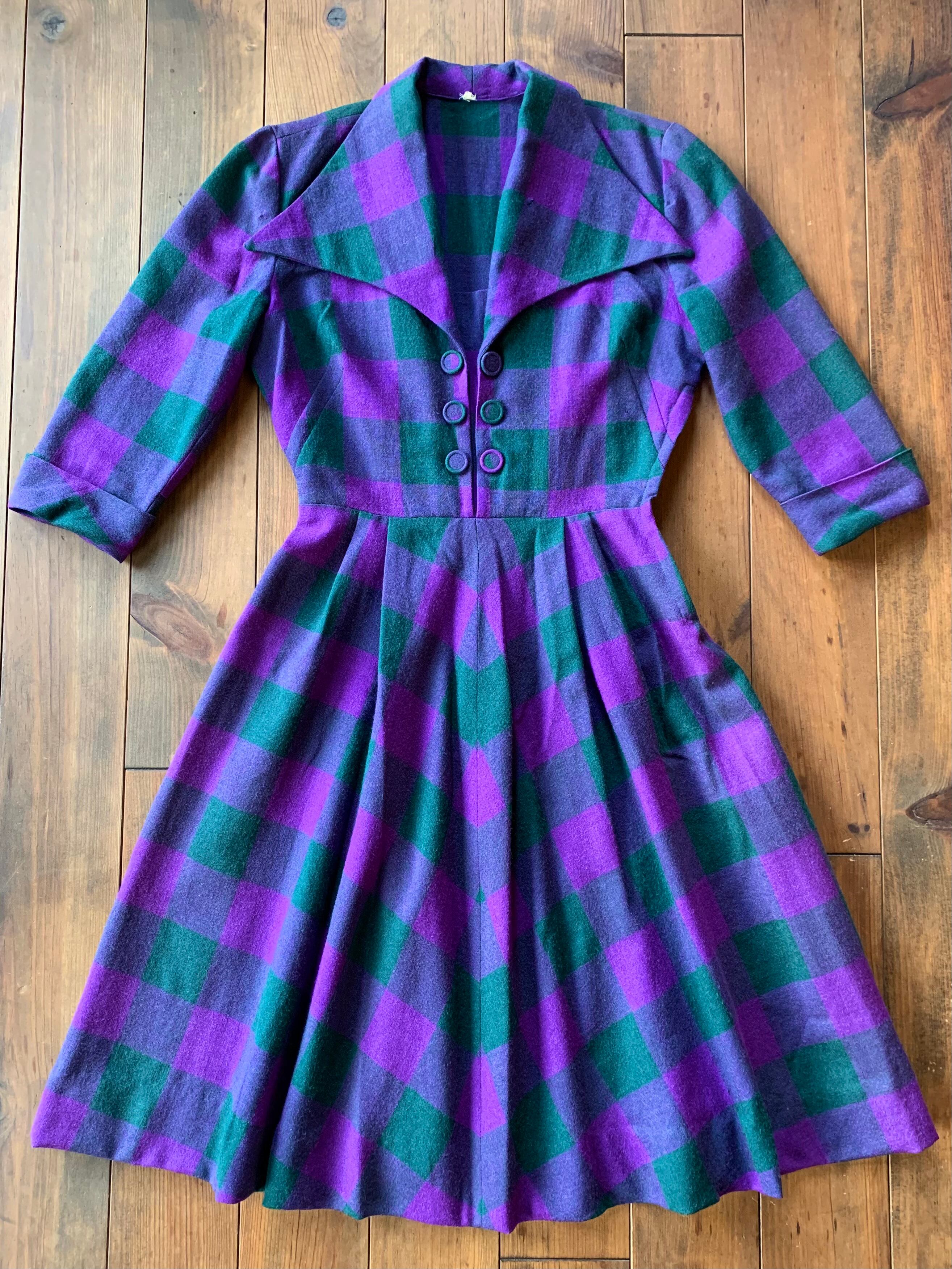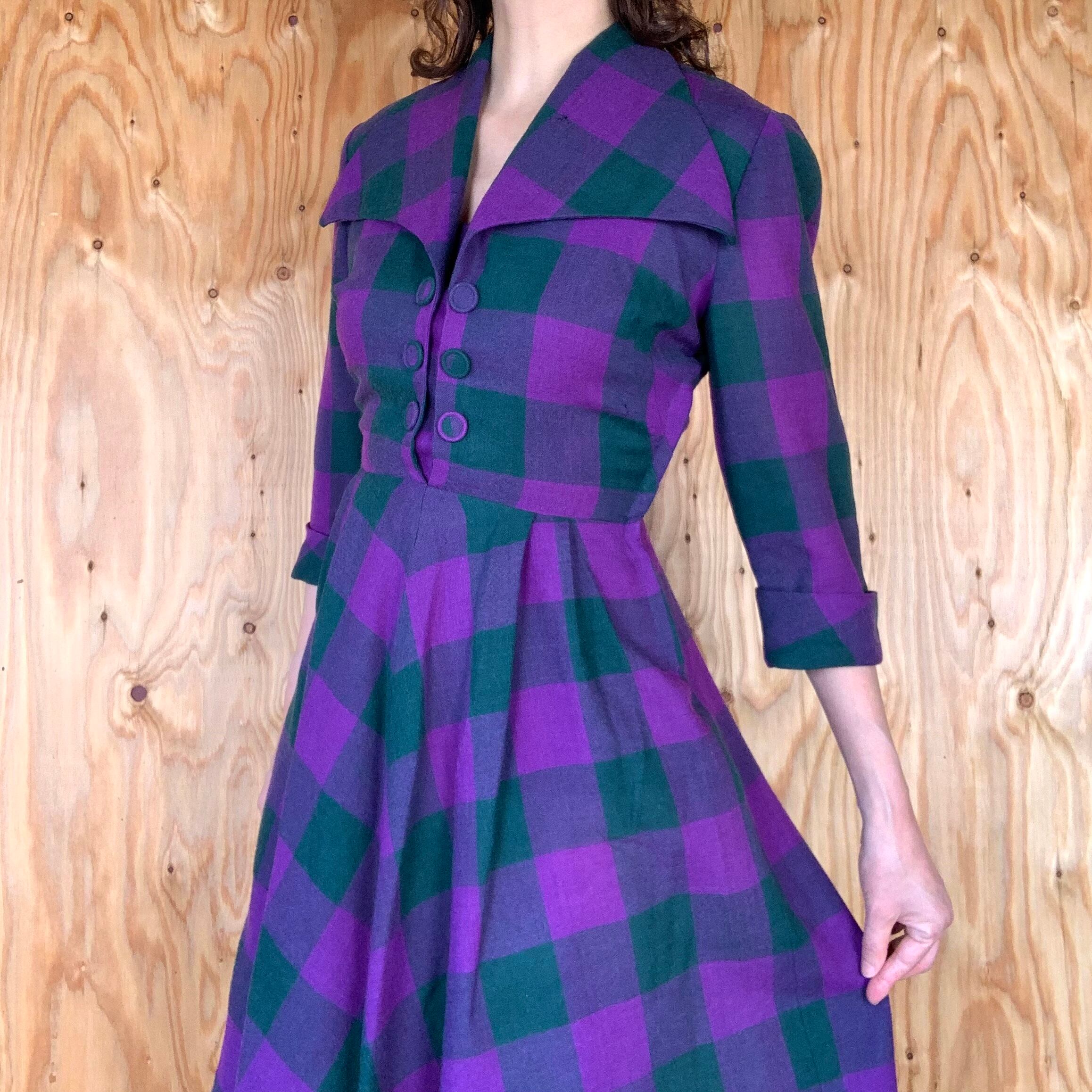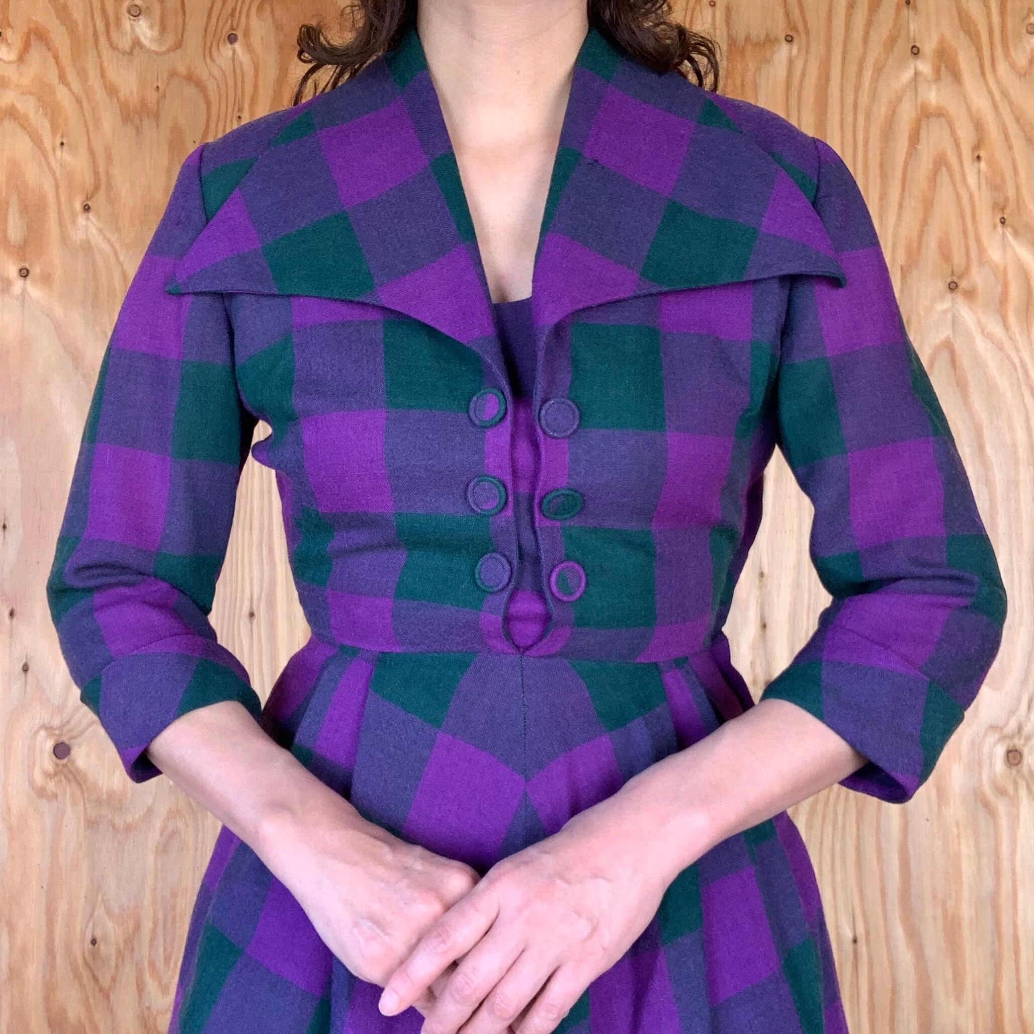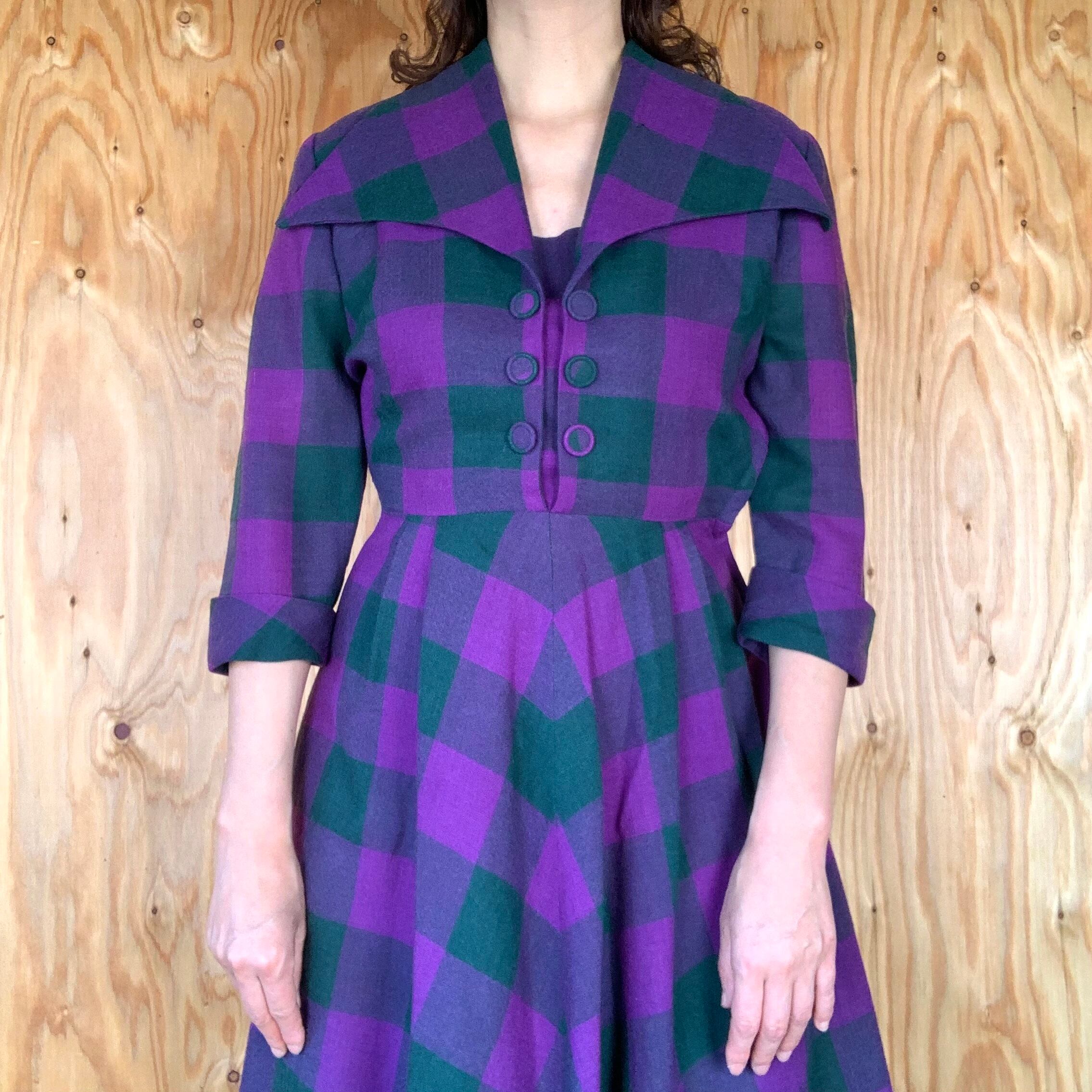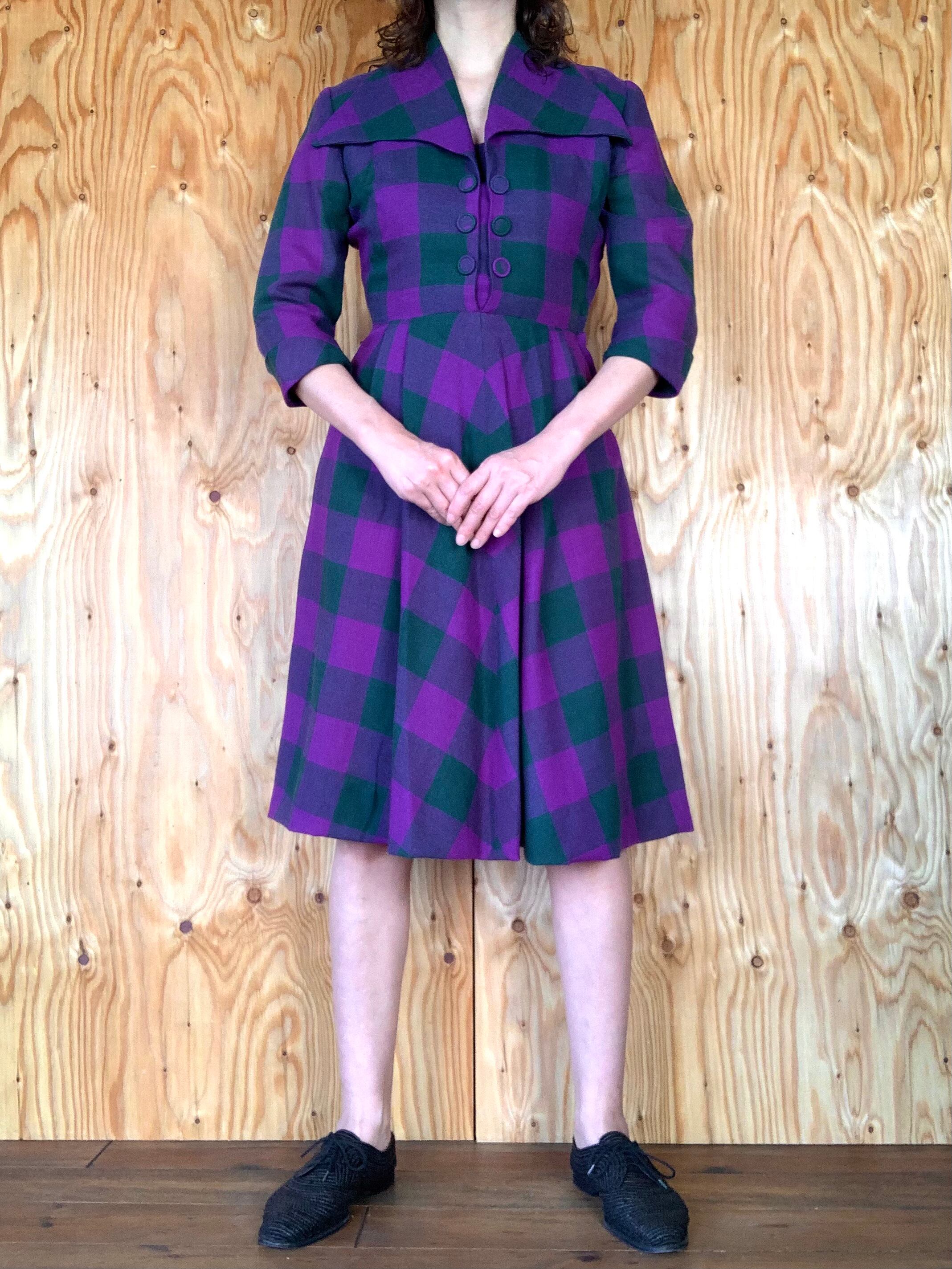 パープルとモスグリーンのチェック柄のウール素材。
