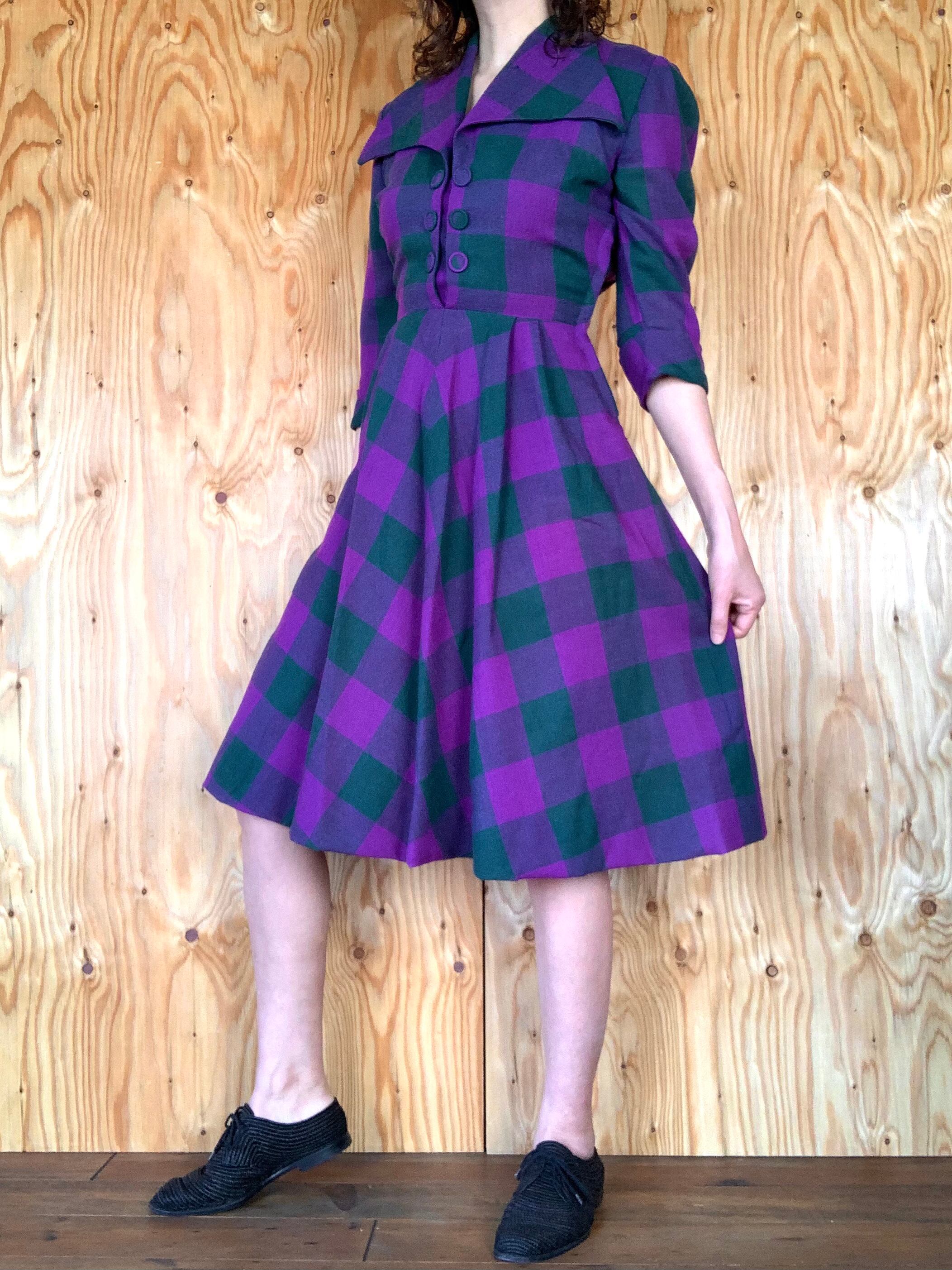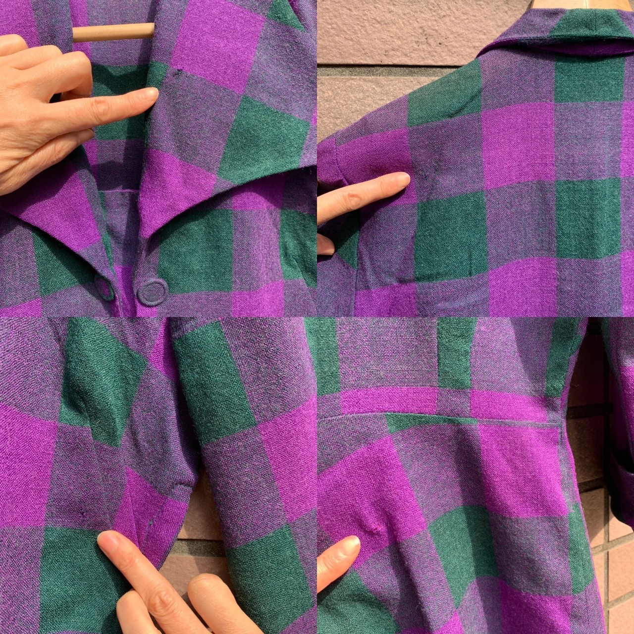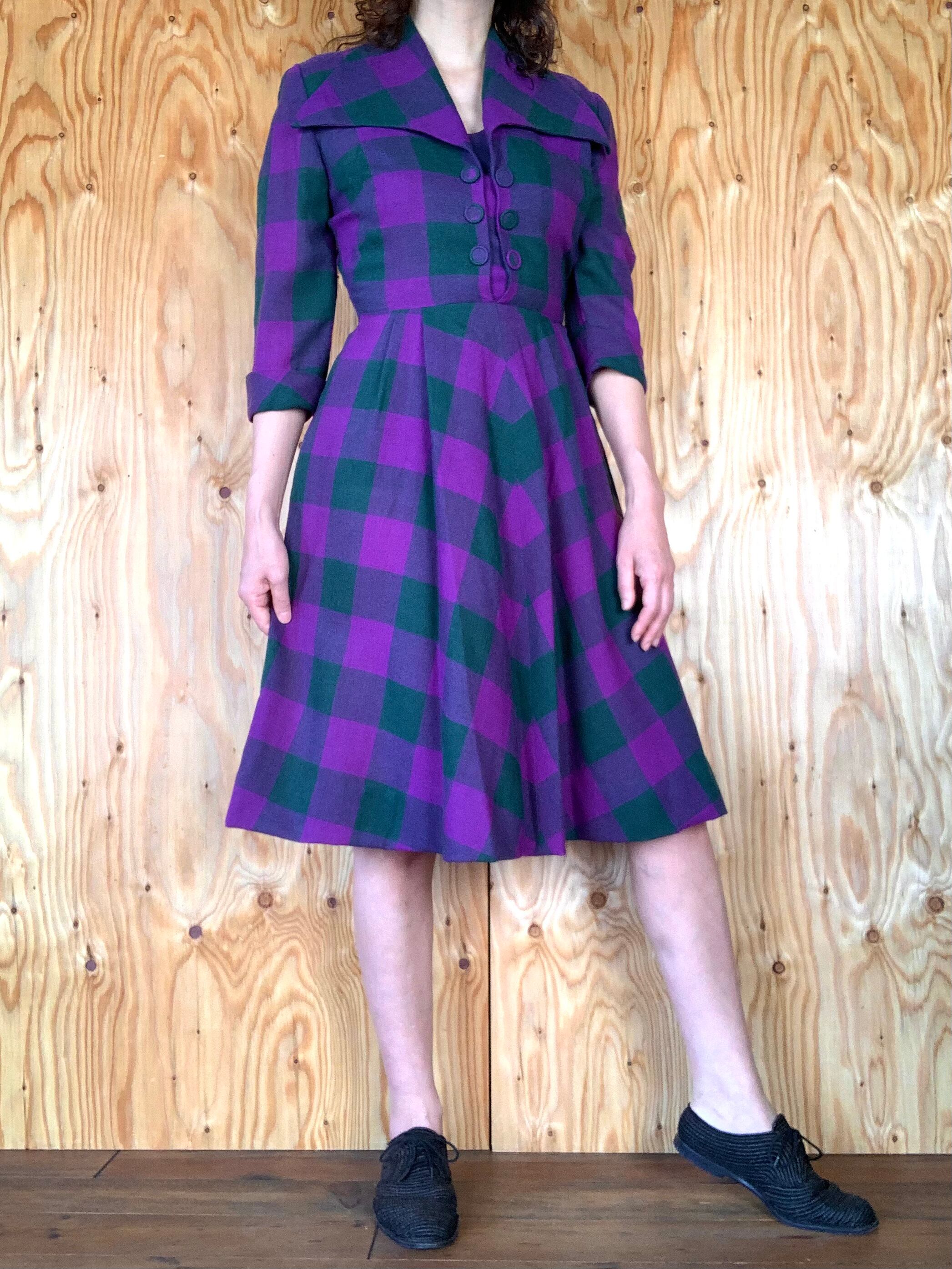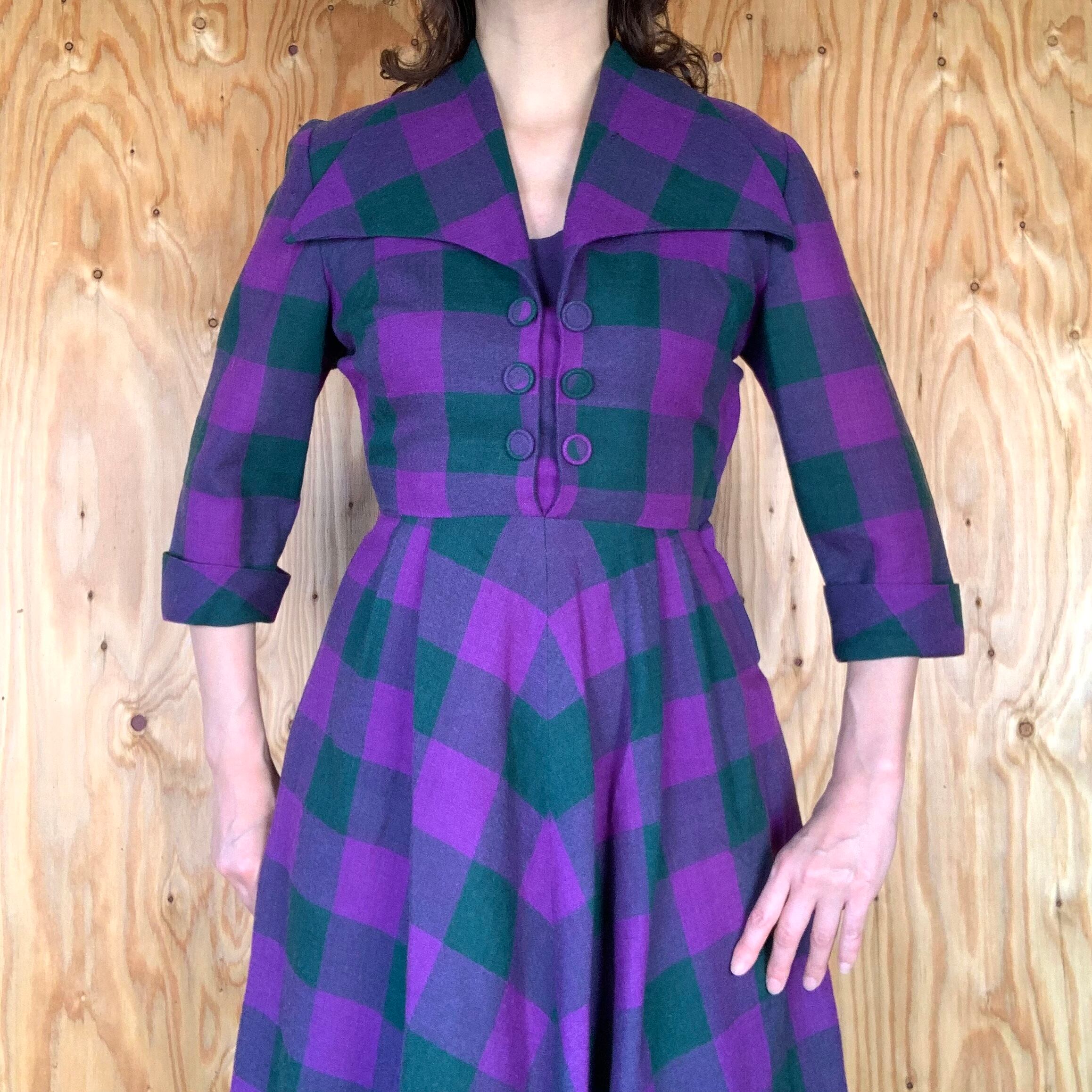 パープルとモスグリーンのチェック柄のウール素材。