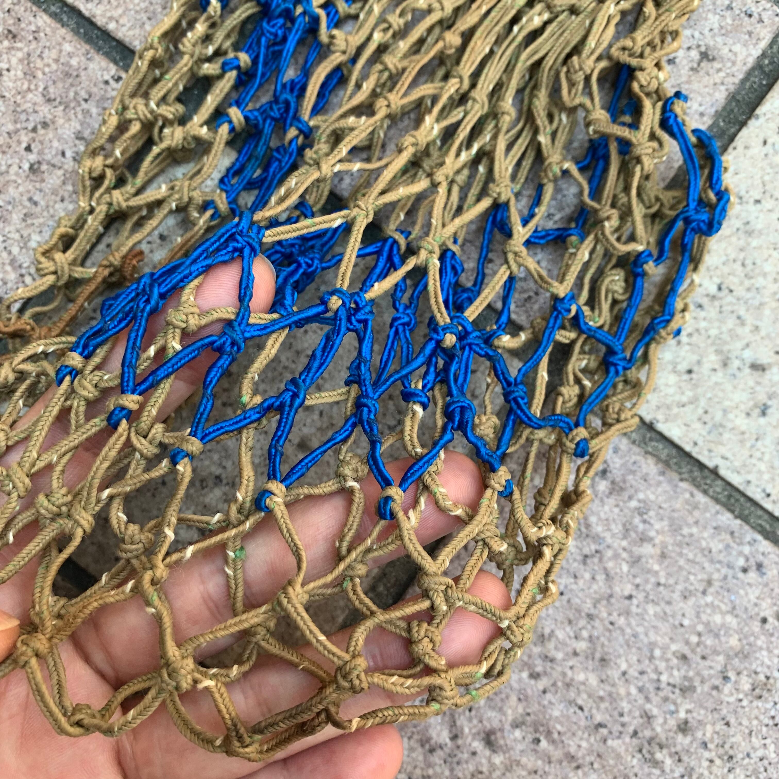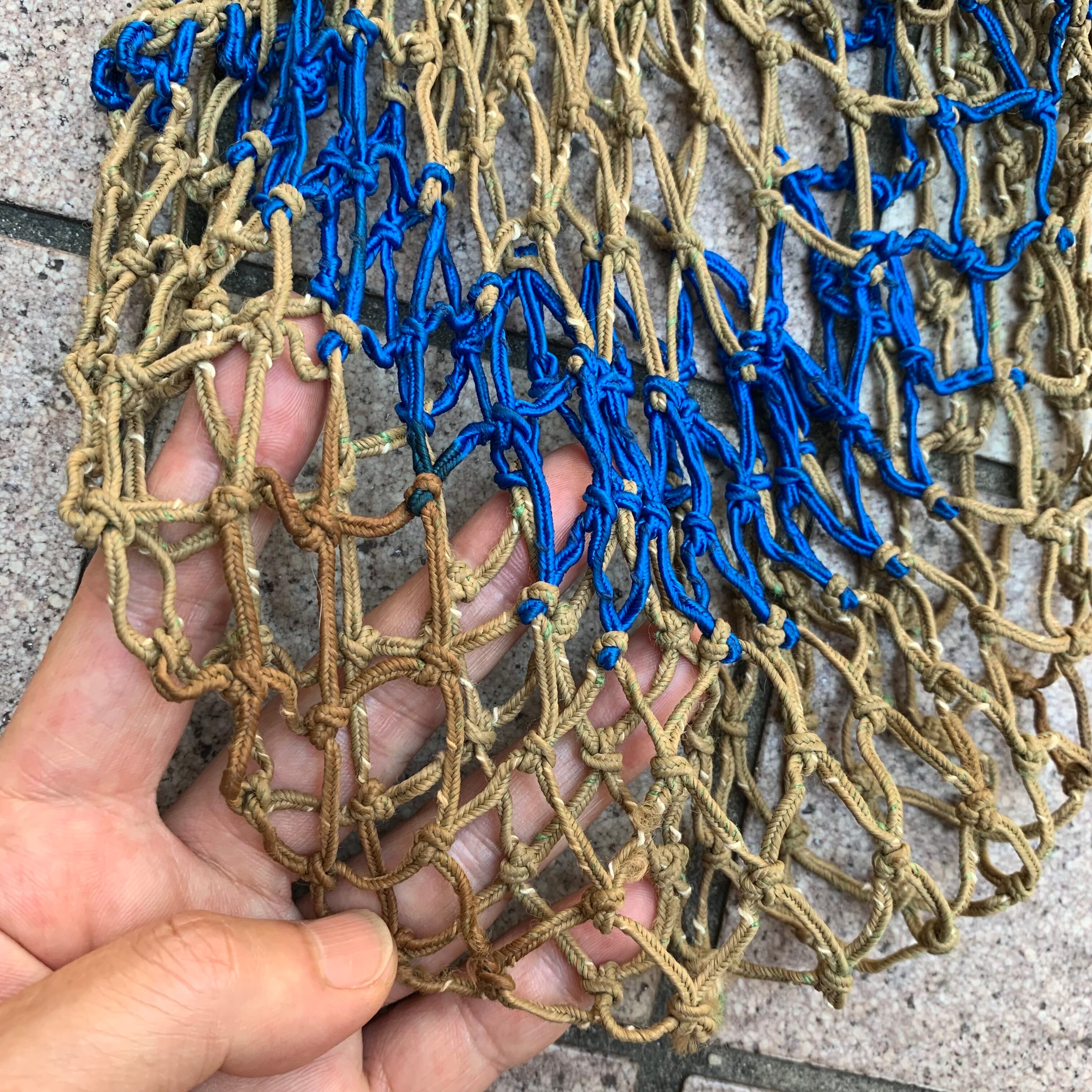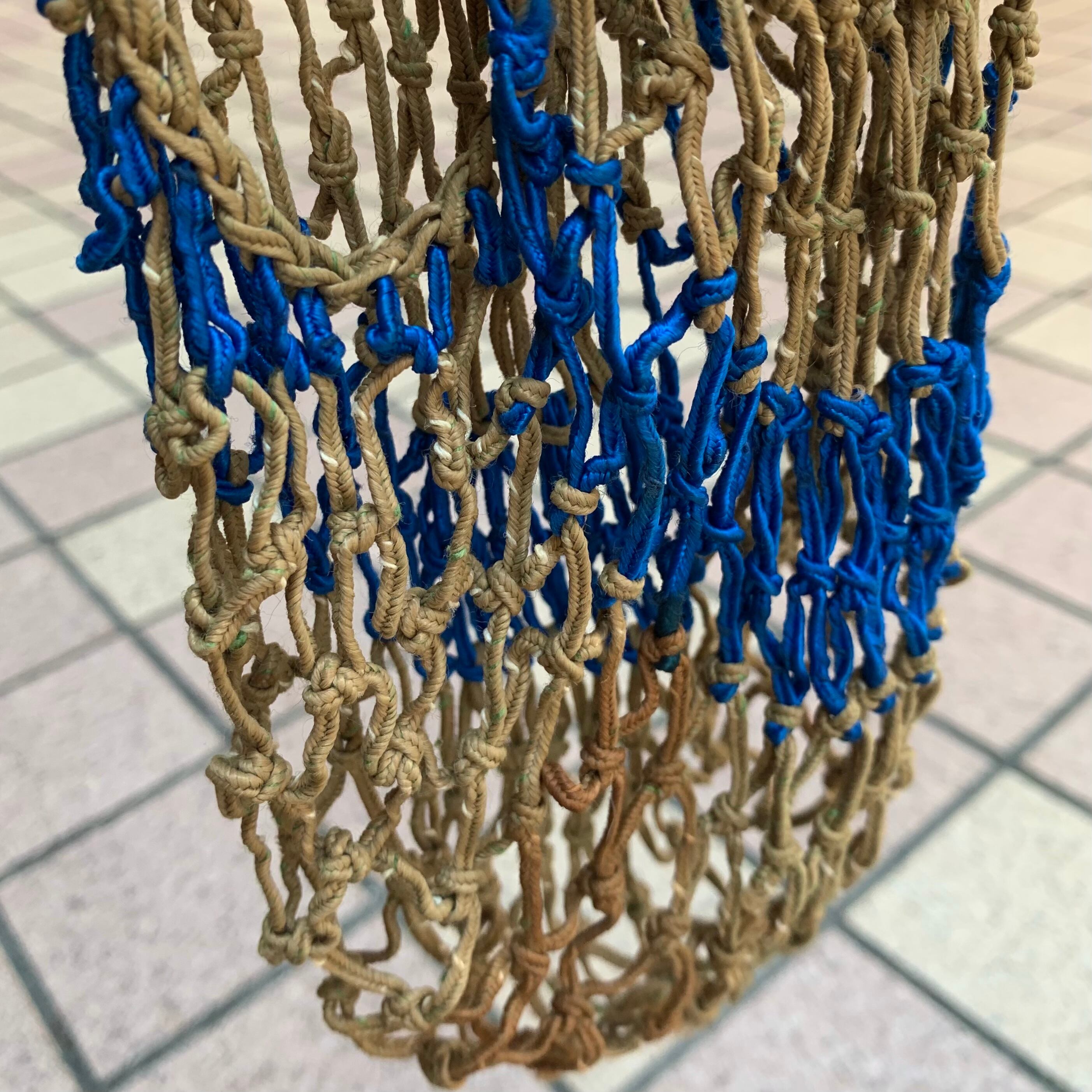 ベージュにブルーのしっかりとした紐で編まれたメッシュのボディ。
