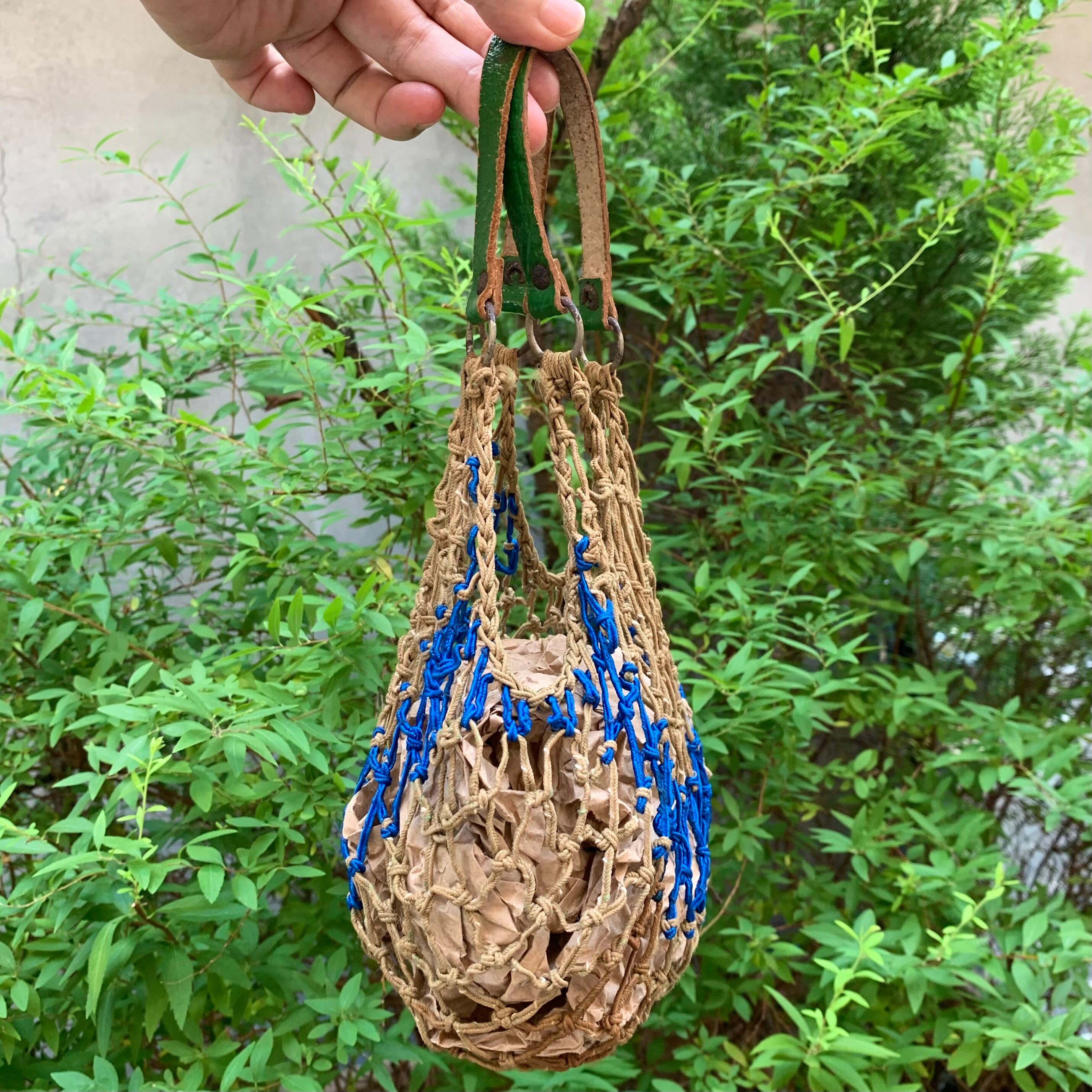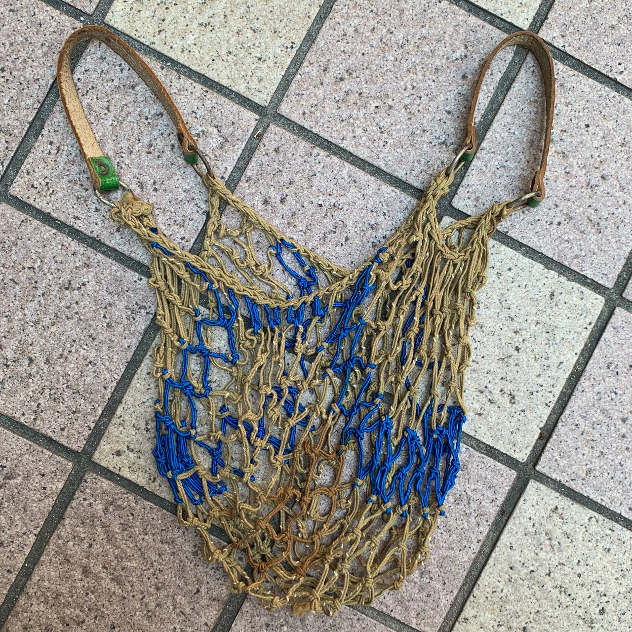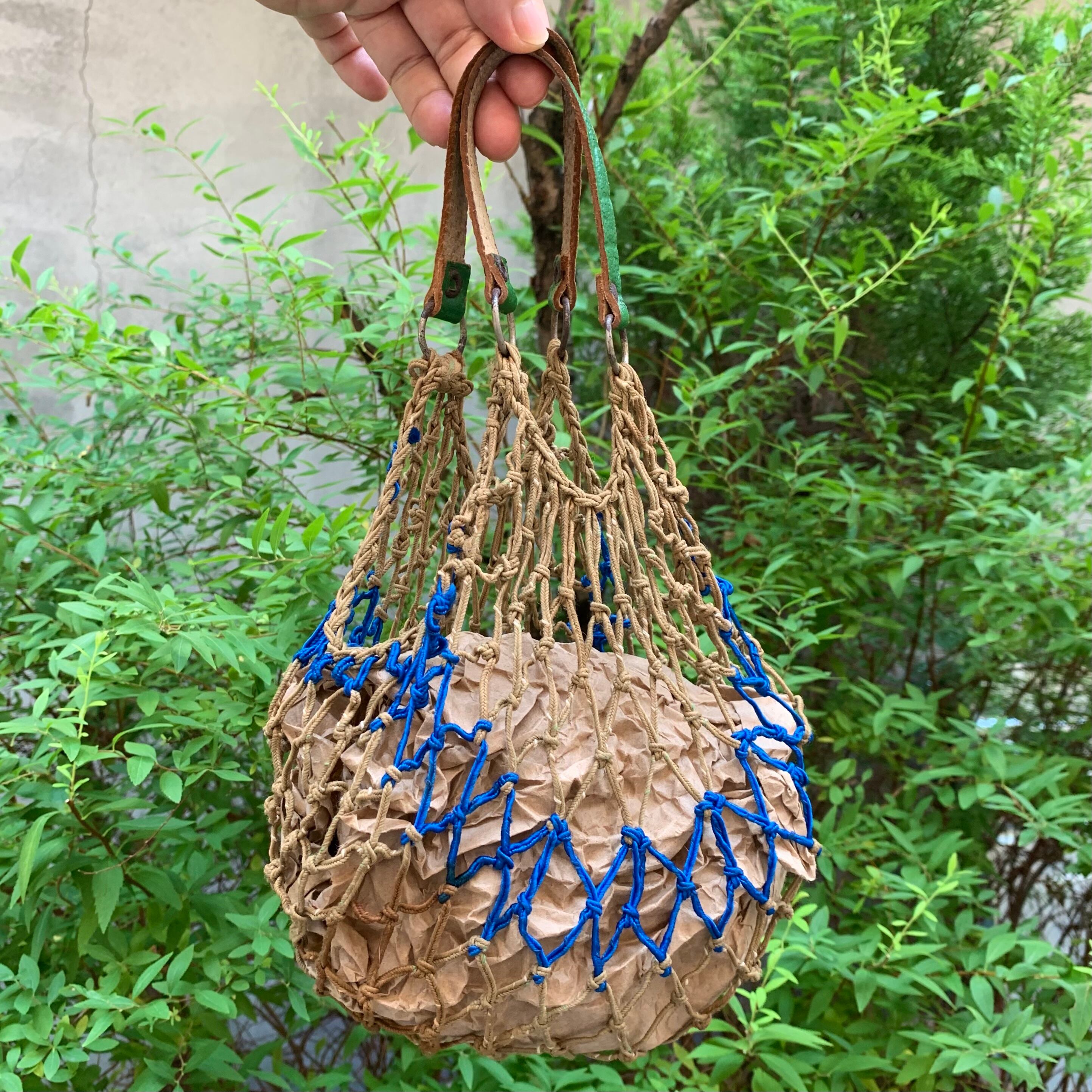 ベージュにブルーのしっかりとした紐で編まれたメッシュのボディ。