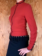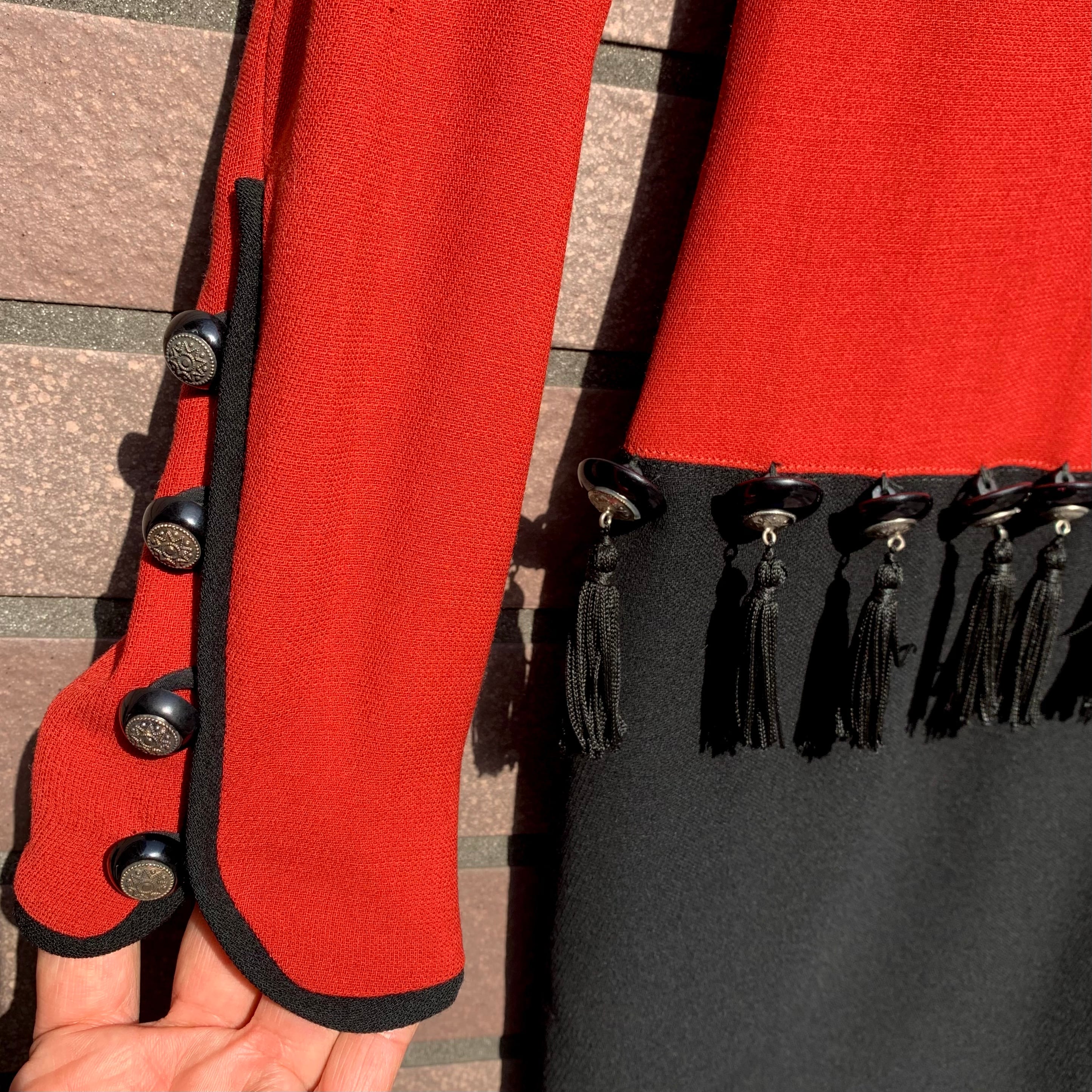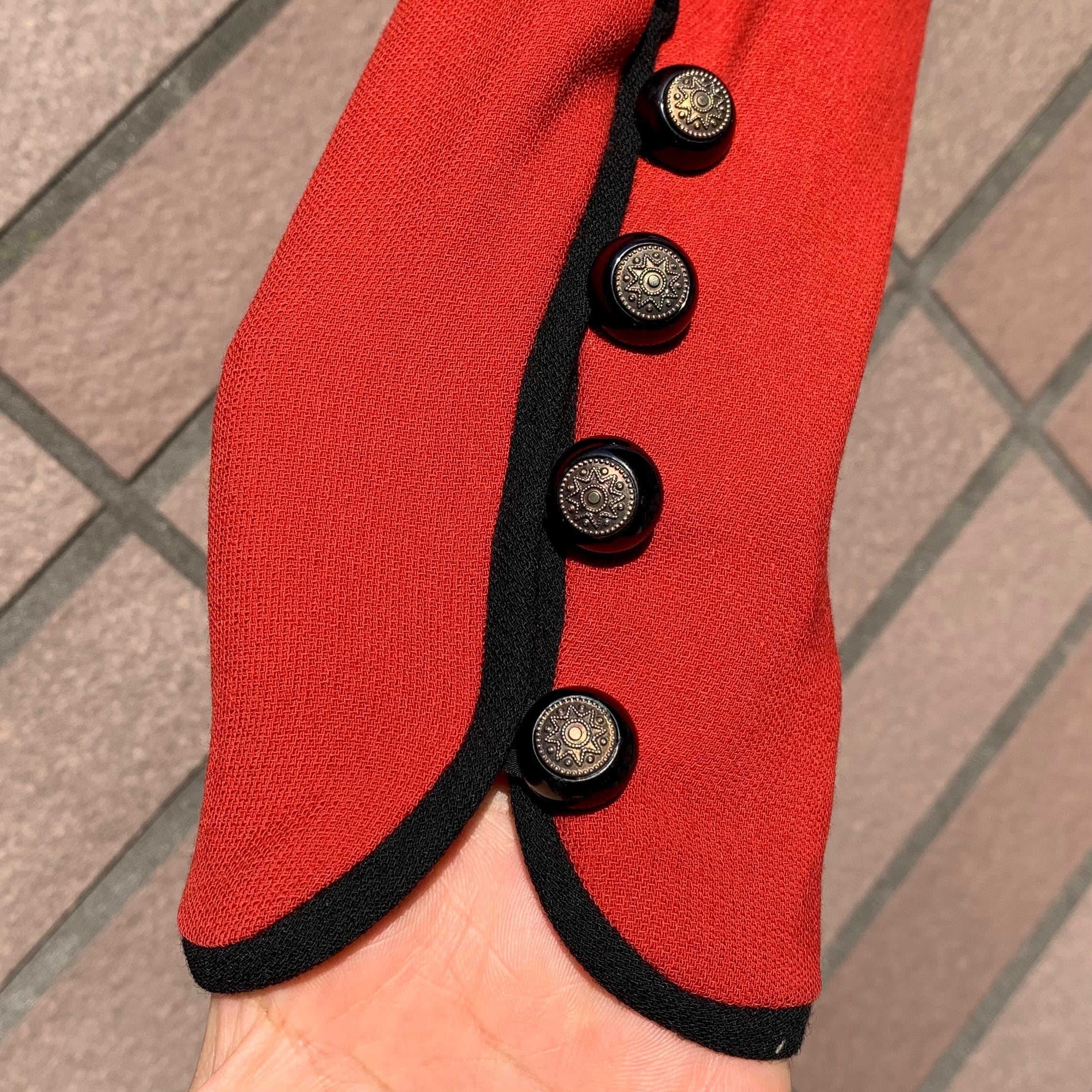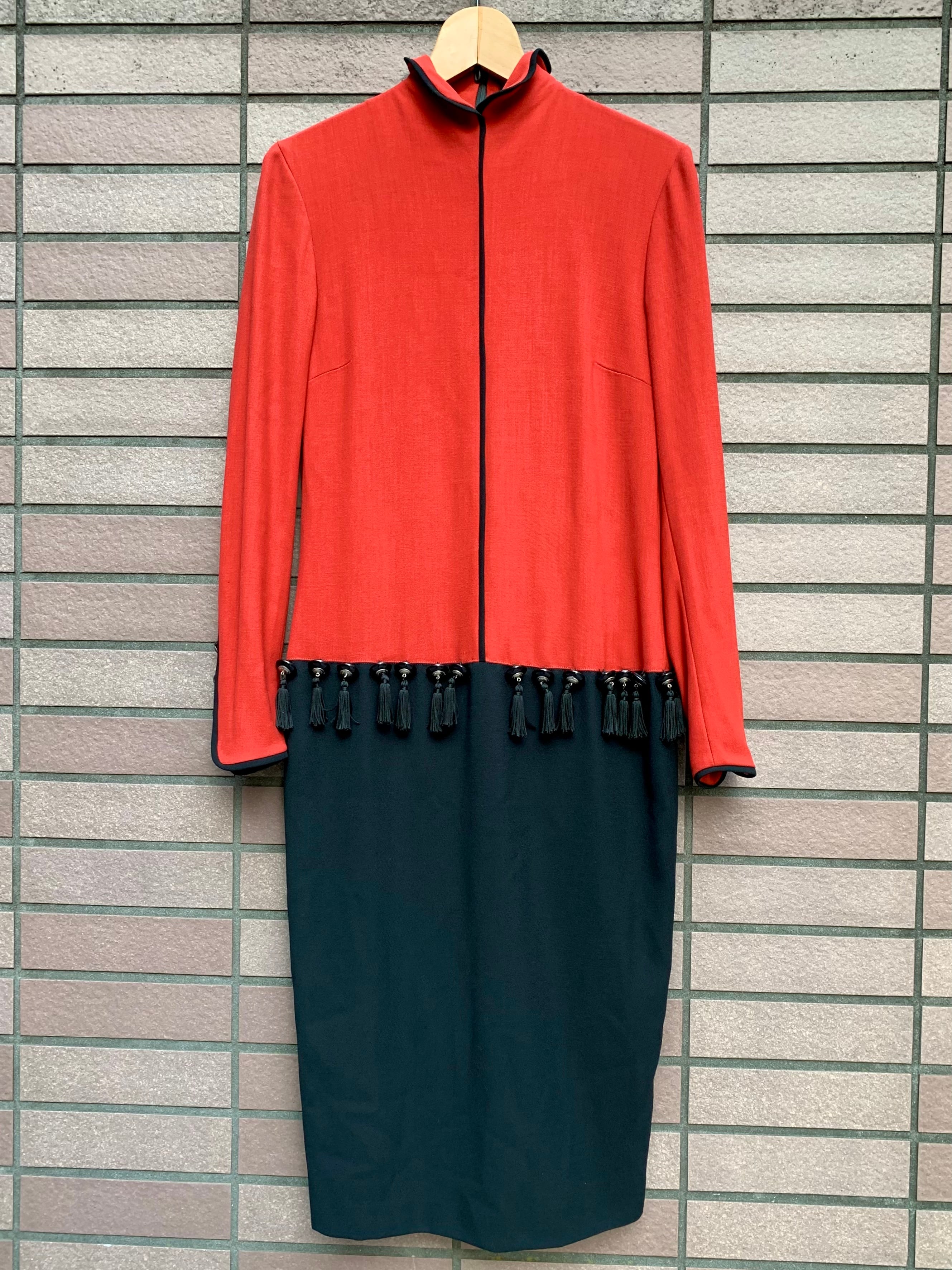 ローウエストの切り替えで、ウエスト部分にはタッセル付きのボタン。