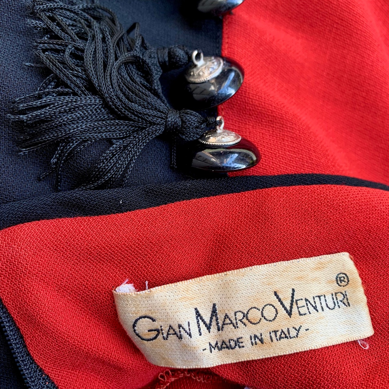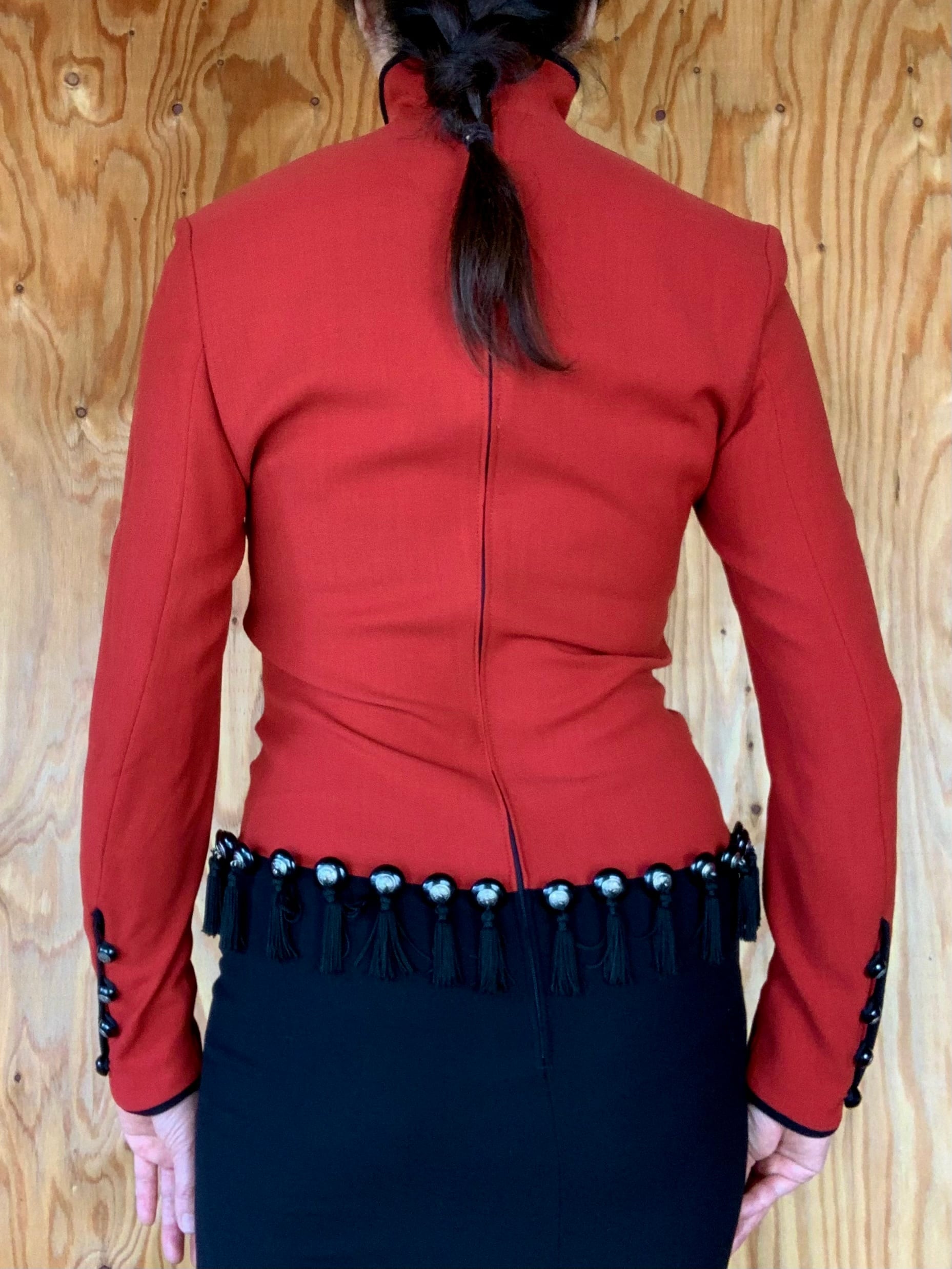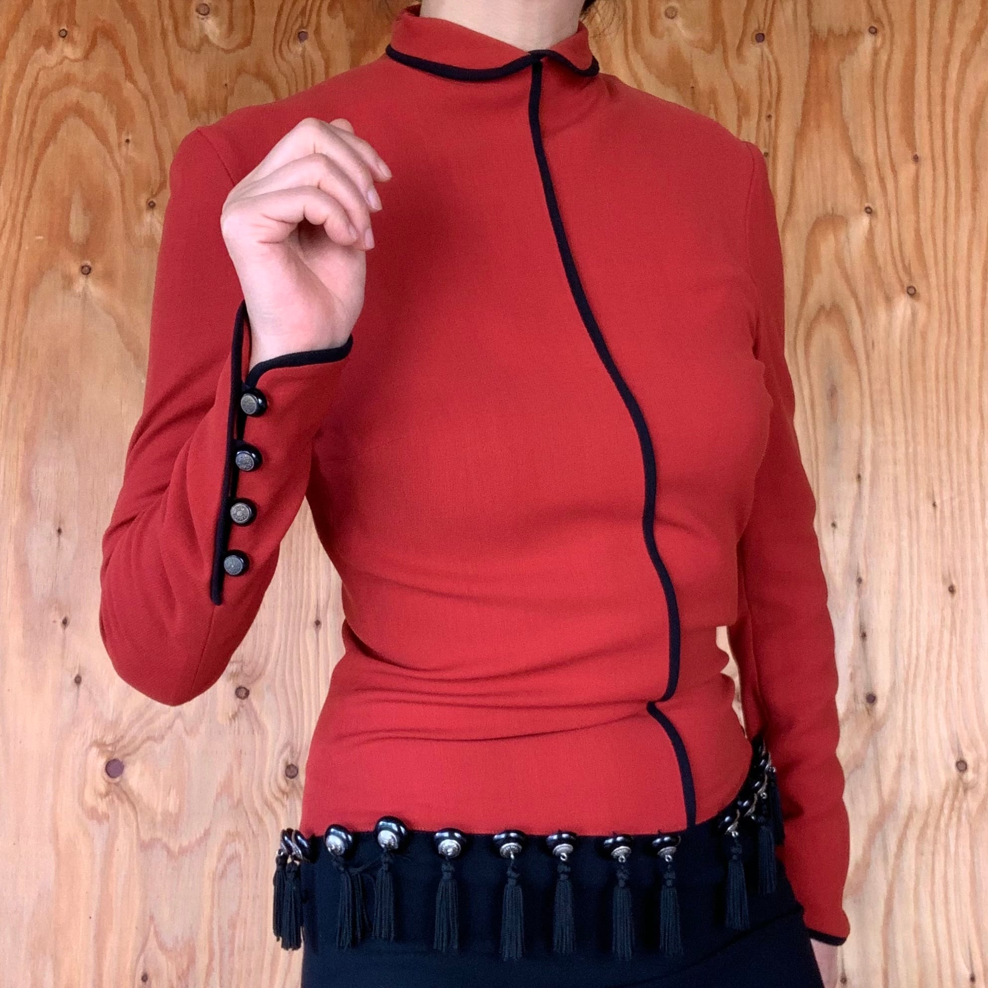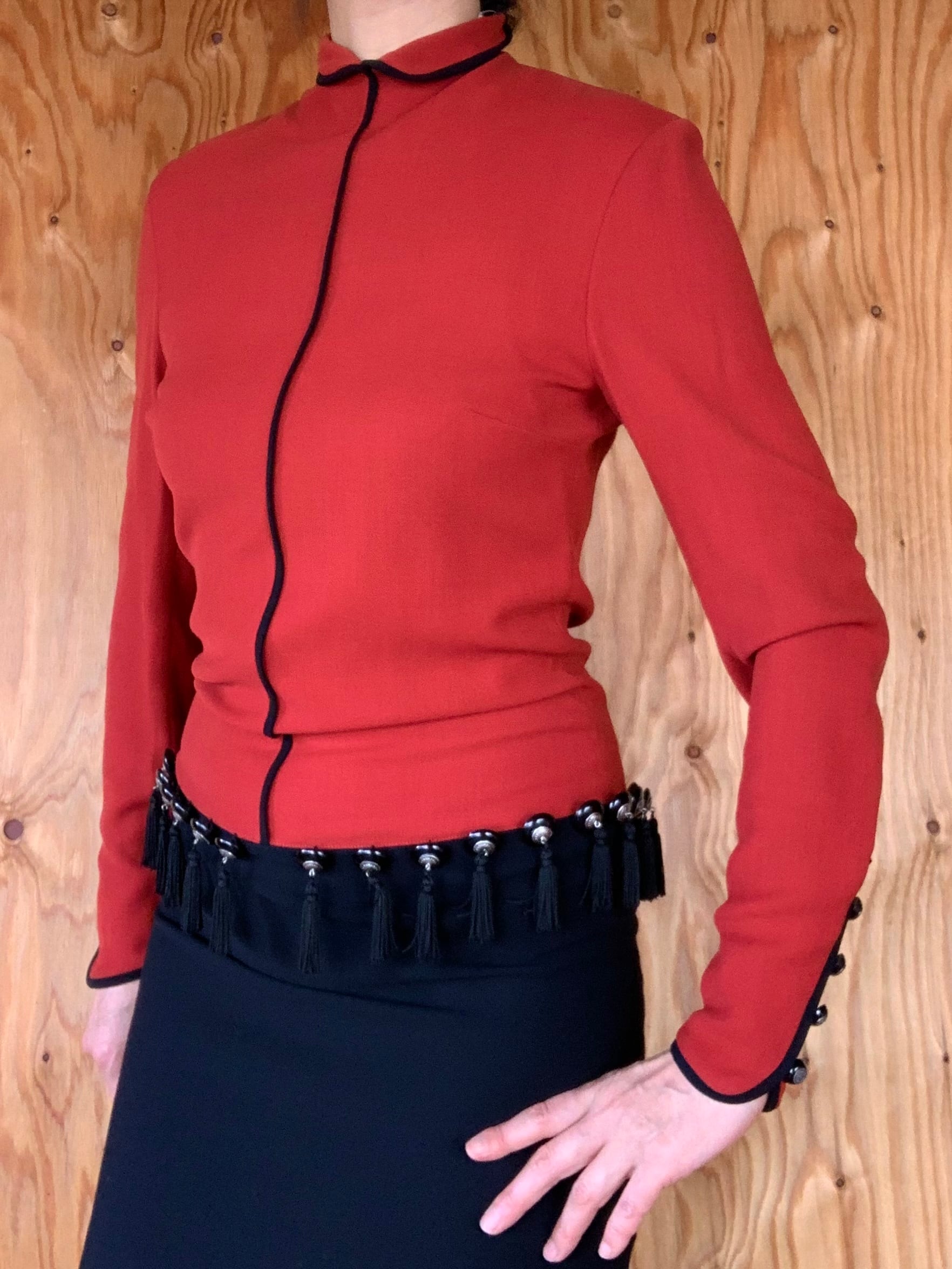ローウエストの切り替えで、ウエスト部分にはタッセル付きのボタン。