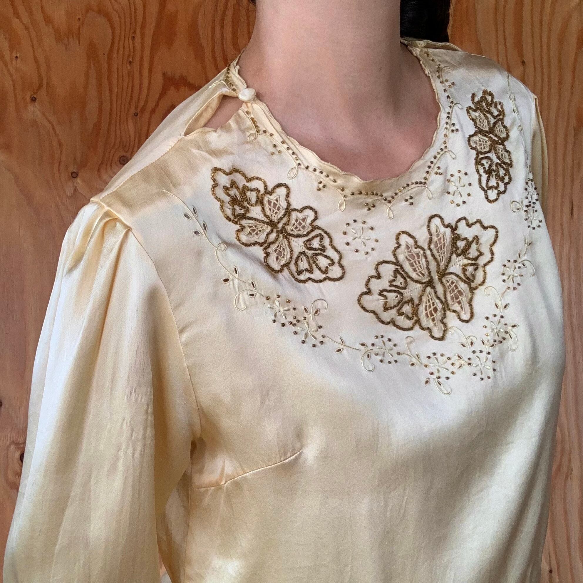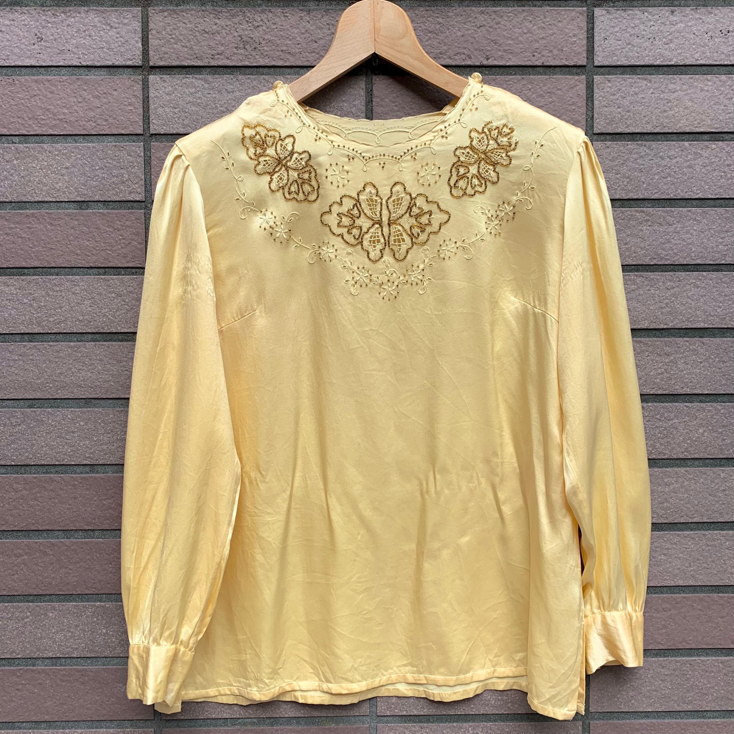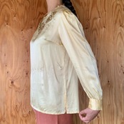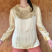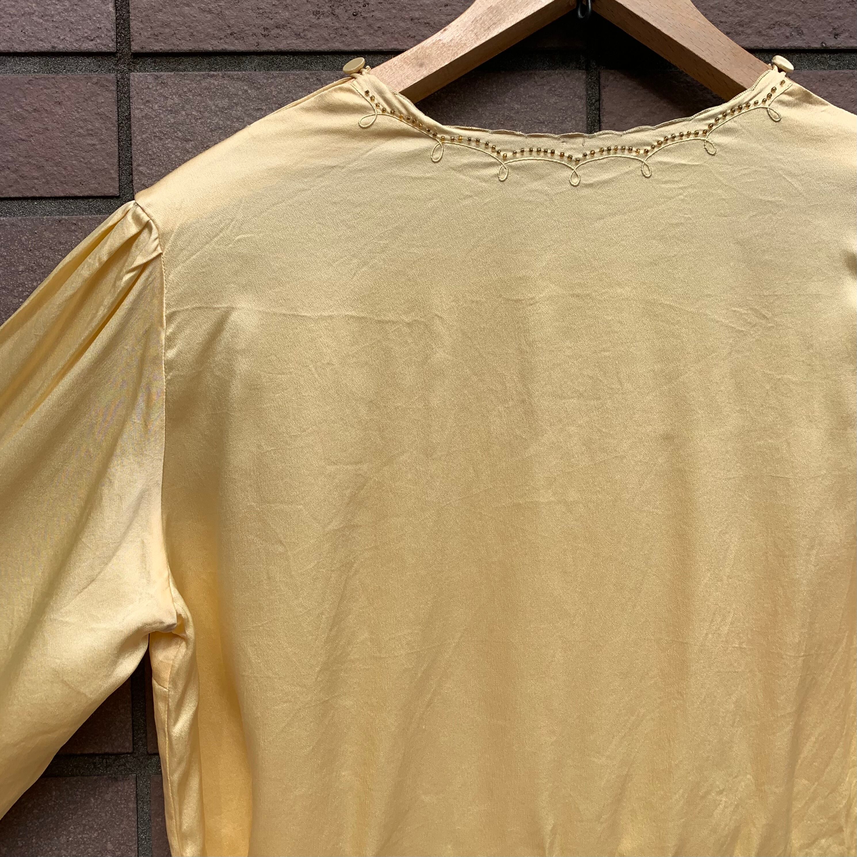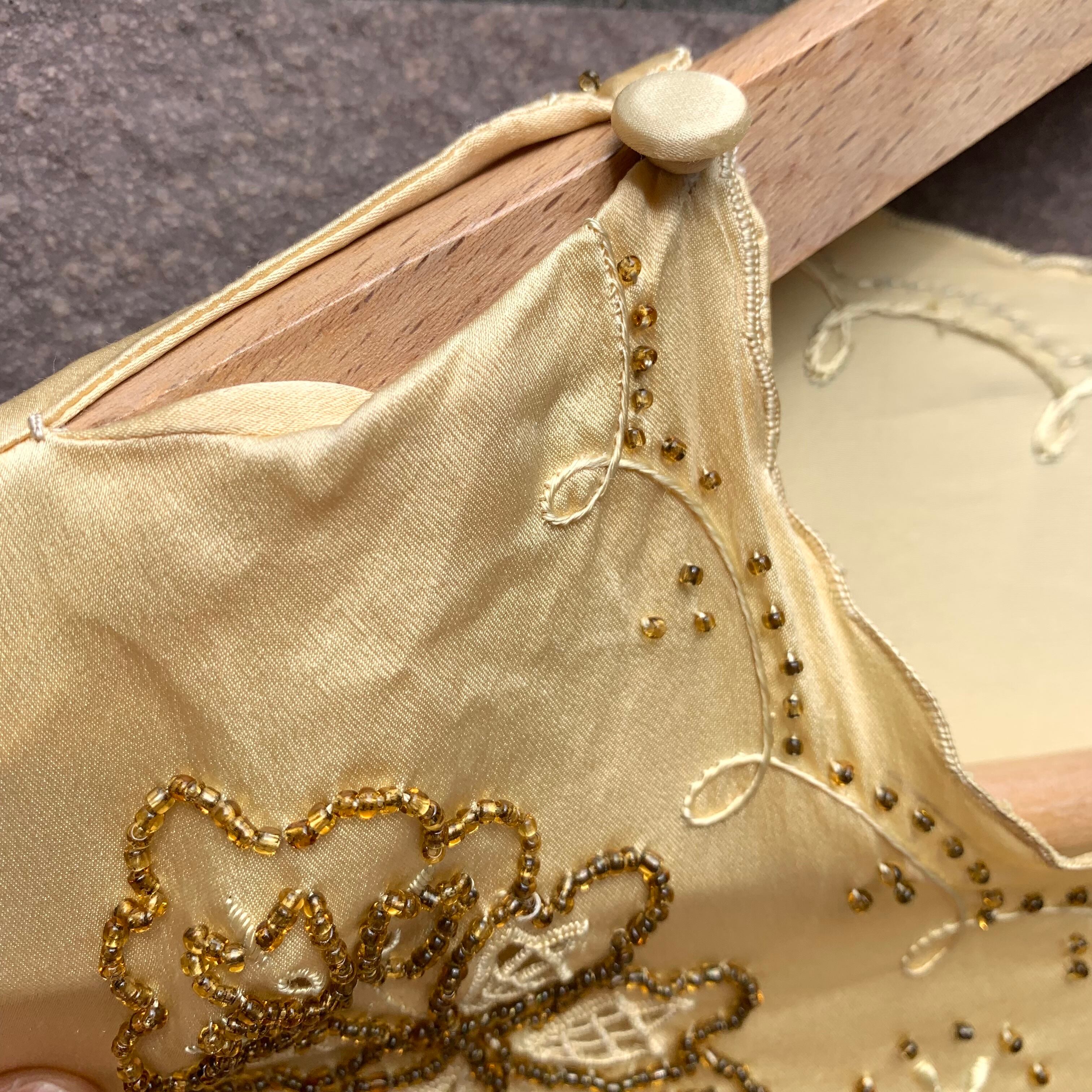 胸元は、イエローゴールドのビーズ刺繍と繊細な透かしになっています。