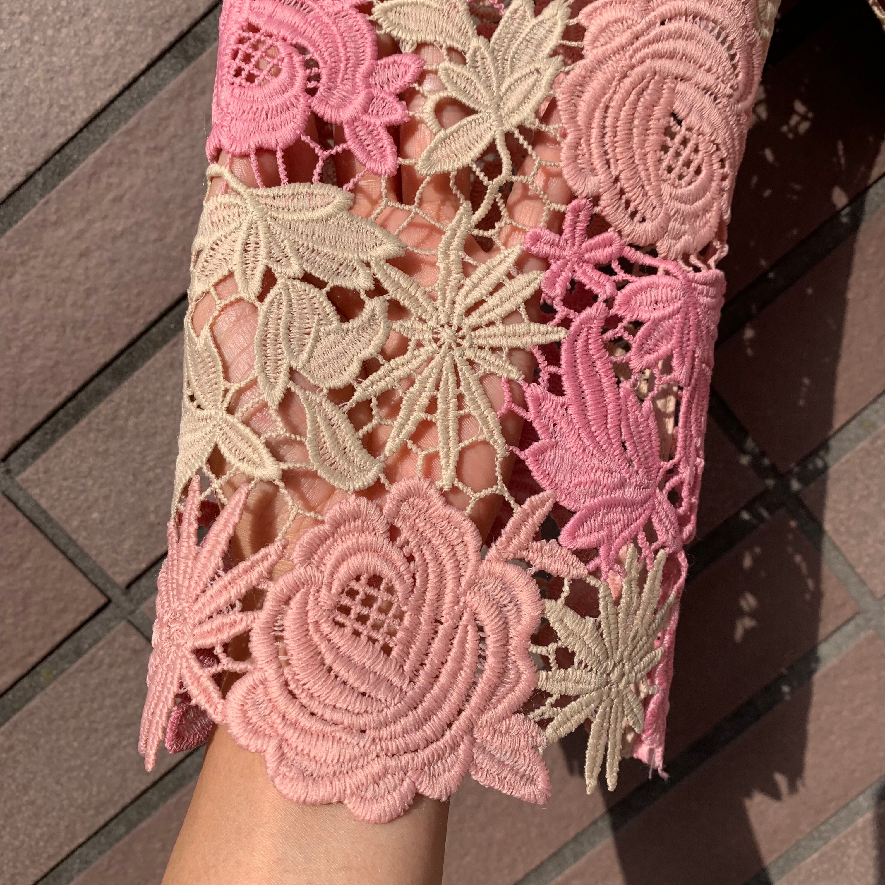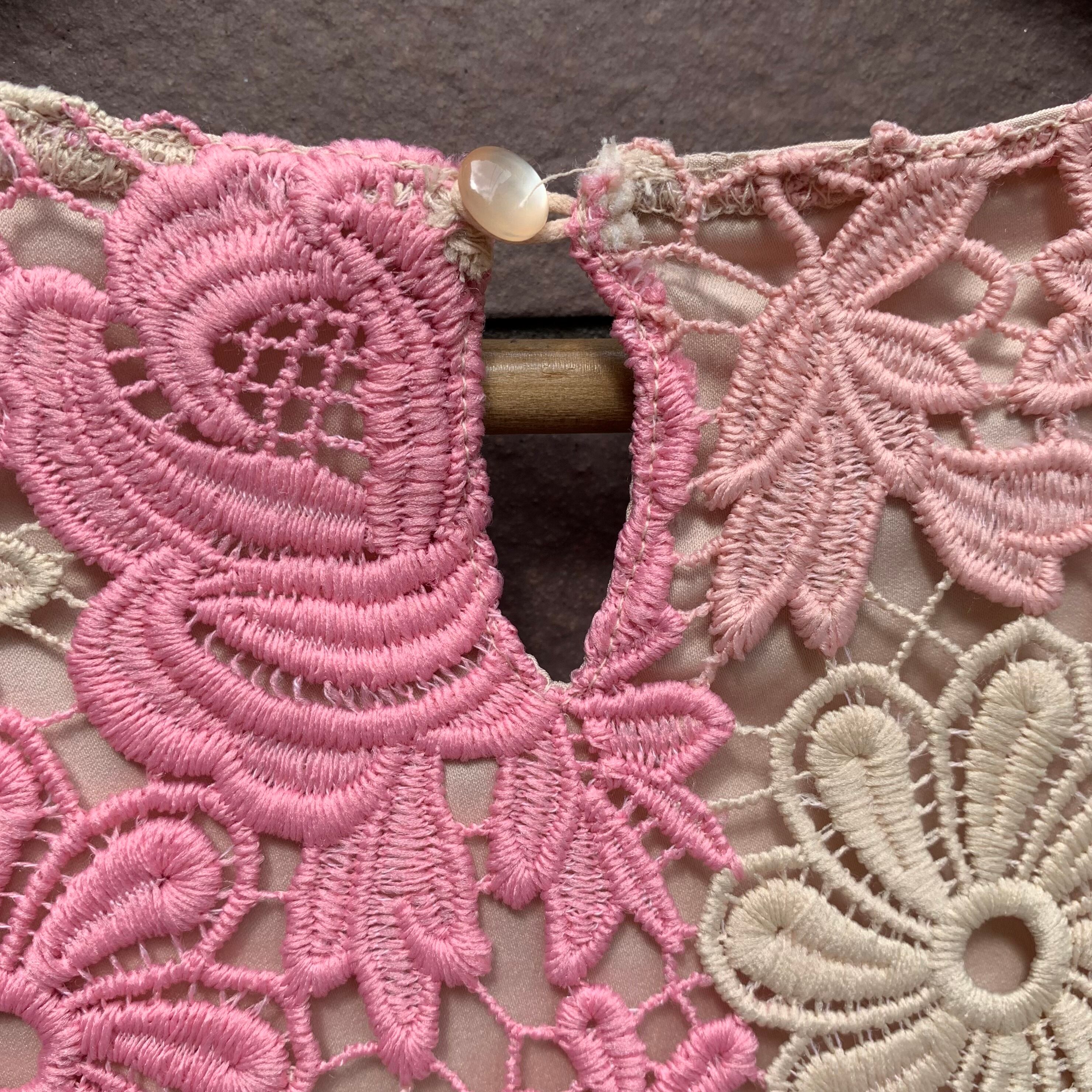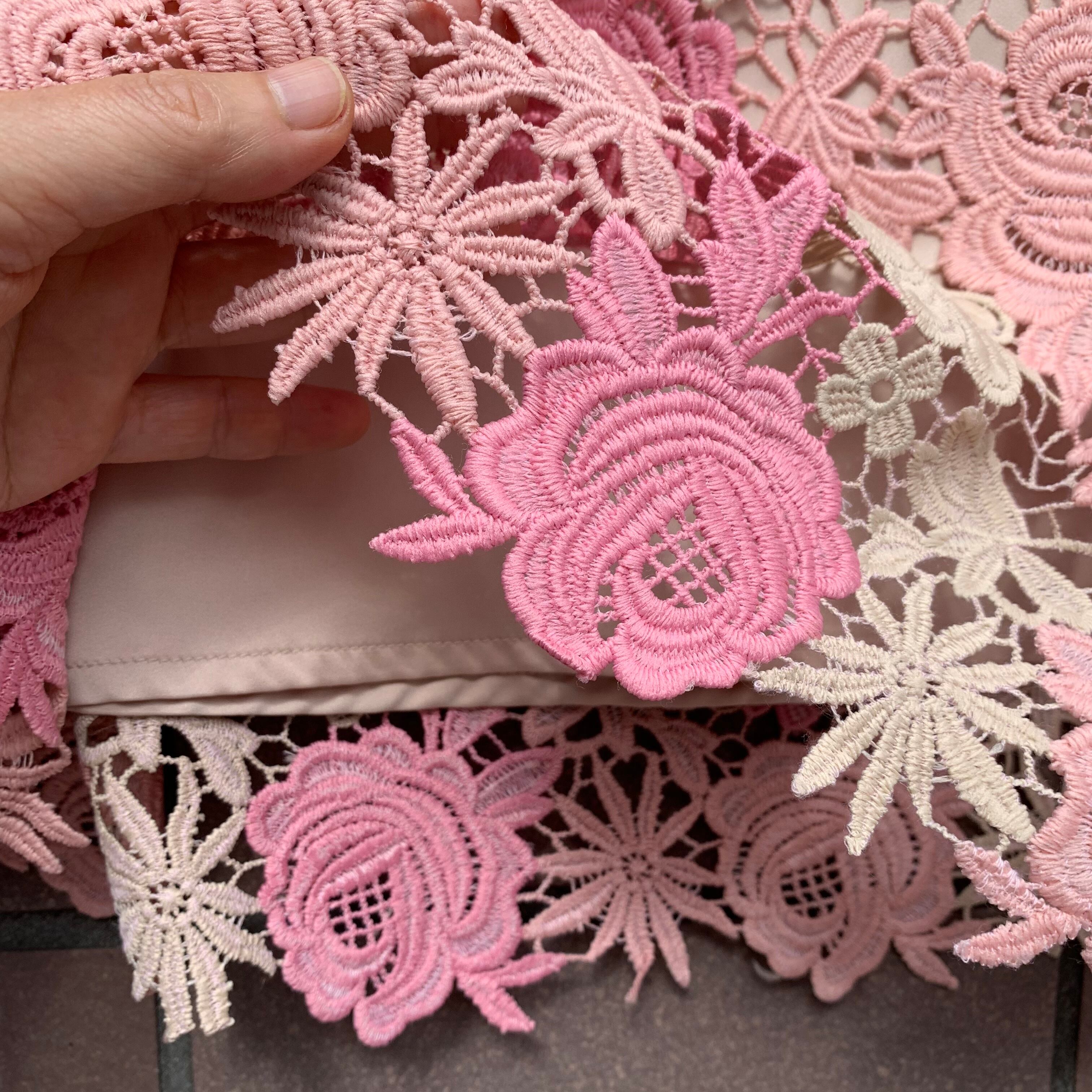 透かしのピンクとアイボリーの花のレース編み。