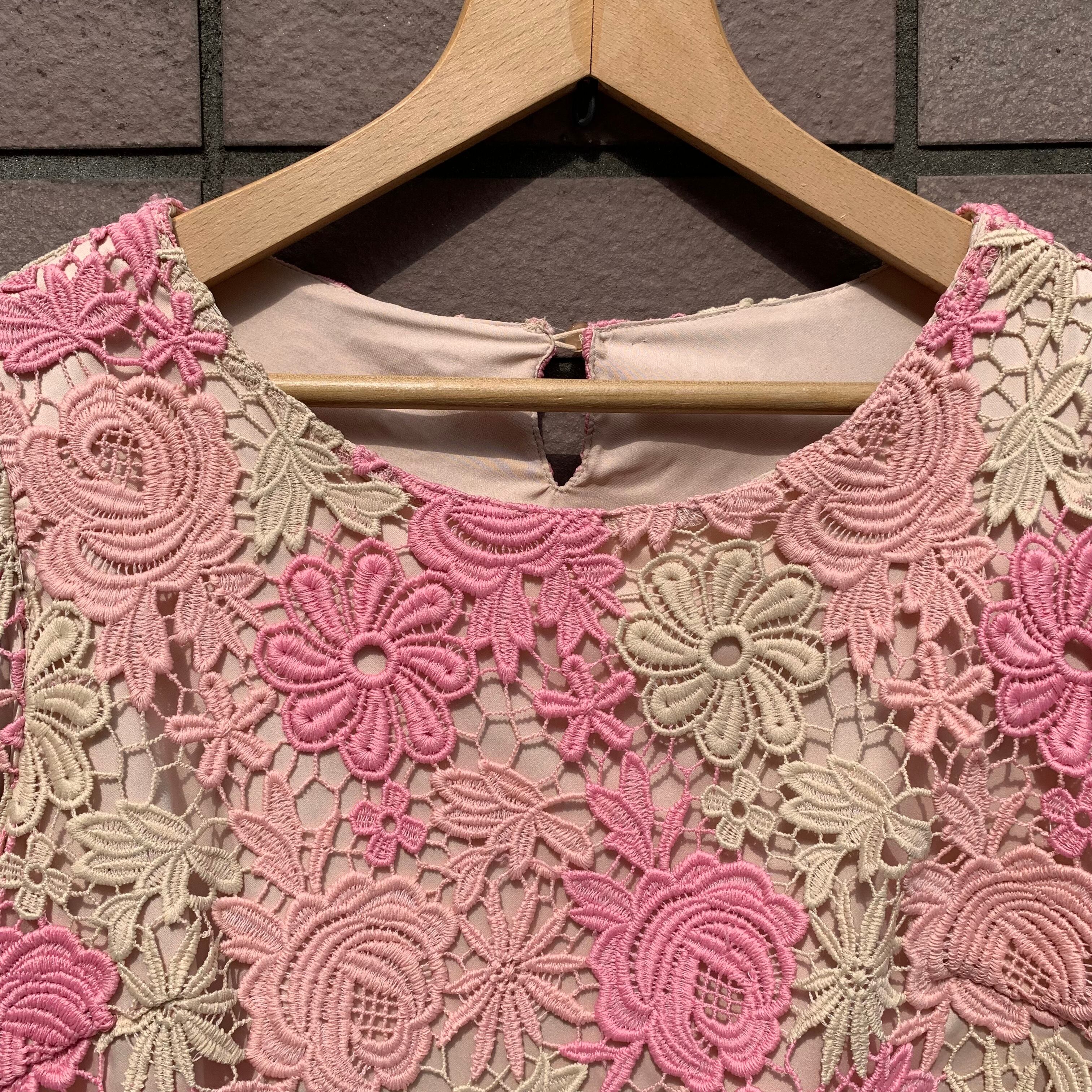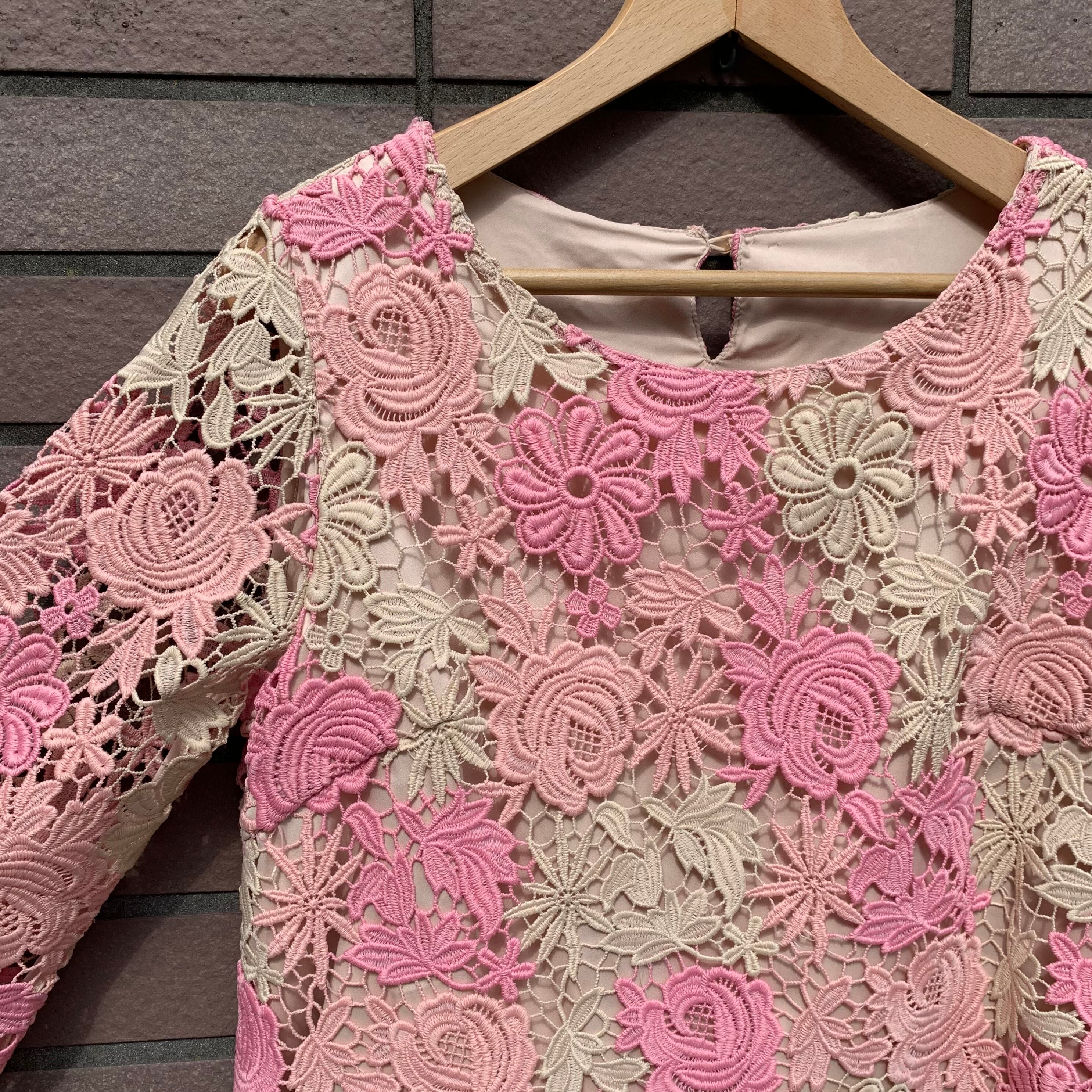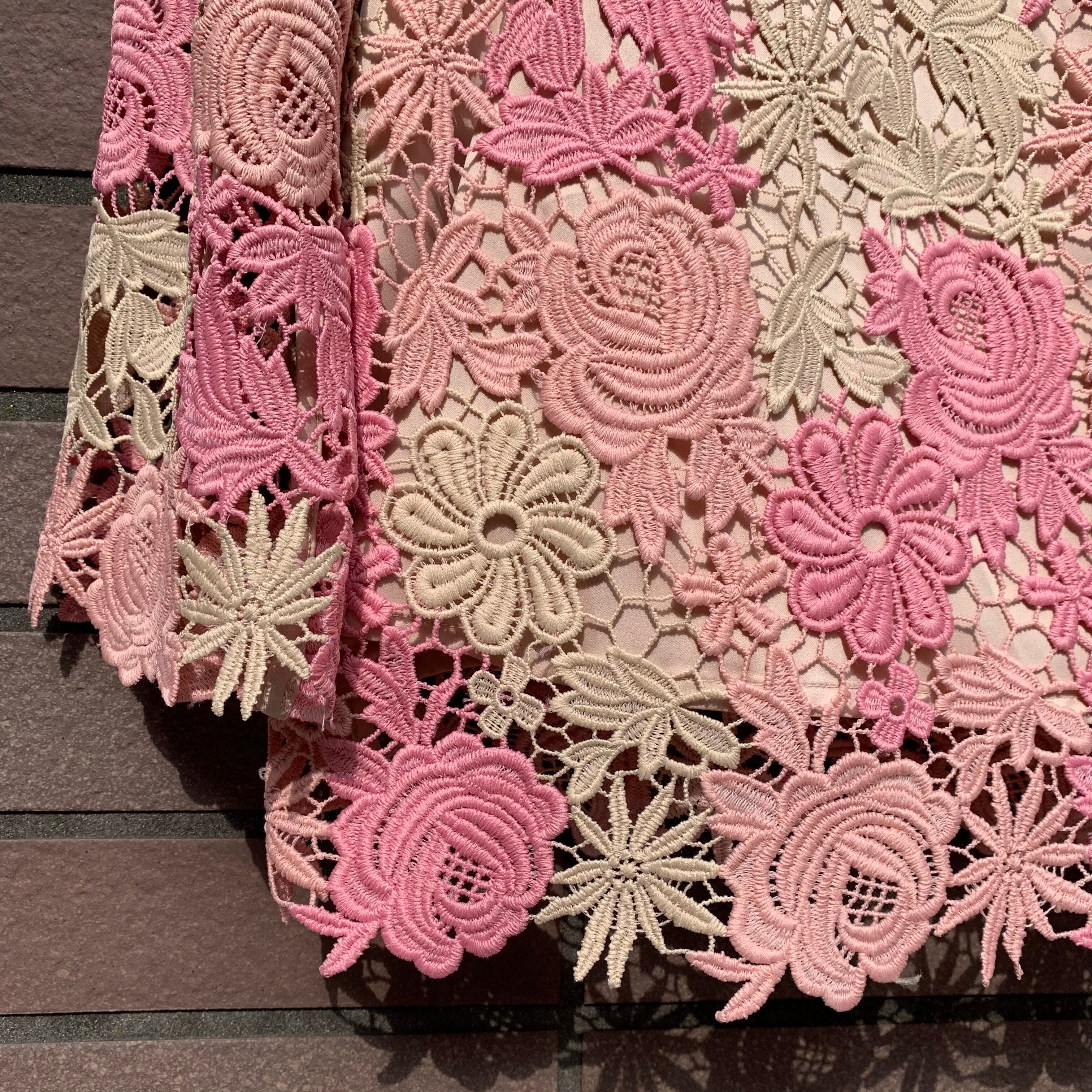 透かしのピンクとアイボリーの花のレース編み。
